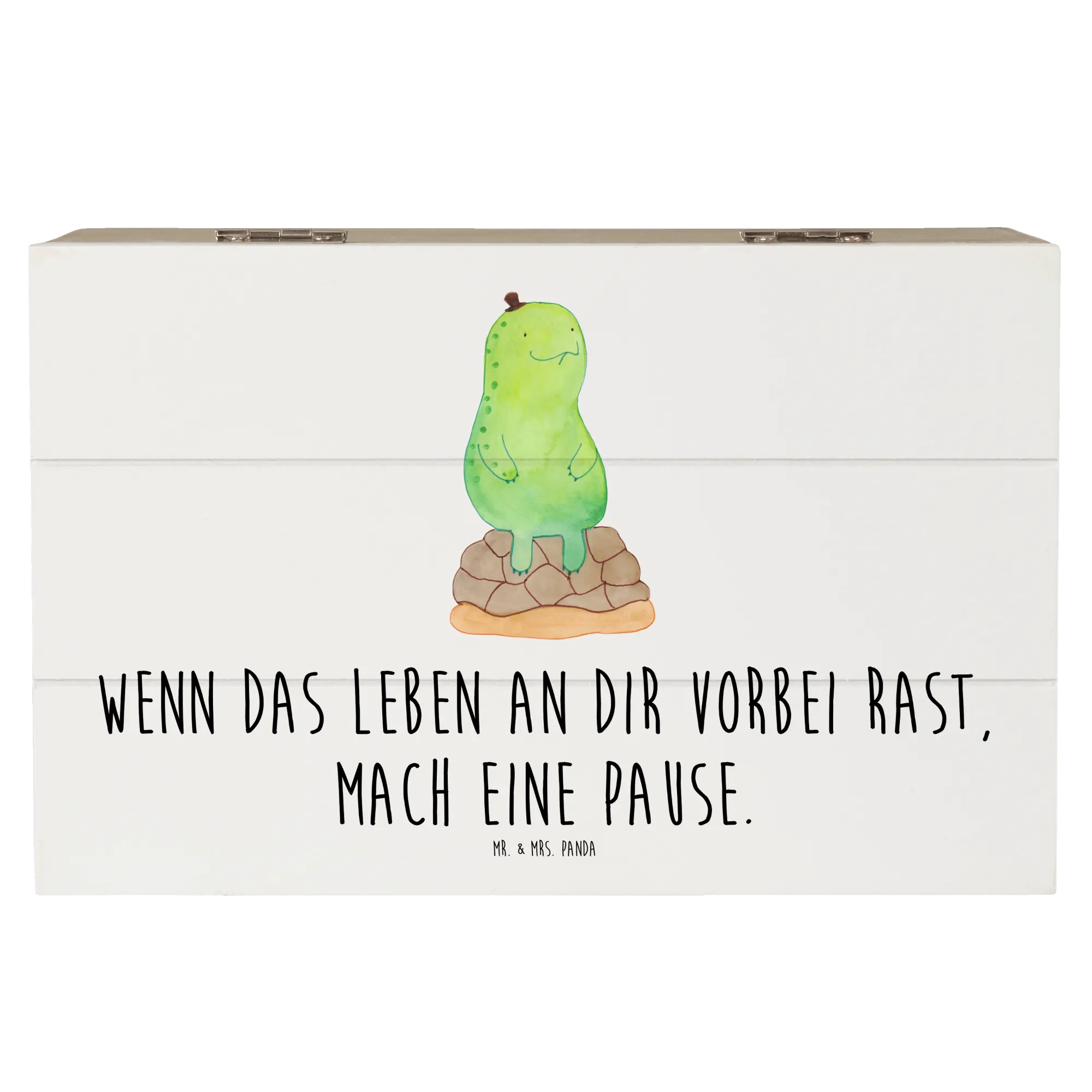 Entdecke die zauberhafte Holzkiste mit dem Motiv "Schildkröte pausiert" von Mr. & Mrs. Panda – ein perfektes Geschenk für all jene, die eine kleine Auszeit vom hektischen Alltag brauchen. Diese wunderschöne Kiste ist nicht nur praktisch, sondern auch ein echter Hingucker in jedem Raum.
