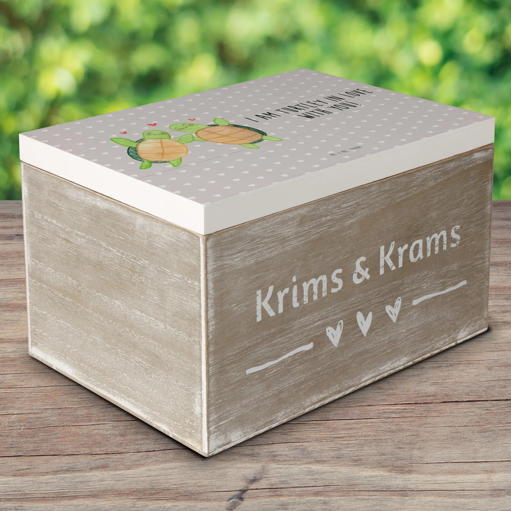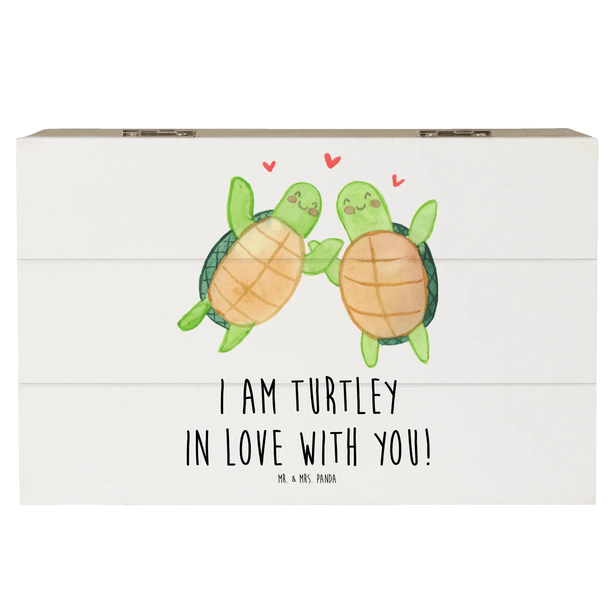 Eine liebevolle Holzkiste von Mr. & Mrs. Panda – bedruckt mit dem bezaubernden Schildkröten Paar aus der Kollektion Liebe. Die beiden Schildkröten schauen sich verliebt an, kleine rote Herzen schweben über ihnen, und der freche Spruch „I am turtley