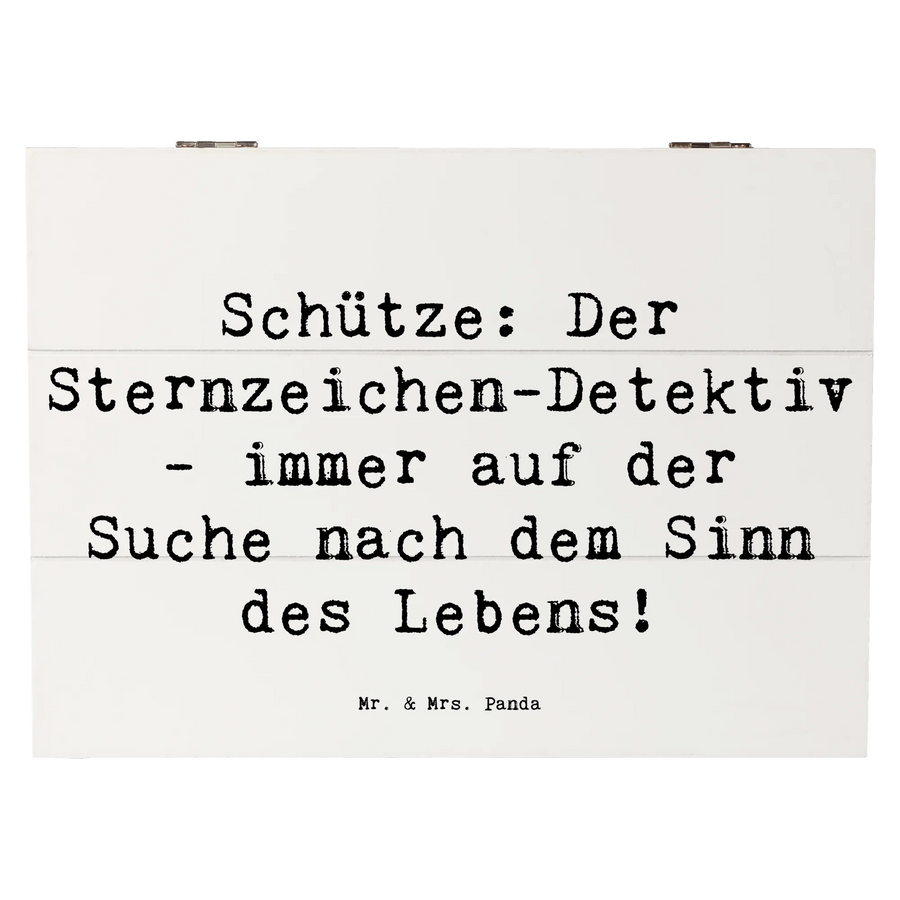 Entdecke die wundervolle Holzkiste von Mr. & Mrs. Panda, die nicht nur ein idealer Aufbewahrungsort für deine Schätze ist, sondern auch ein zauberhaftes Geschenk für jeden Schützen und Astrologie-Liebhaber. Diese spezielle Kiste aus robuster Holzfaser ist bedruckt mit einem liebevollen Motiv, das das Sternzeichen Schütze repräsentiert. Der Spruch "Schütze: Der Sternzeichen-Detektiv - immer auf der Suche nach dem Sinn des Lebens!" strahlt eine positive Energie aus und bringt jeden zum Schmunzeln.