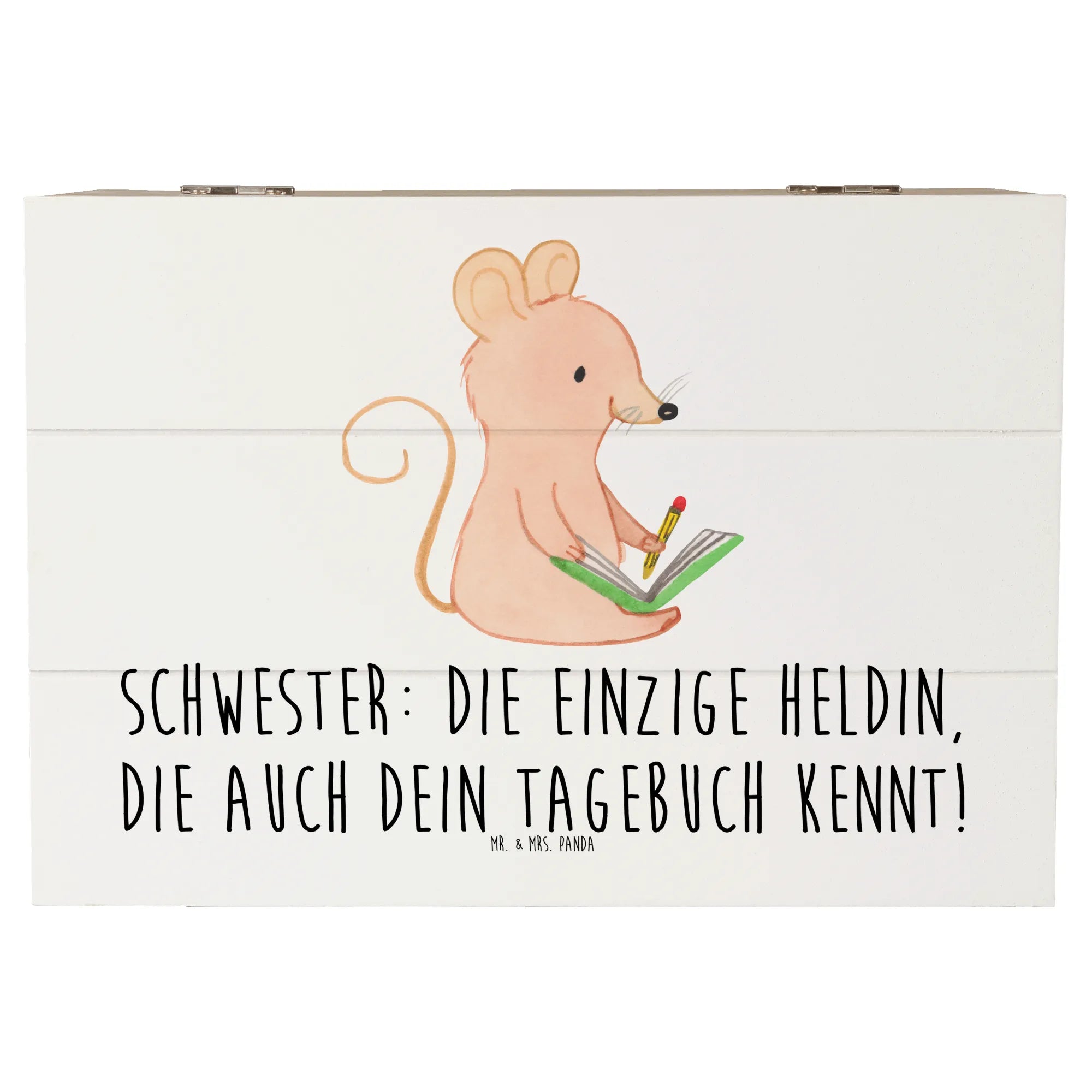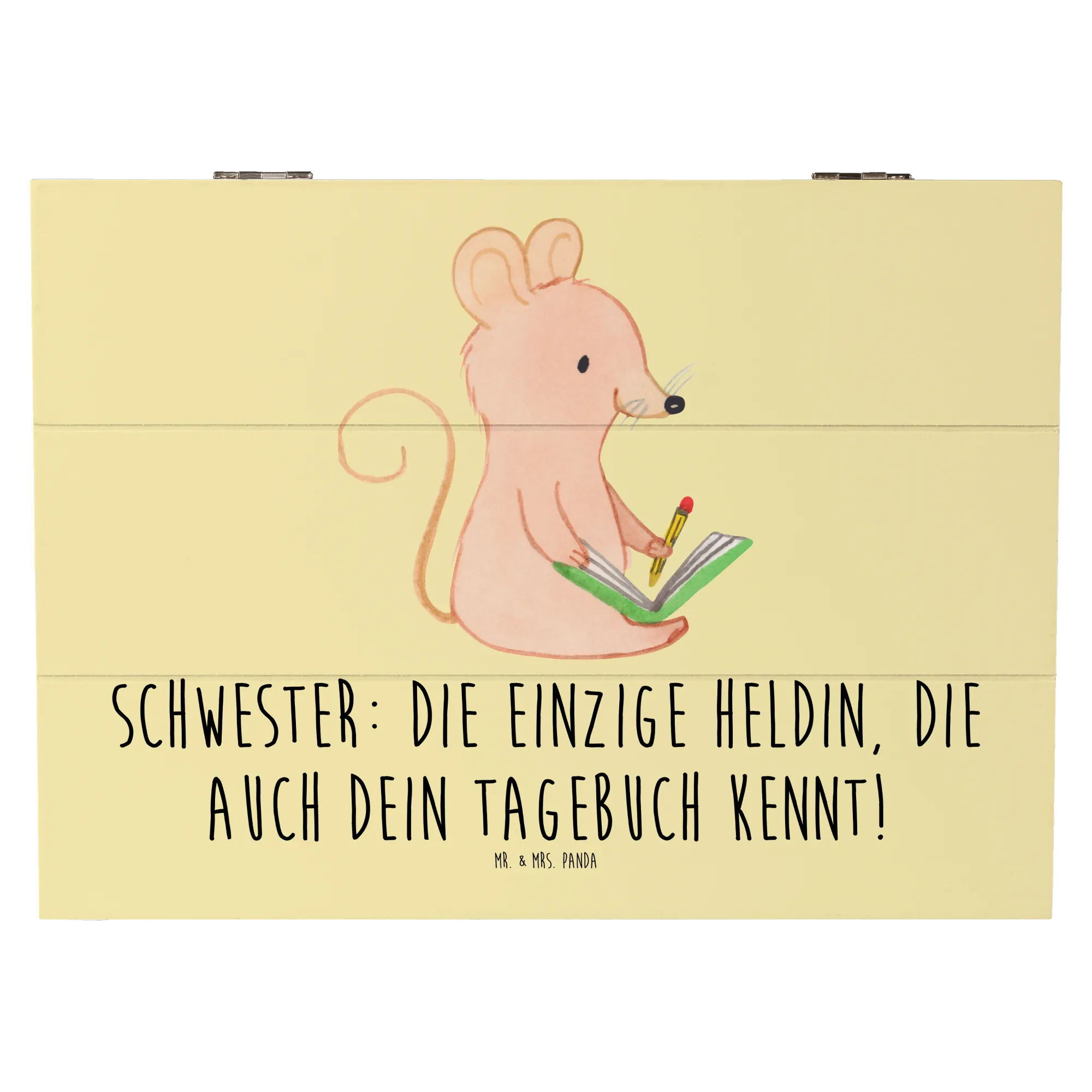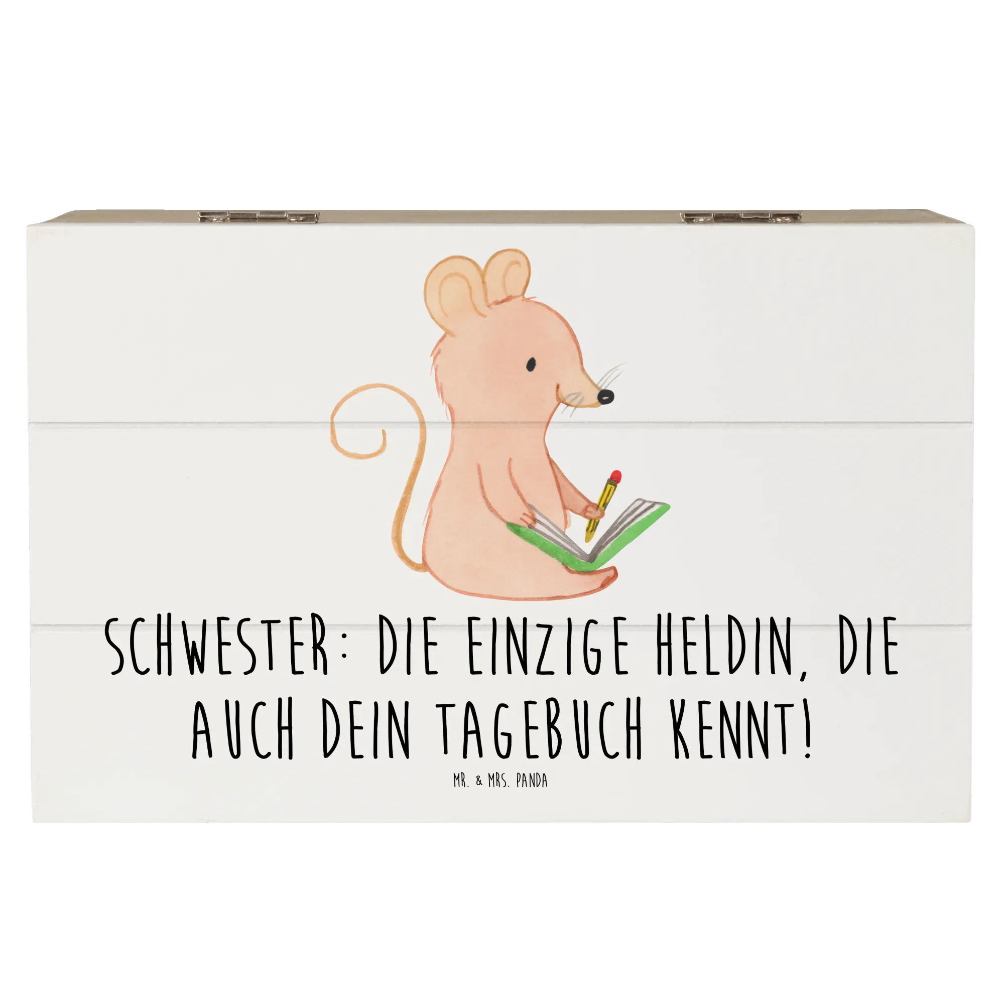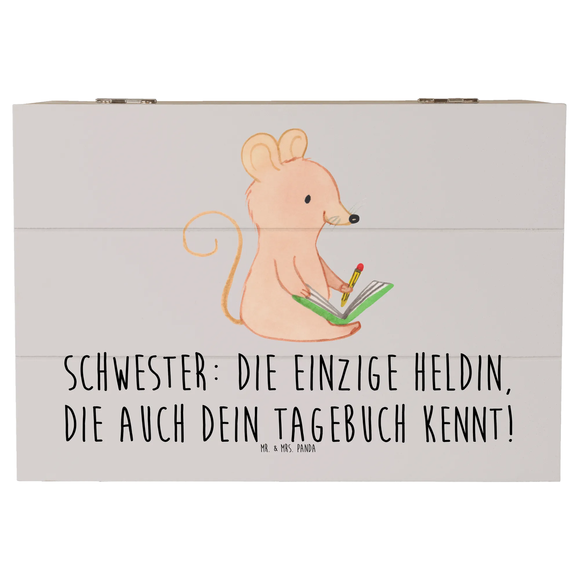 Die Holzkiste mit dem besonderen Motiv "Schwester" von Mr. & Mrs. Panda ist das perfekte Geschenk für all jene, die diese wichtige Bindung in ihrem Leben feiern möchten. Ob der zauberhafte Spruch "Schwester: Die einzige Heldin, die auch dein Tagebuch kennt!" oder das stilvolle Design – diese Kiste strahlt Liebe und Wertschätzung aus. Sie ist nicht nur ein wunderbarer Aufbewahrungsort für all deine Schätze, Erinnerungen oder Fotos, sondern auch ein wahres Schmuckstück in jedem Raum.