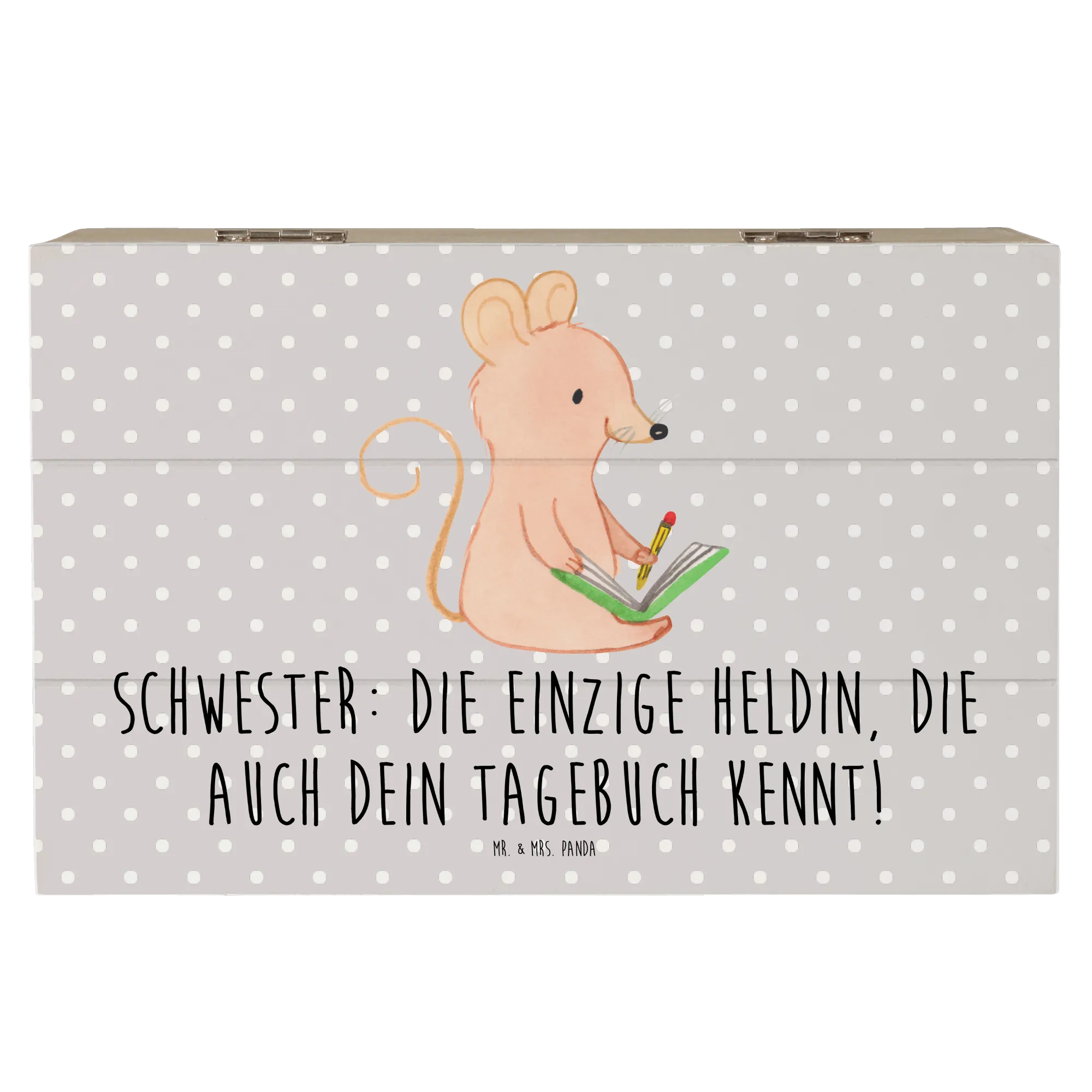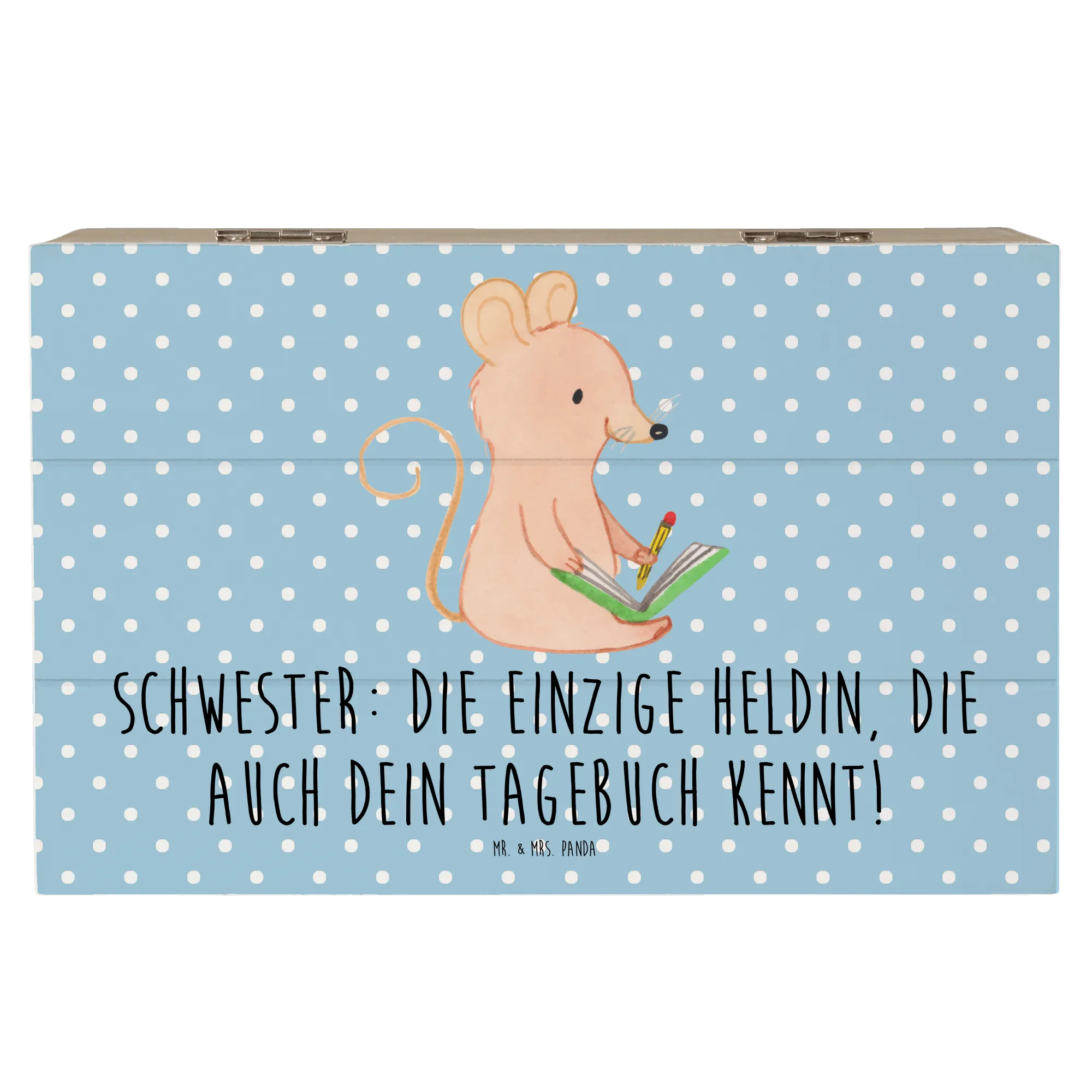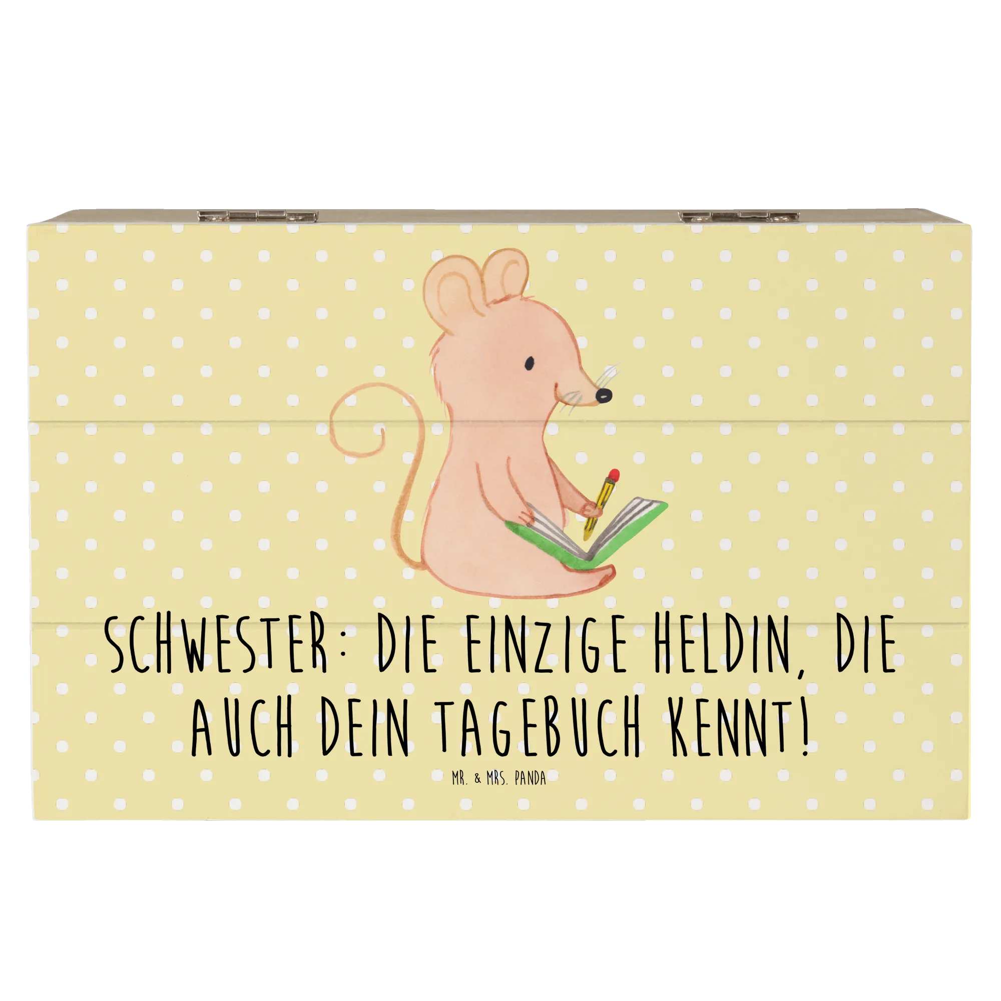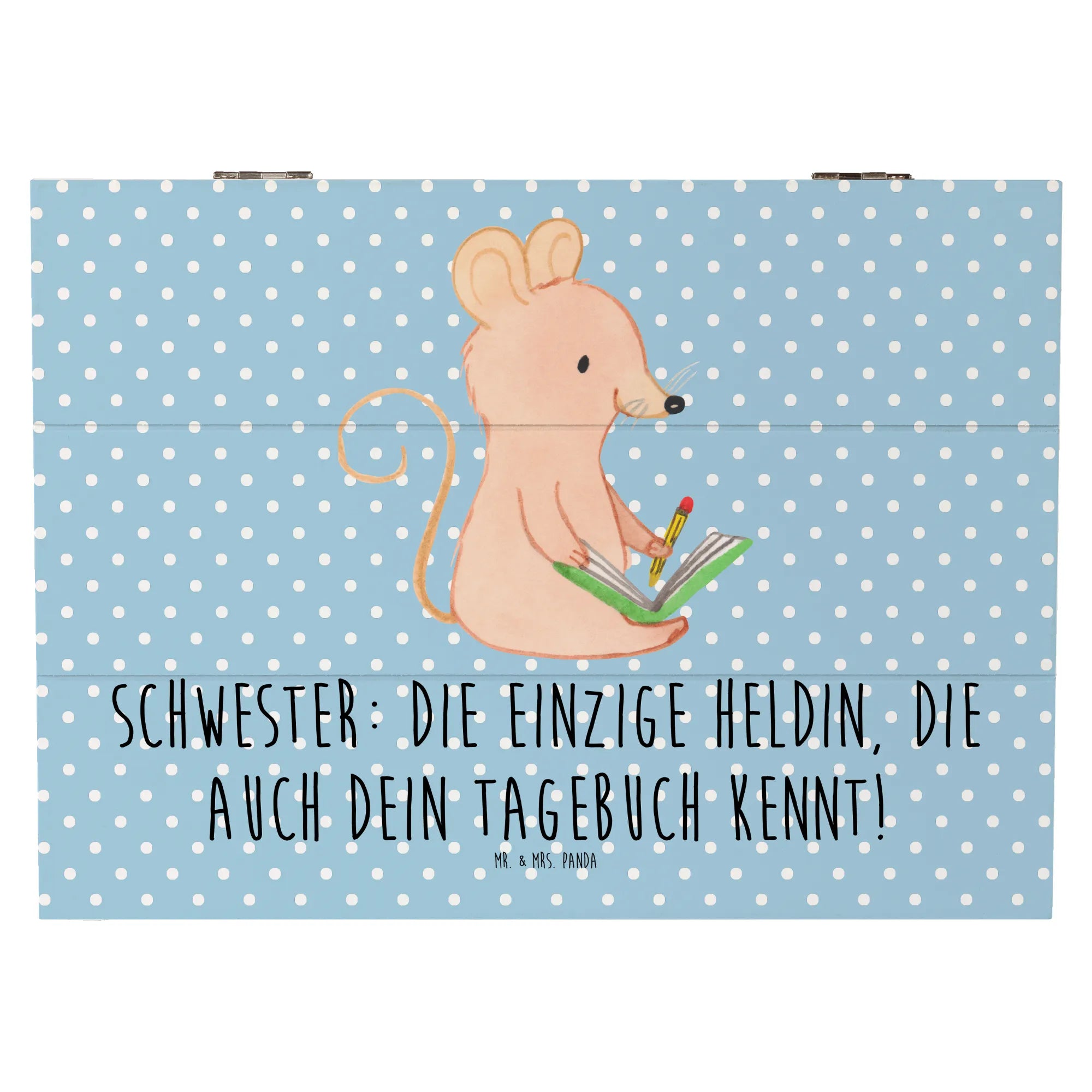 Die Holzkiste mit dem besonderen Motiv "Schwester" von Mr. & Mrs. Panda ist das perfekte Geschenk für all jene, die diese wichtige Bindung in ihrem Leben feiern möchten. Ob der zauberhafte Spruch "Schwester: Die einzige Heldin, die auch dein Tagebuch kennt!" oder das stilvolle Design – diese Kiste strahlt Liebe und Wertschätzung aus. Sie ist nicht nur ein wunderbarer Aufbewahrungsort für all deine Schätze, Erinnerungen oder Fotos, sondern auch ein wahres Schmuckstück in jedem Raum.