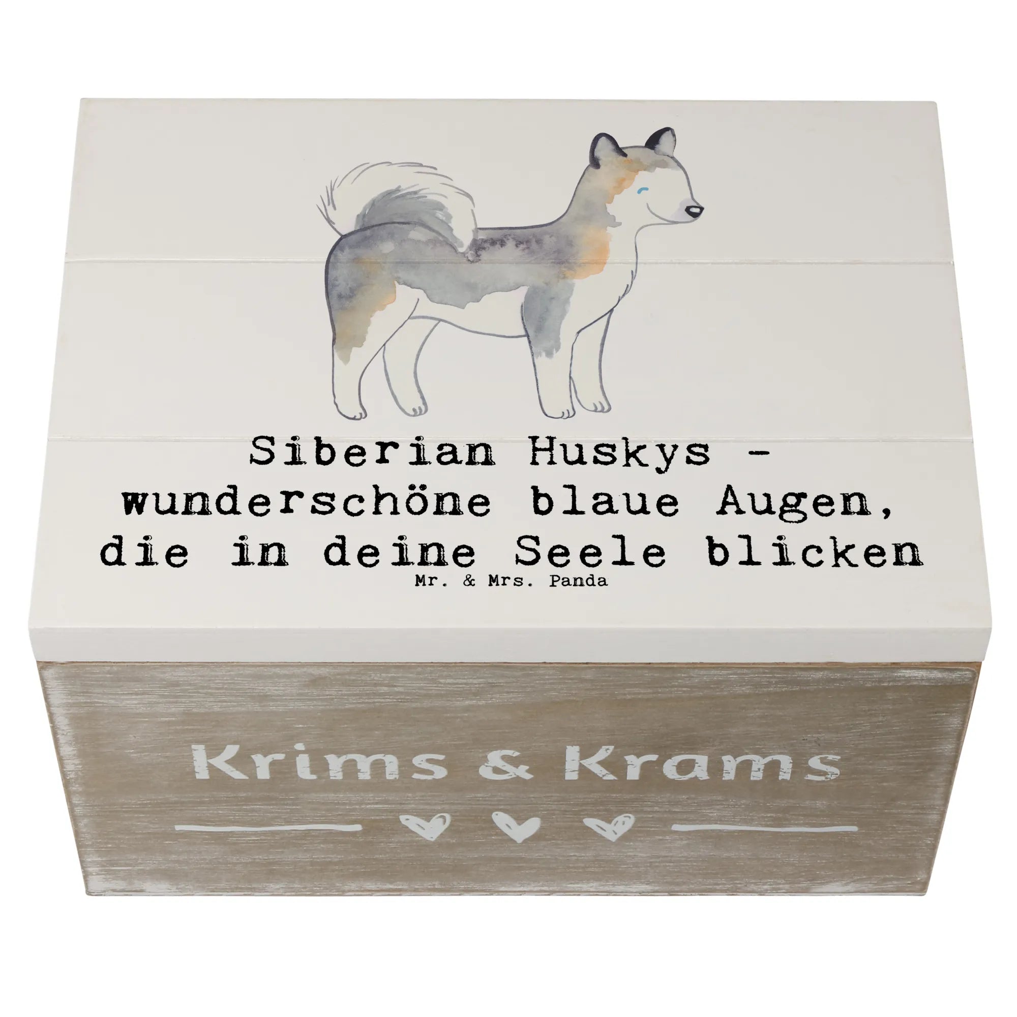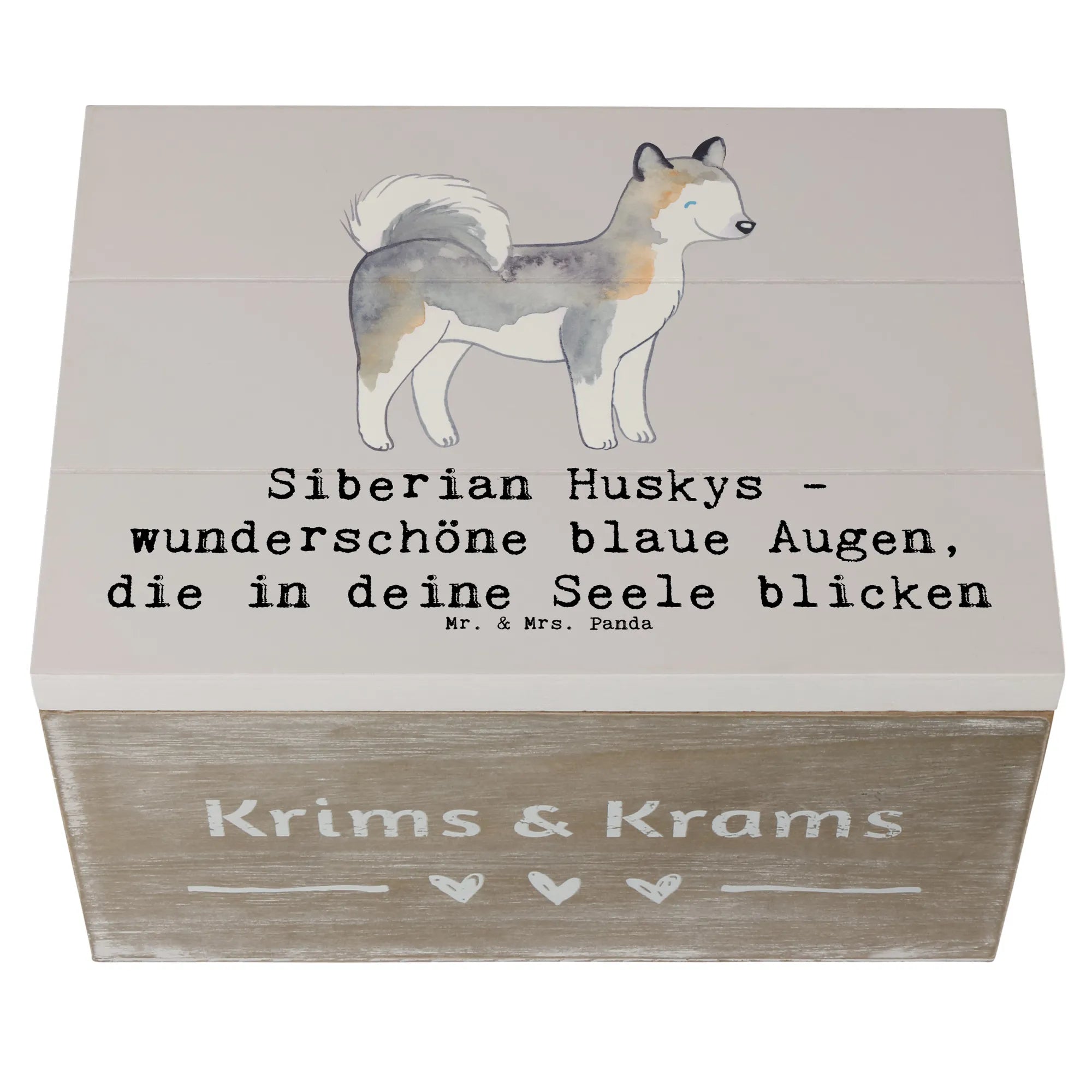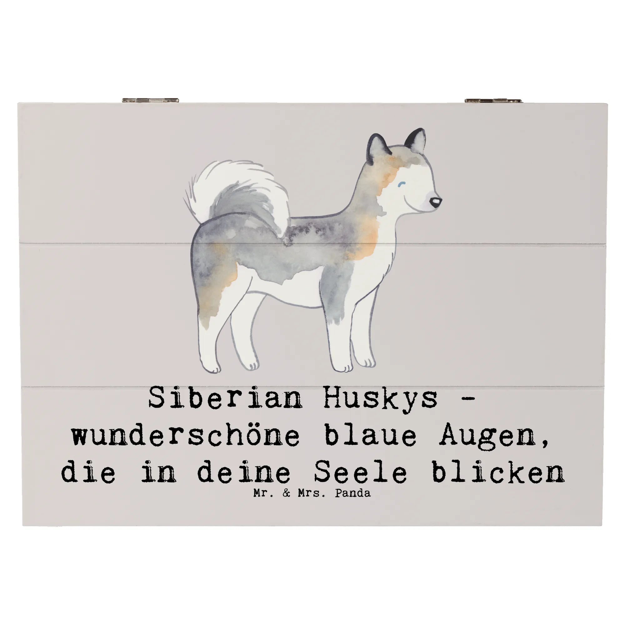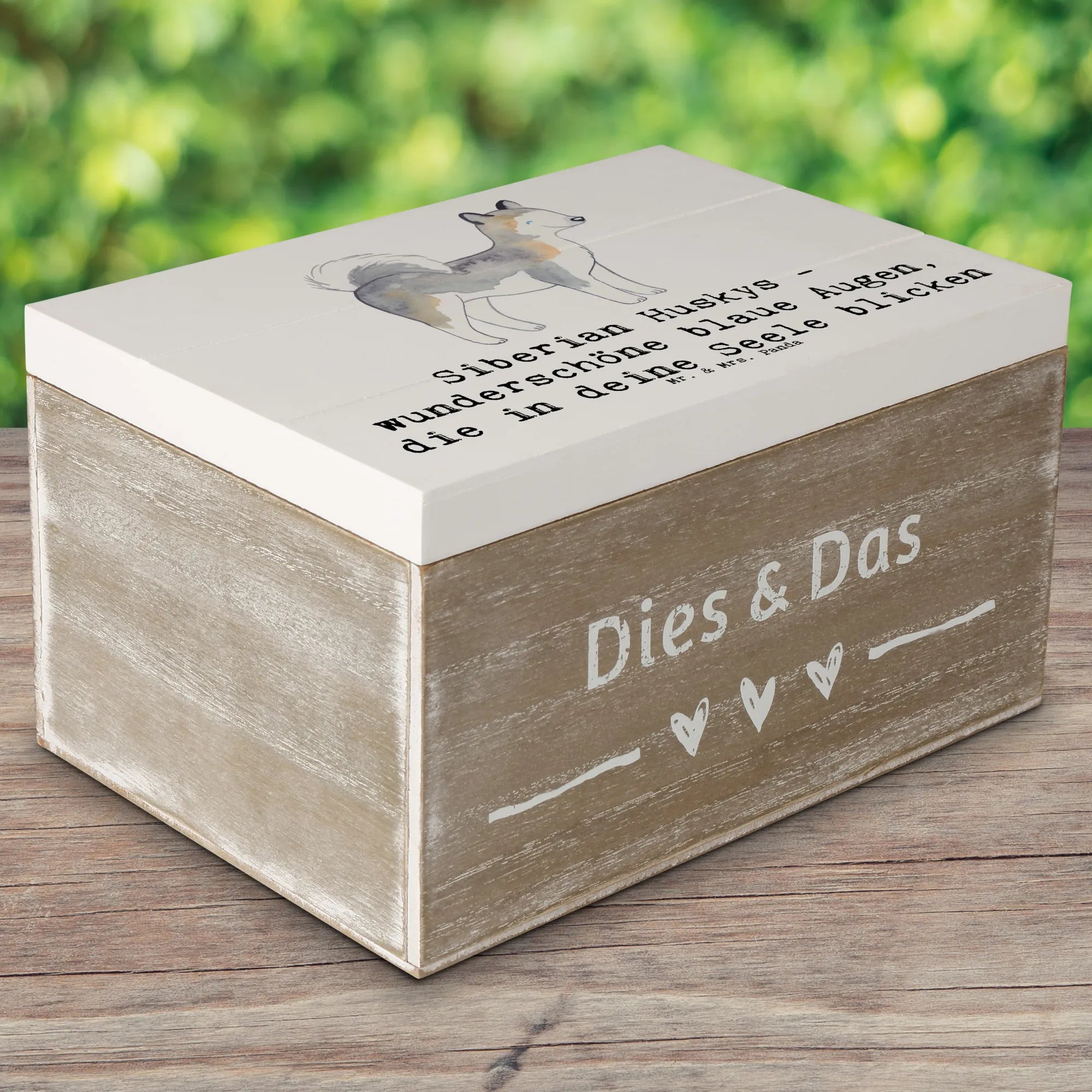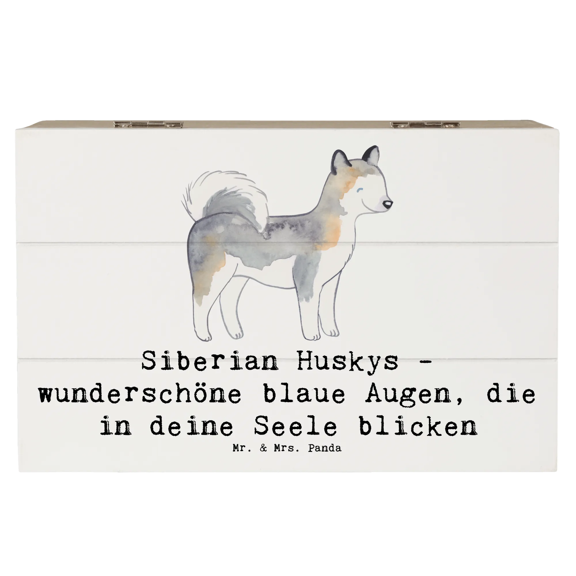 Die wunderschöne Holzkiste von Mr. & Mrs. Panda mit dem zauberhaften Motiv eines Siberian Huskys ist das perfekte Geschenk für Hundefans. Egal, ob für einen Geburtstag, ein besonderes Jubiläum oder einfach nur so, diese Erinnerungskiste wird jedes Herz höher schlagen lassen! Mit dem beliebten Slogan „Siberian Huskys - wunderschöne blaue Augen, die in deine Seele blicken“ ist sie nicht nur ein schöner Aufbewahrungsort für Erinnerungen, sondern auch ein liebenswertes Wohnaccessoire.