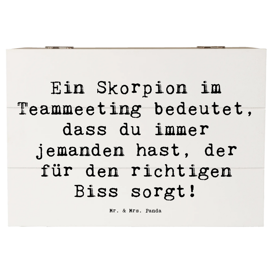 Die Kiste ist aus robuster Holzfaser gefertigt, die sowohl langlebig als auch umweltfreundlich ist. Mit ihrer edlen und stabilen Bauweise wird sie garantiert zum liebevollen Begleiter in jedem Zuhause. Der Slogan "Ein Skorpion im Teammeeting bedeutet, dass du immer jemanden hast, der für den richtigen Biss sorgt!" verleiht der Kiste eine humorvolle Note und sorgt dafür, dass sie nicht nur praktisch ist, sondern auch Freude bereitet.
