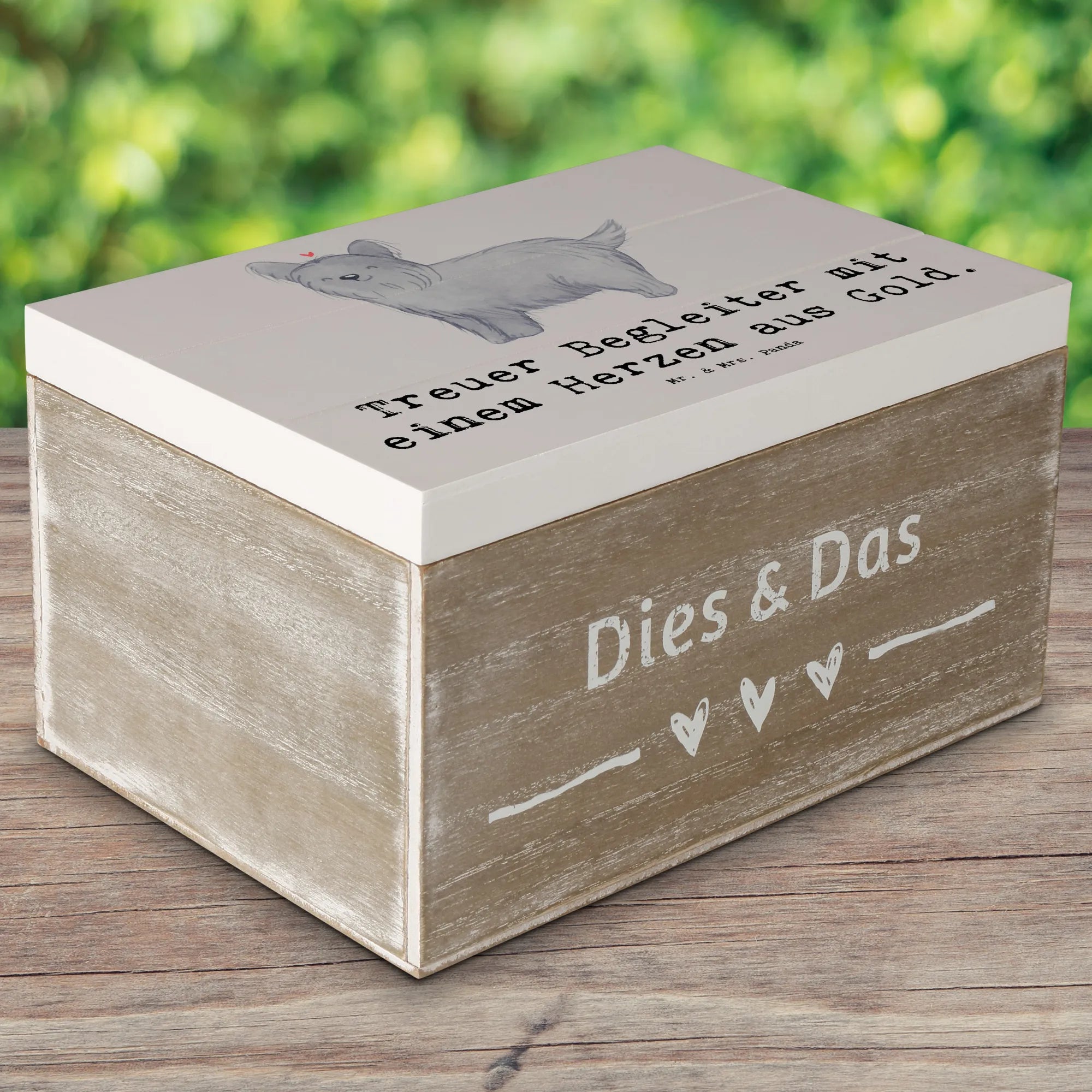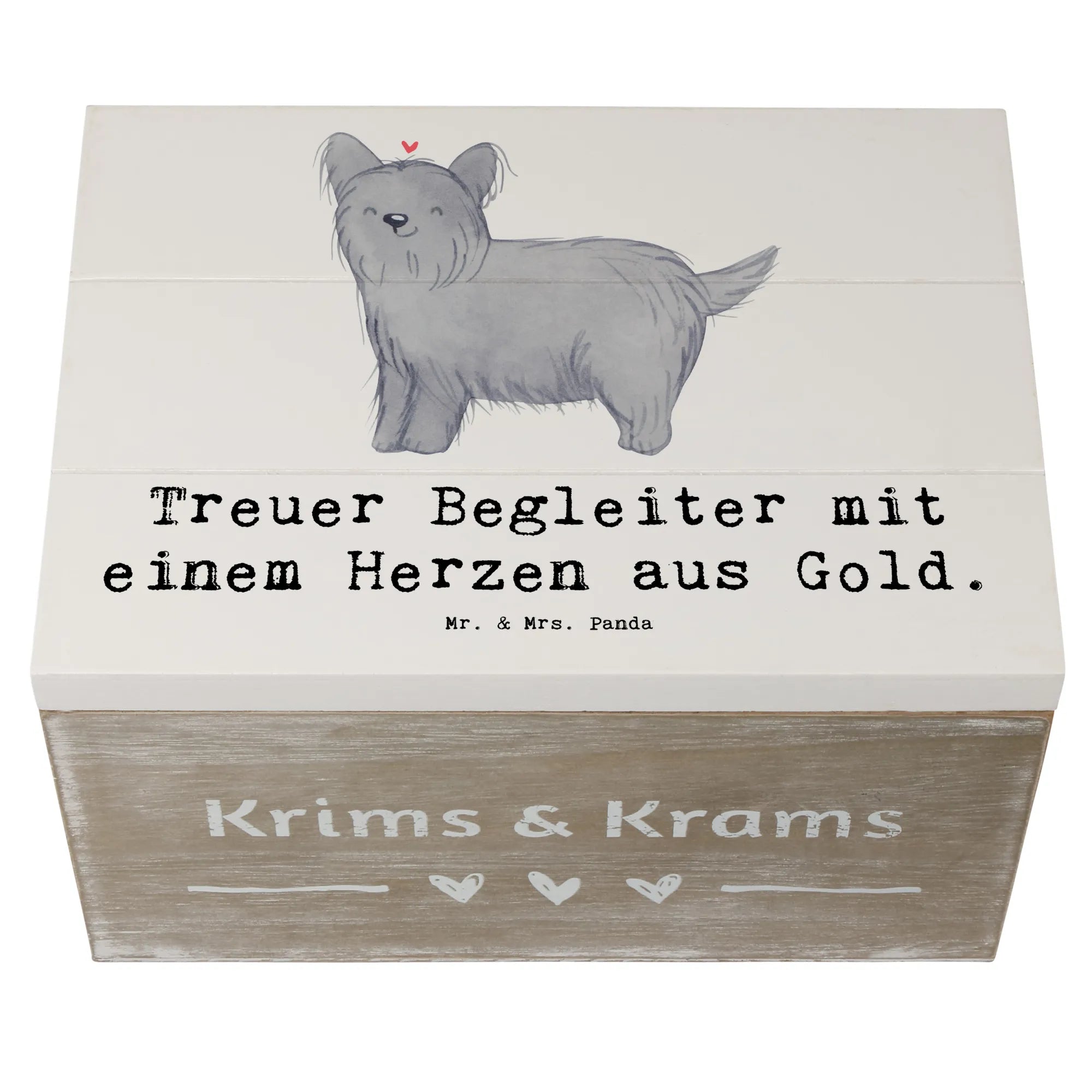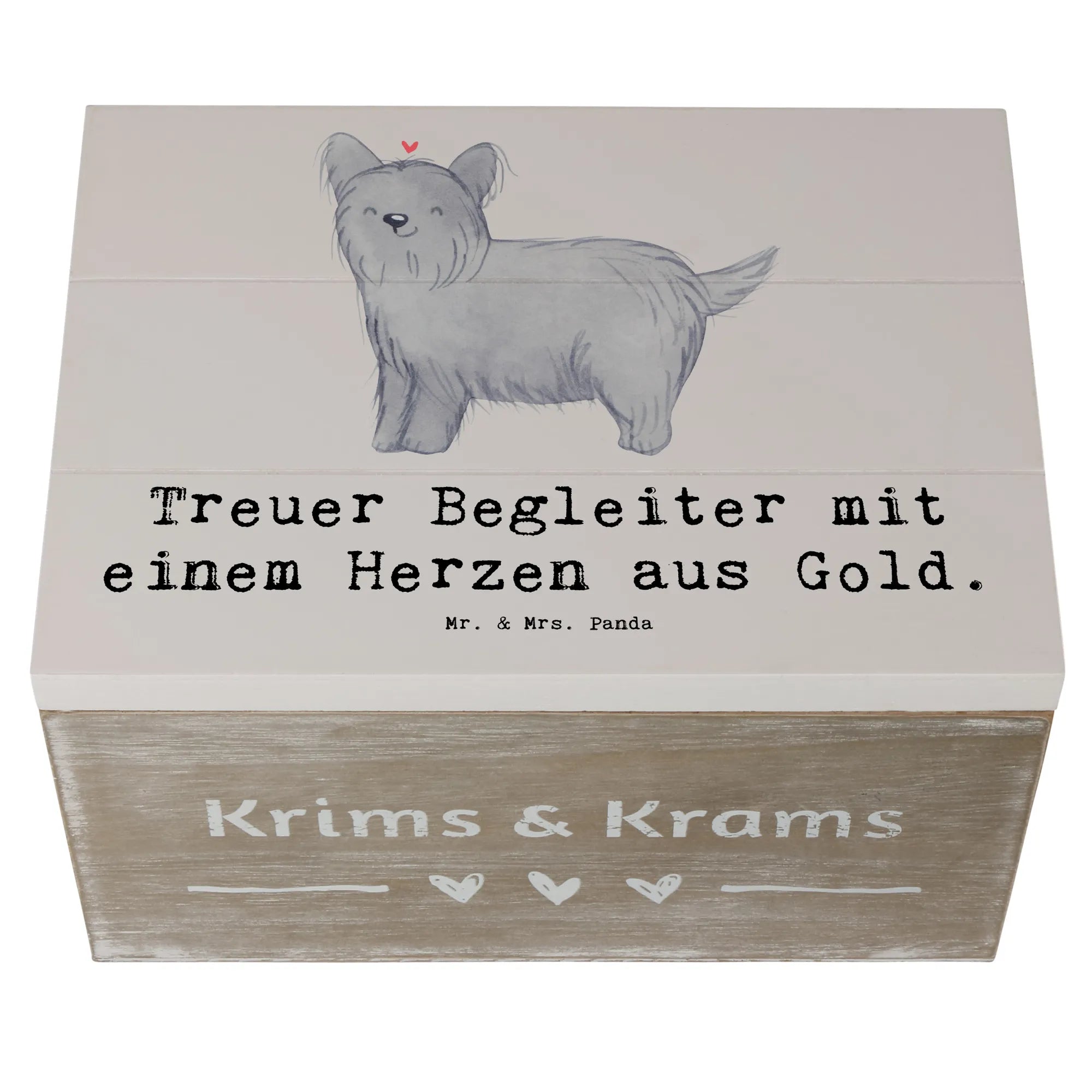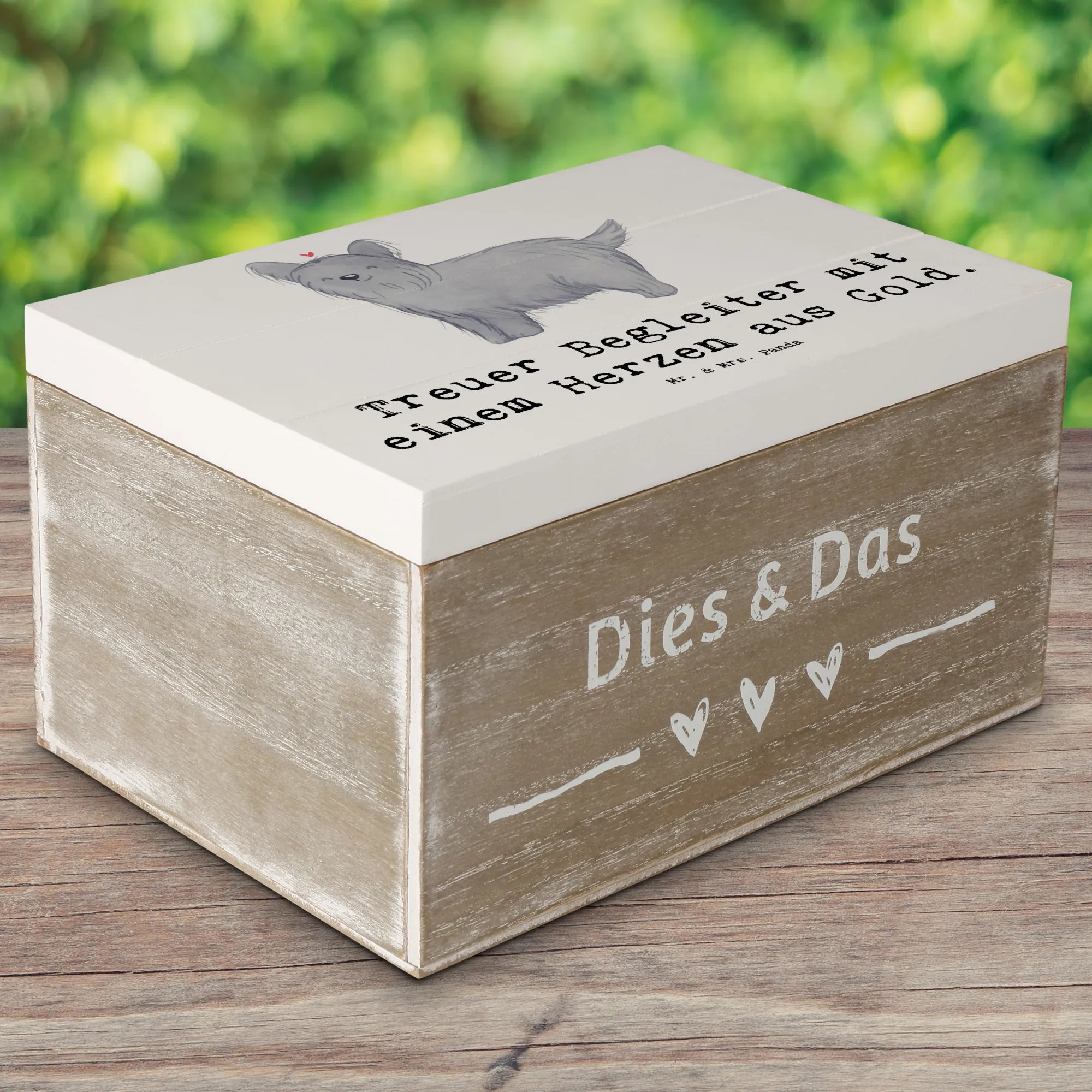 Entdecke die wunderschöne Holzkiste von Mr. & Mrs. Panda, die nicht nur praktisch, sondern auch ein echter Hingucker ist! Diese Erinnerungskiste mit dem niedlichen Skye Terrier Motiv und dem liebevollen Slogan "Treuer Begleiter mit einem Herzen aus Gold" ist das perfekte Geschenk für jeden Hundefan.