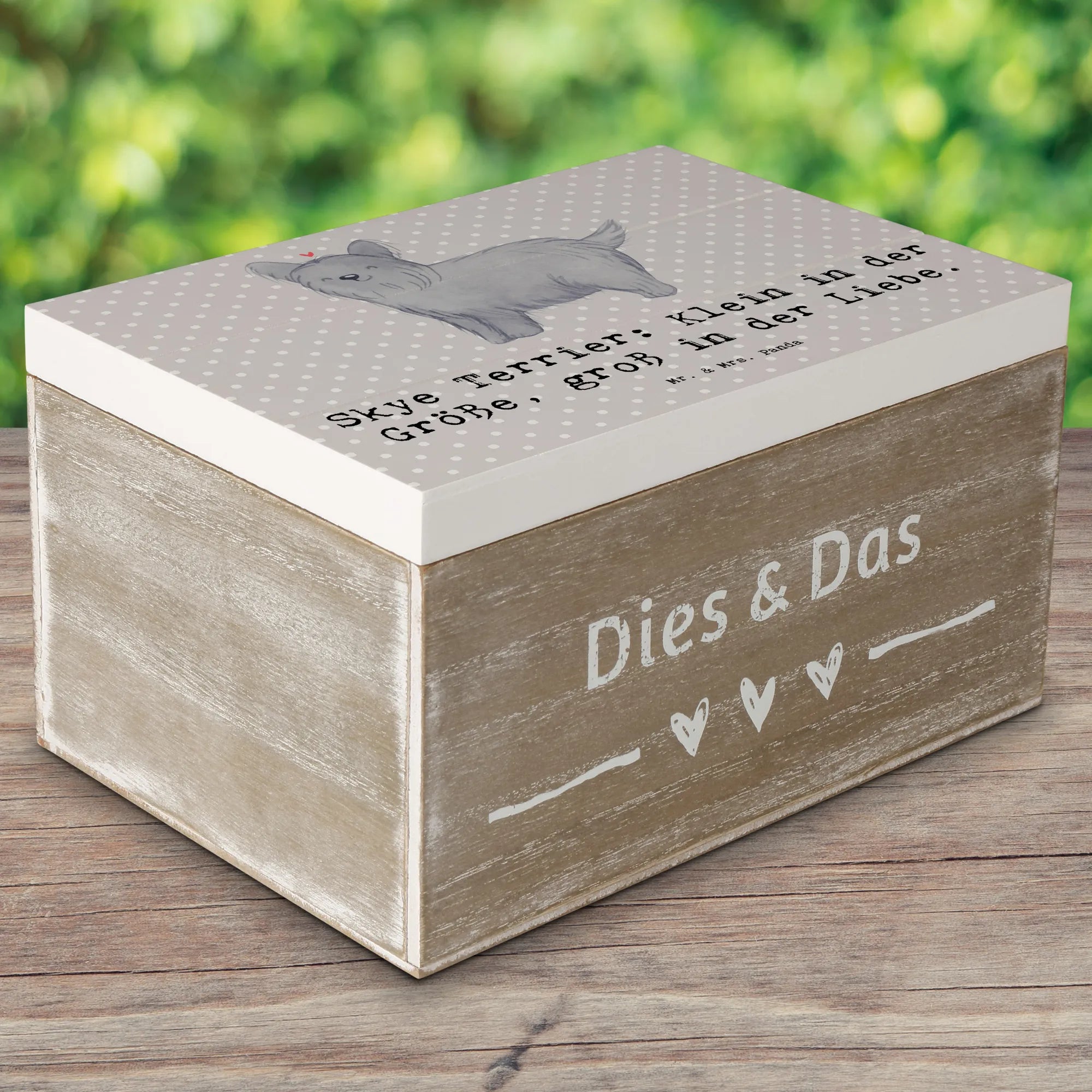 Die wunderschöne Holzkiste von Mr. & Mrs. Panda mit dem niedlichen Motiv des Skye Terriers ist das perfekte Geschenk für alle Hundefans und Hundeliebhaber. Diese besondere Kiste ist nicht nur ein praktischer Aufbewahrungsort, sondern auch ein liebenswertes Dekorationsstück für dein Zuhause. Egal, ob du besondere Erinnerungen an deinen eigenen Skye Terrier aufbewahren oder jemanden überraschen möchtest, diese Erinnerungskiste bringt Freude ins Herz und schafft eine liebevolle Verbindung zu diesem kleinen, aber bezaubernden Hund.