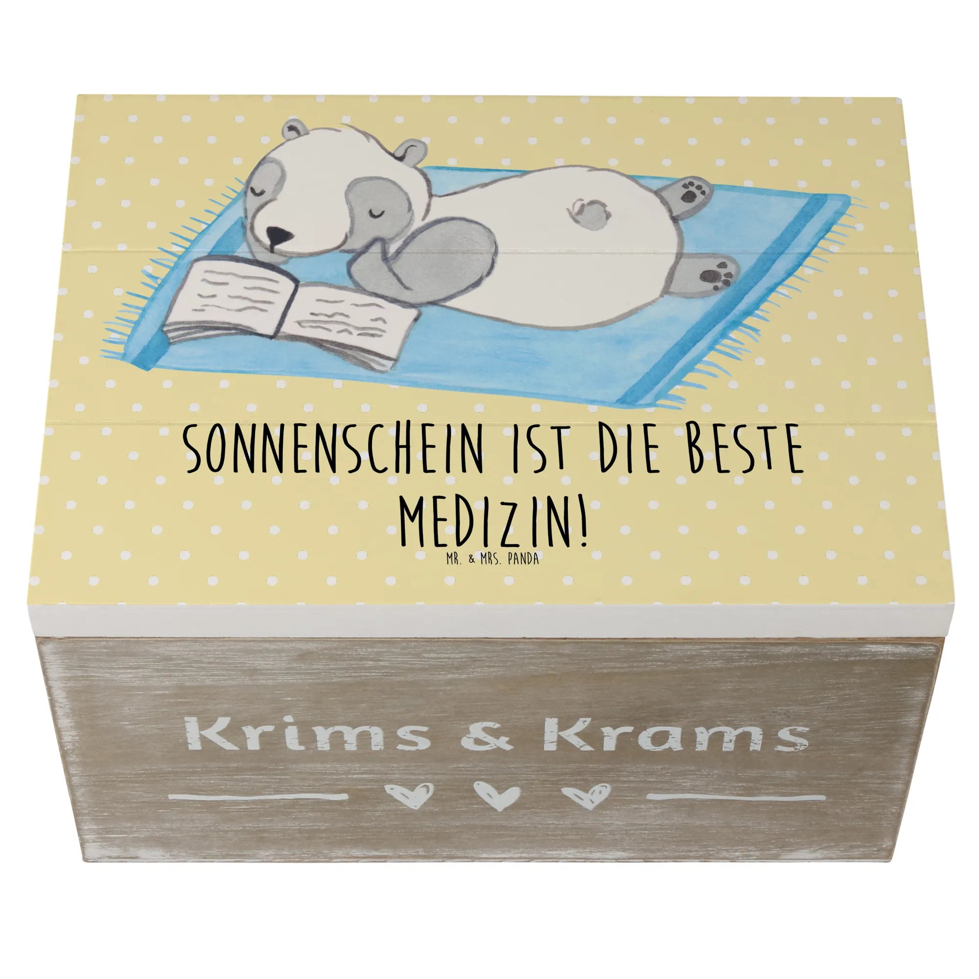 Besonders schön ist das liebevoll gestaltete Motiv, das den Slogan "Sonnenschein ist die beste Medizin!" trägt. Bei Mr. & Mrs. Panda dreht sich alles um positive Vibes und Lebensfreude, also ist diese Holzkiste nicht nur ein cooles Deko-Element, sondern auch eine tolle Möglichkeit, Erinnerungen an die warmen Sommertage festzuhalten.