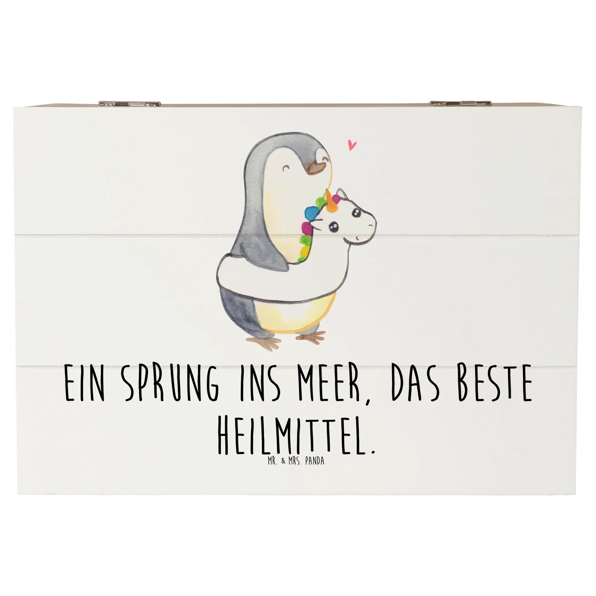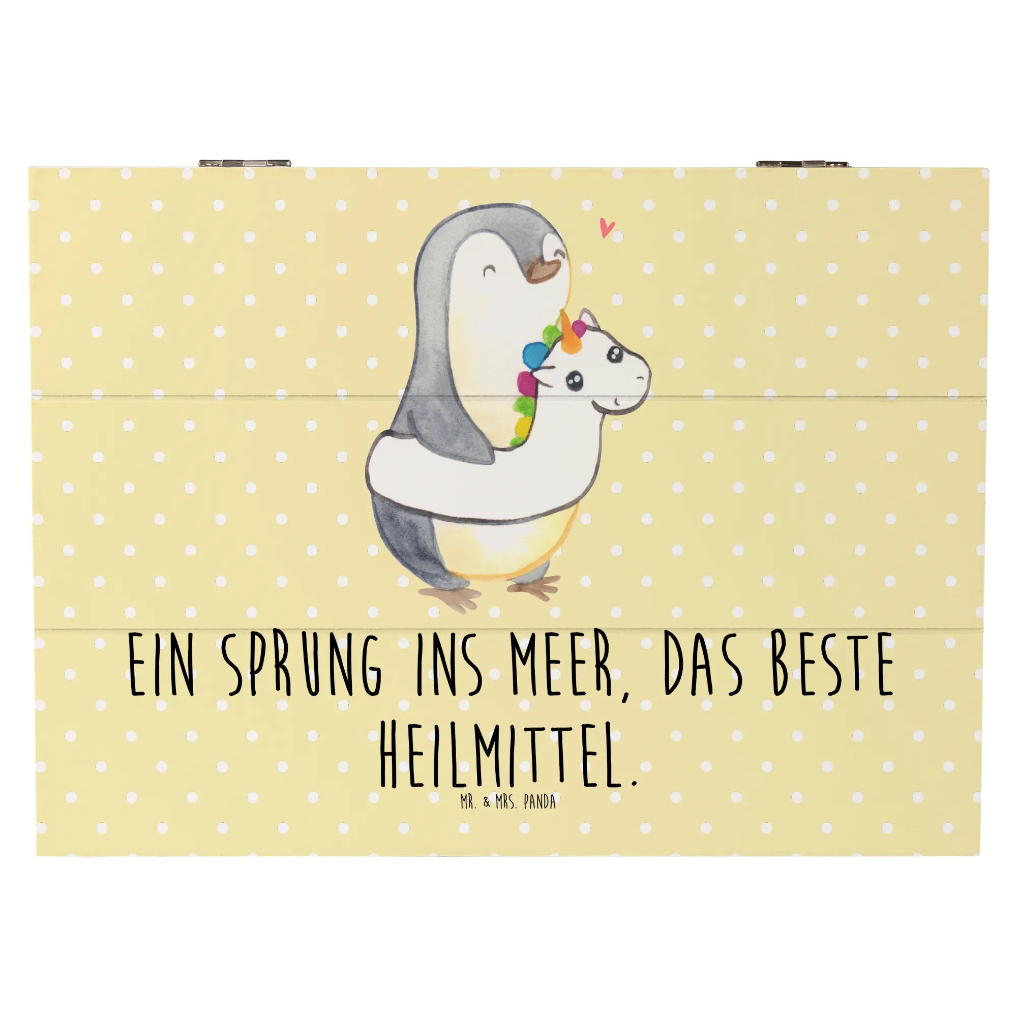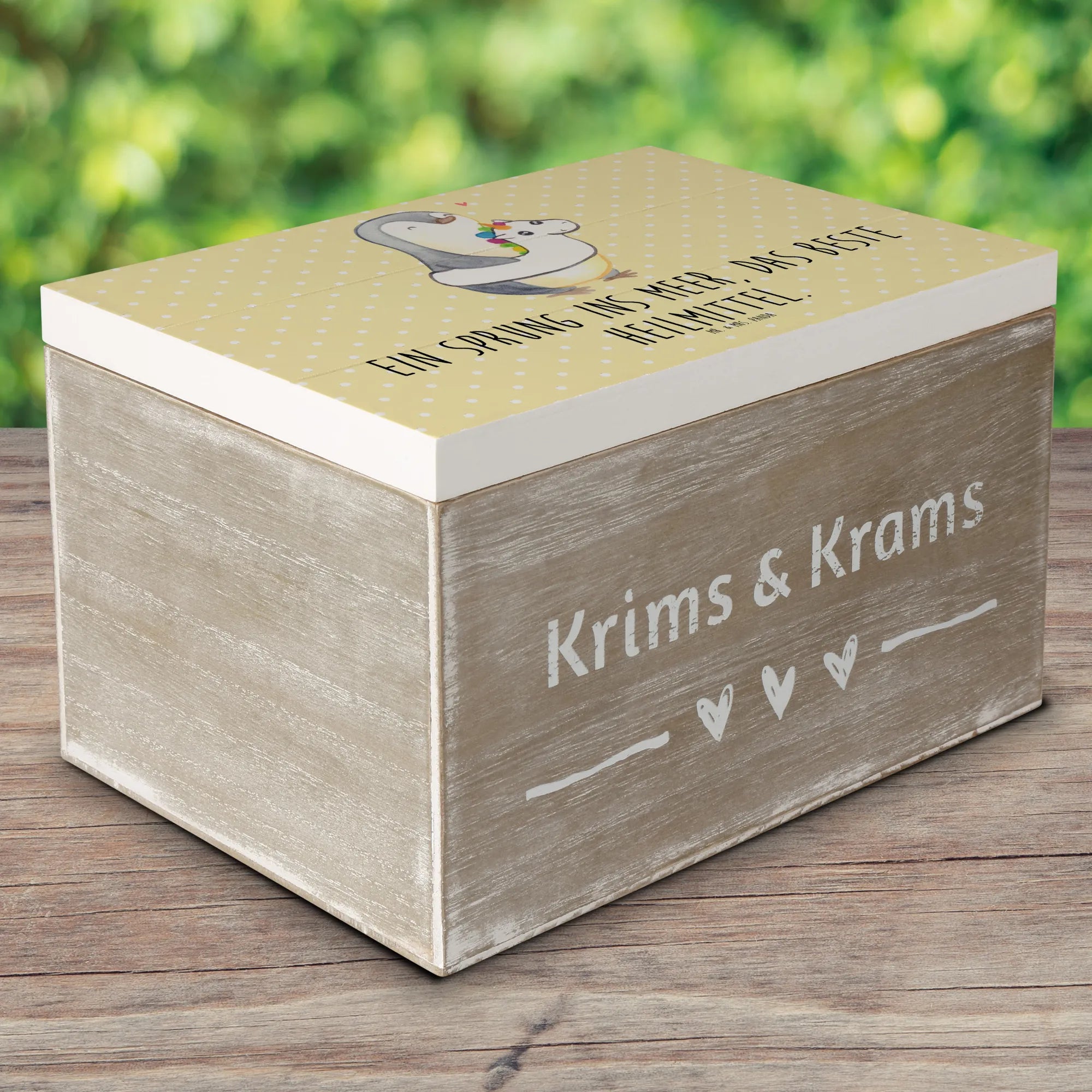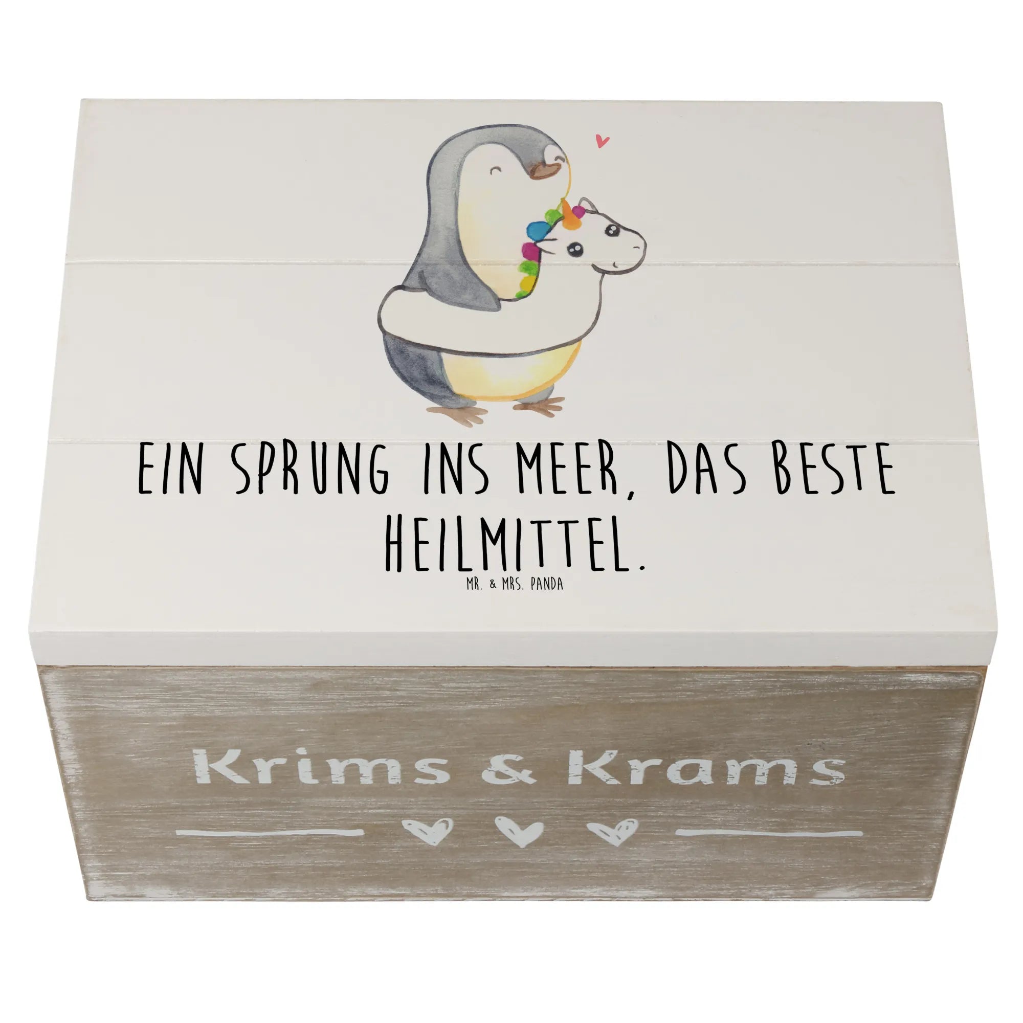 Die zauberhafte Holzkiste von Mr. & Mrs. Panda ist das perfekte Geschenk für jeden, der die Sonne, das Meer und den Sommer liebt. Mit dem inspirierenden Spruch "Ein Sprung ins Meer, das beste Heilmittel" auf der Kiste verewigst du unvergessliche Erinnerungen an sonnige Strandtage und entspannte Urlaube.