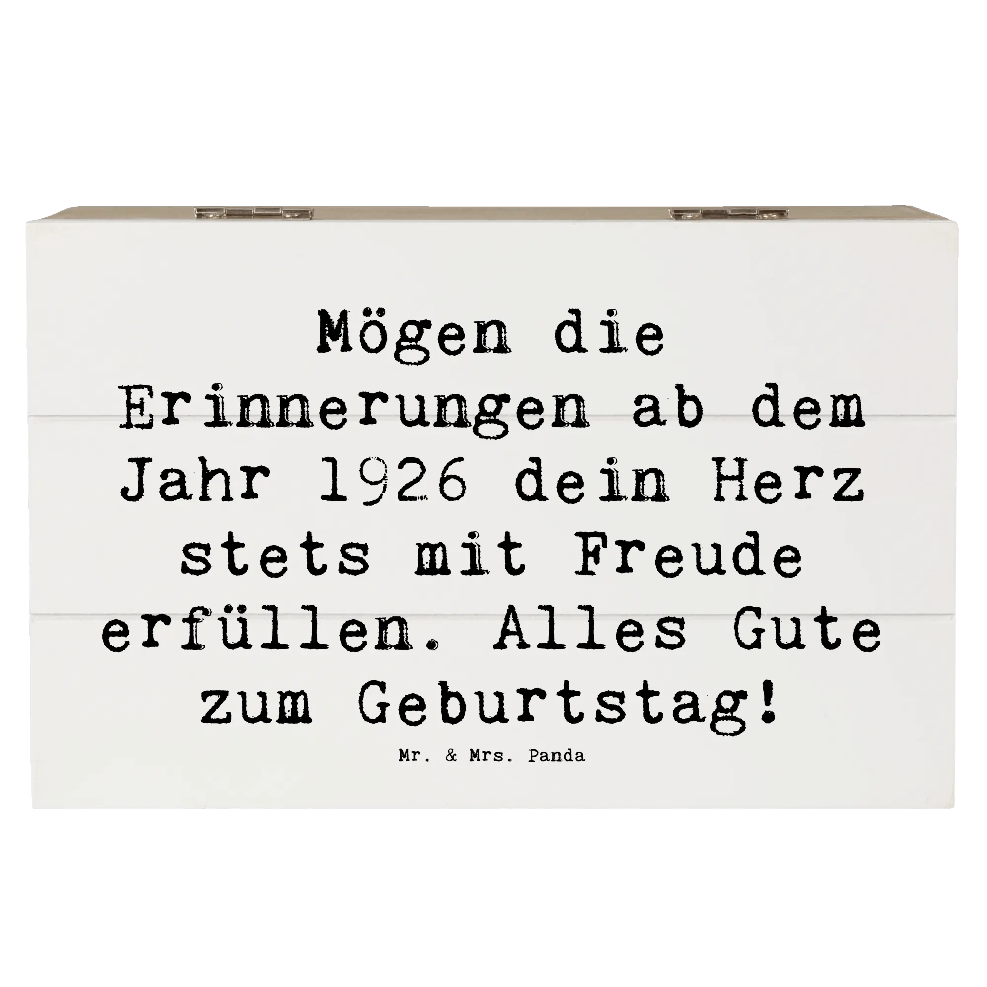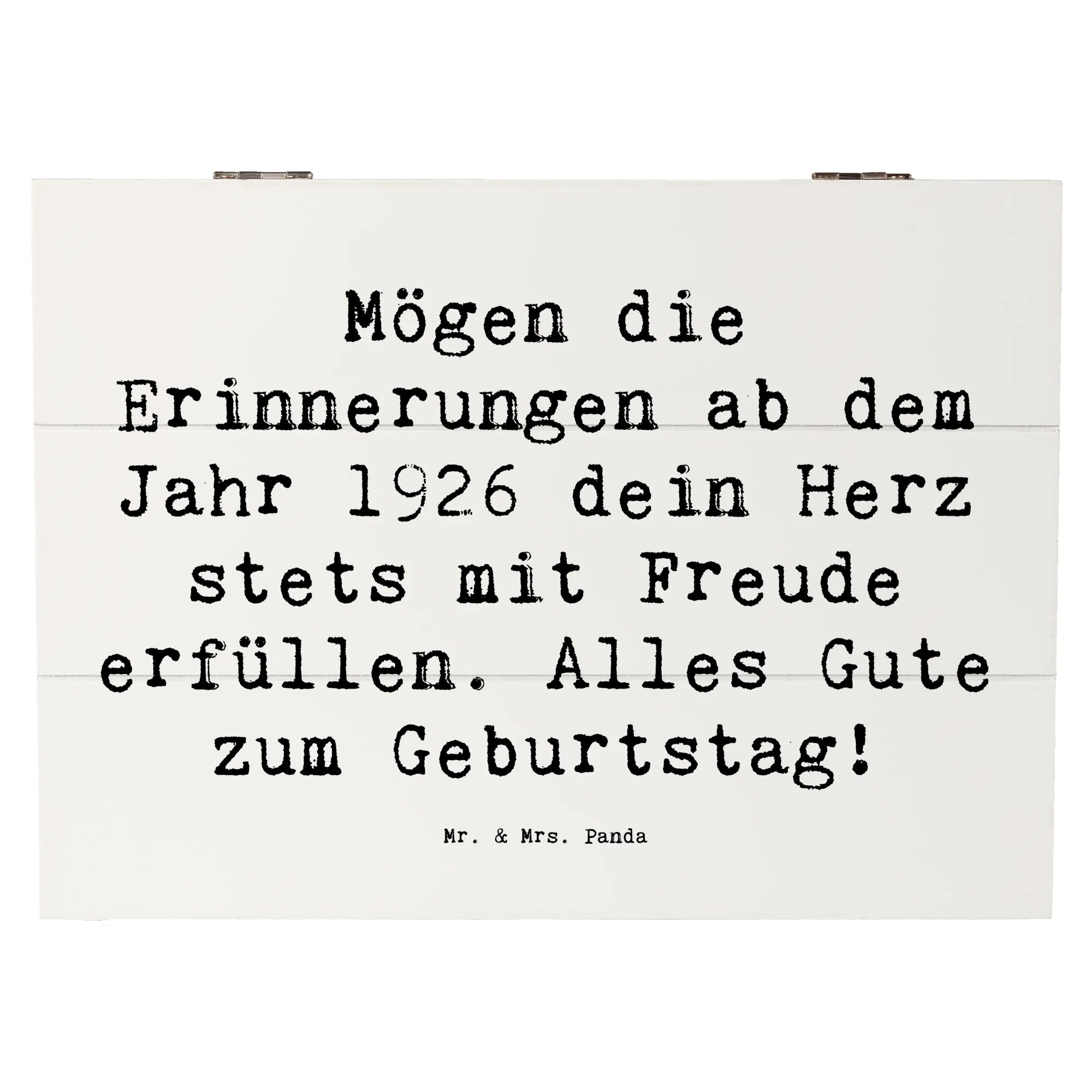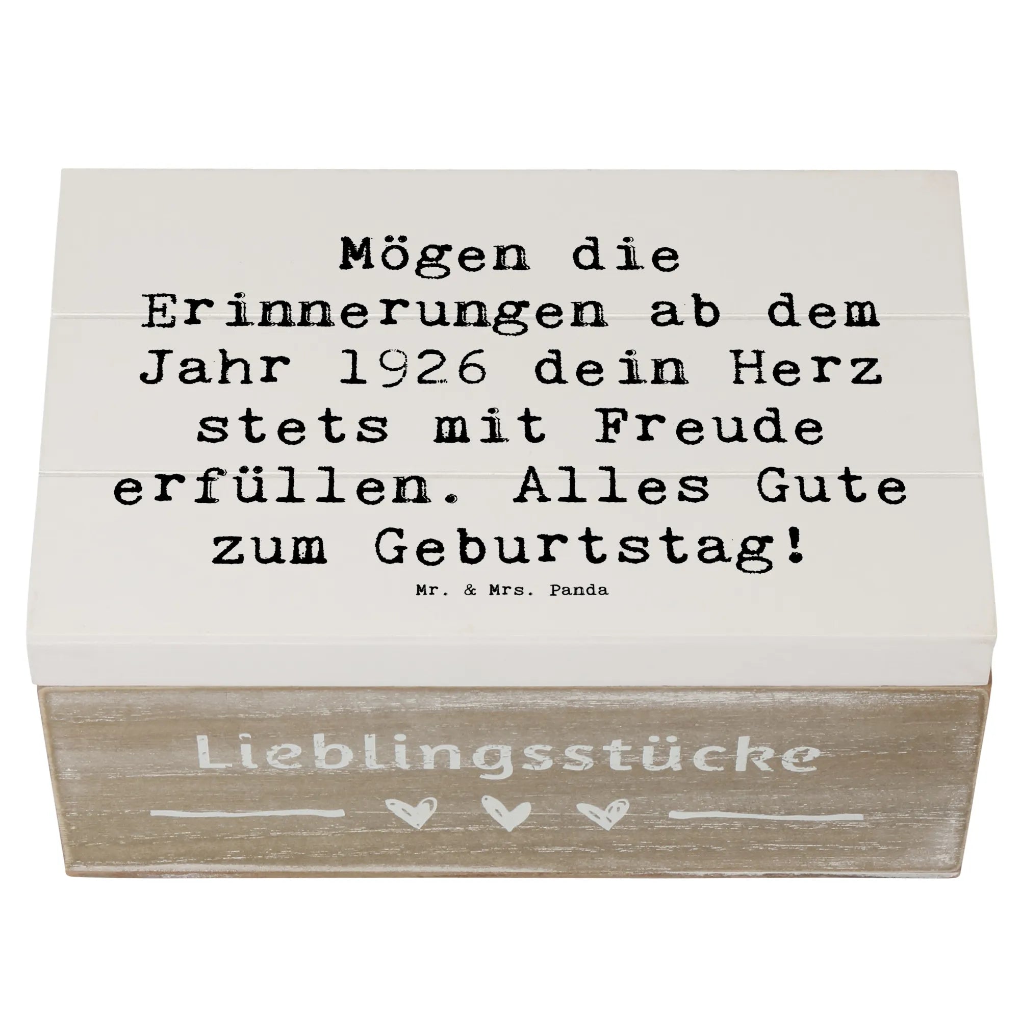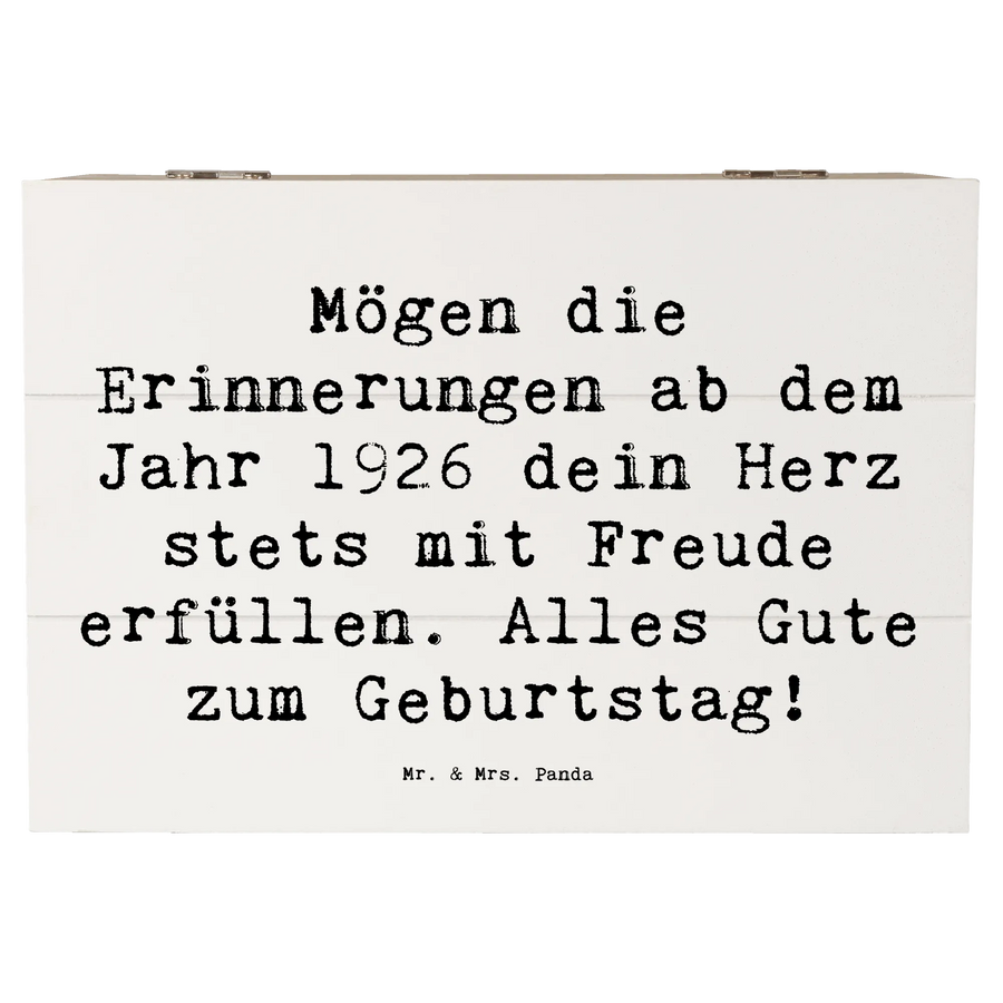 Auf dem Deckel findest du den liebevollen Spruch: 'Mögen die Erinnerungen ab dem Jahr 1926 dein Herz stets mit Freude erfüllen. Alles Gute zum Geburtstag!' – Dieser Spruch macht die Kiste zu einem ganz besonderen Geschenk für deinen Lieblingsmenschen.