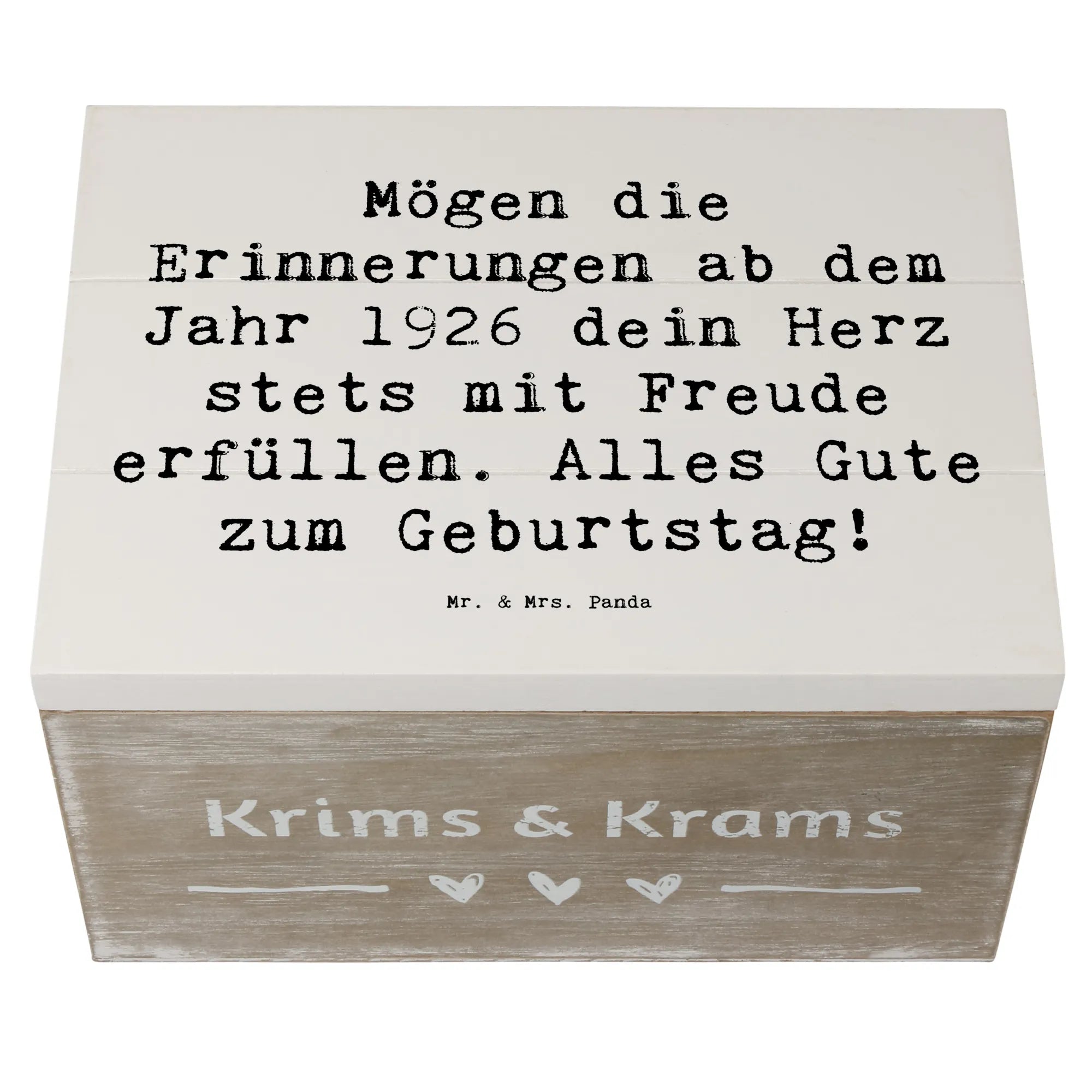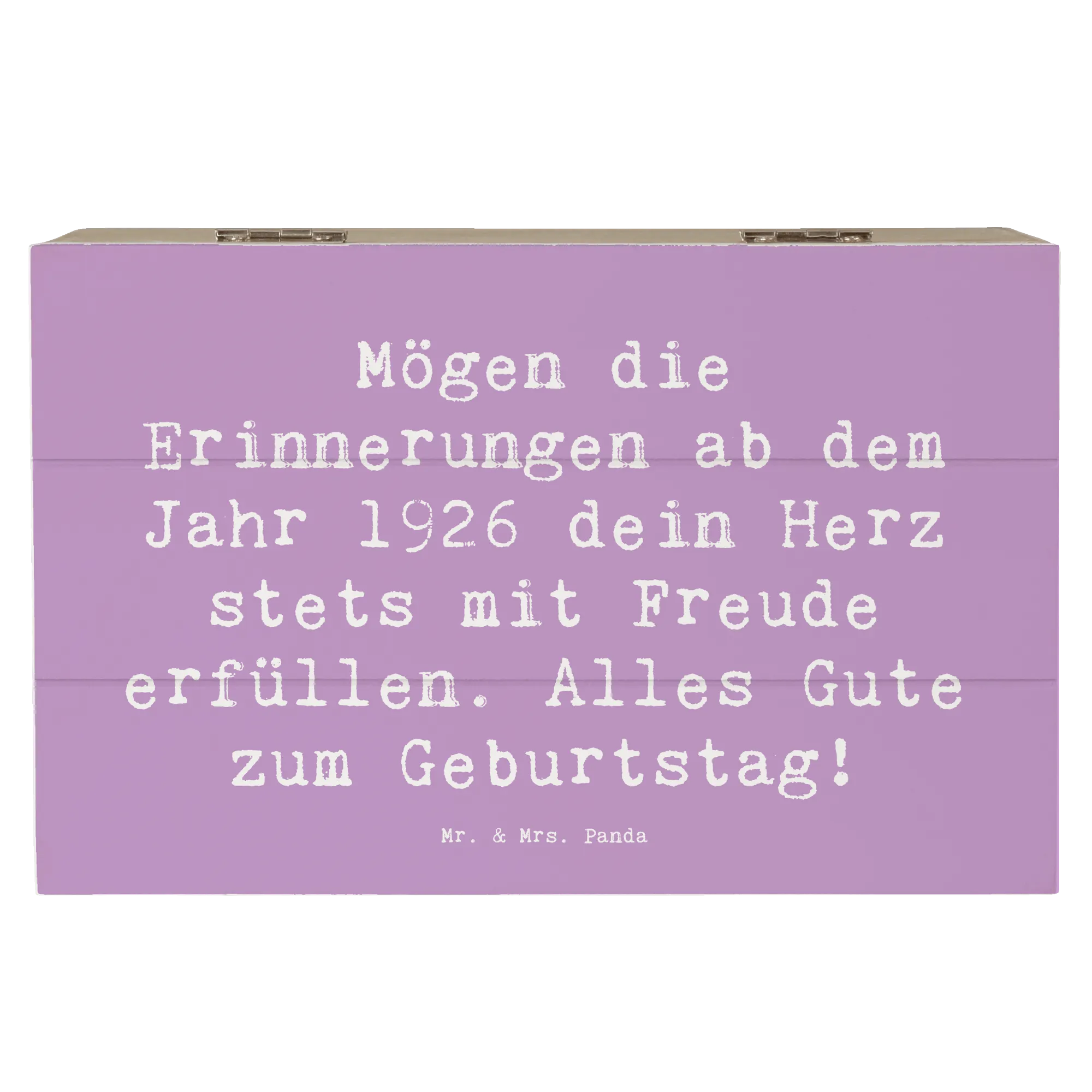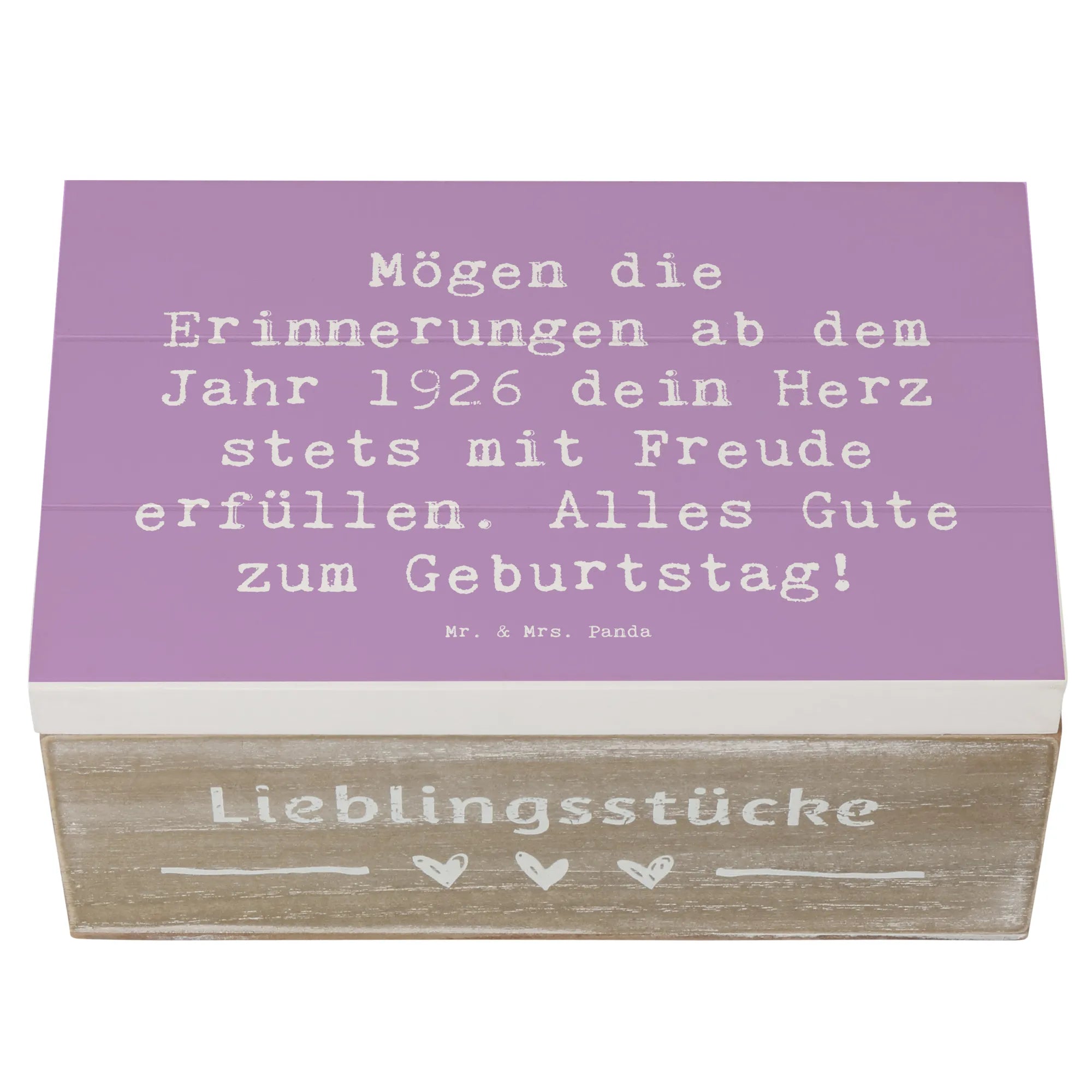 Auf dem Deckel findest du den liebevollen Spruch: 'Mögen die Erinnerungen ab dem Jahr 1926 dein Herz stets mit Freude erfüllen. Alles Gute zum Geburtstag!' – Dieser Spruch macht die Kiste zu einem ganz besonderen Geschenk für deinen Lieblingsmenschen.