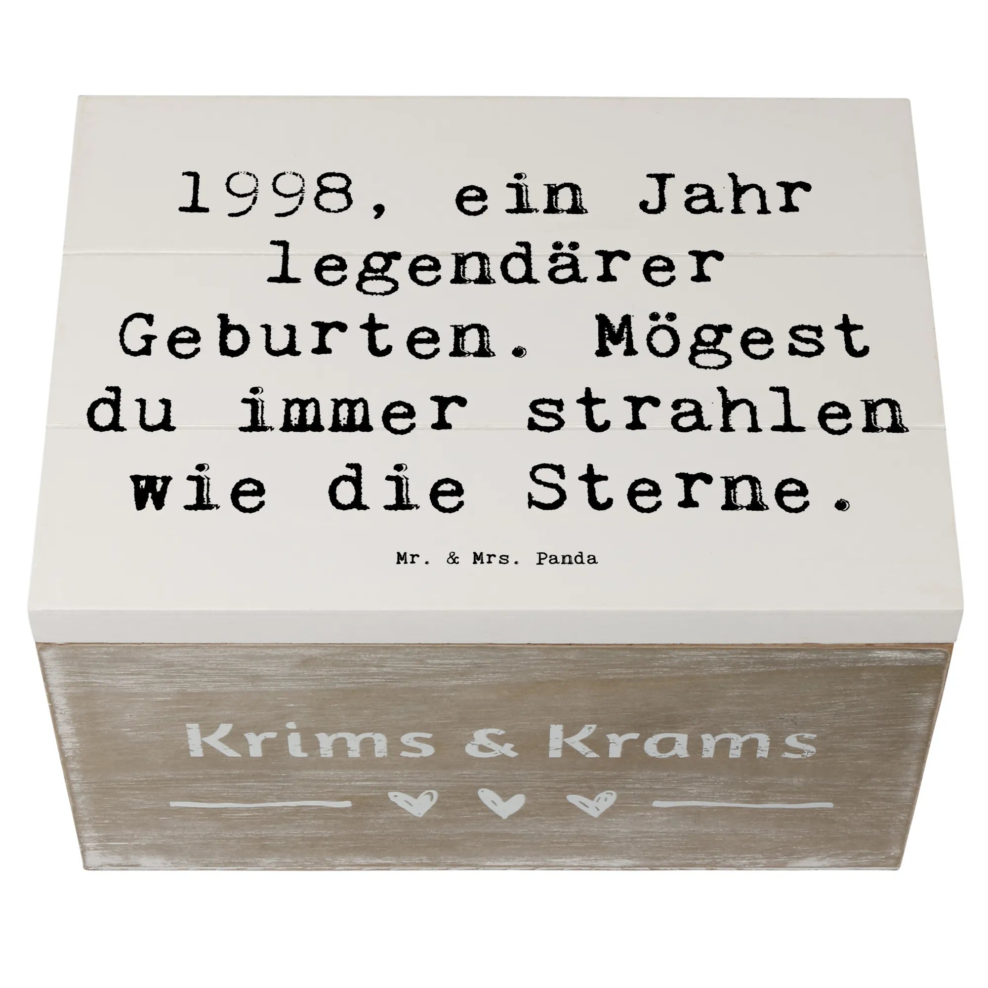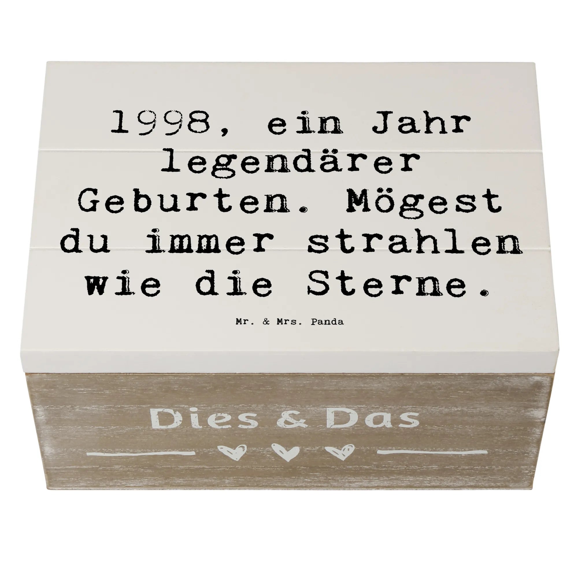 Suchst du ein Geschenk zum Geburtstag, eine Aufbewahrungskiste oder eine Holzbox mit besonderer Botschaft? Dann ist die Holzkiste „1998 Geburtstag“ genau die richtige Wahl – ein kleines, liebevolles Präsent mit großer Bedeutung von Mr. & Mrs. Panda.
