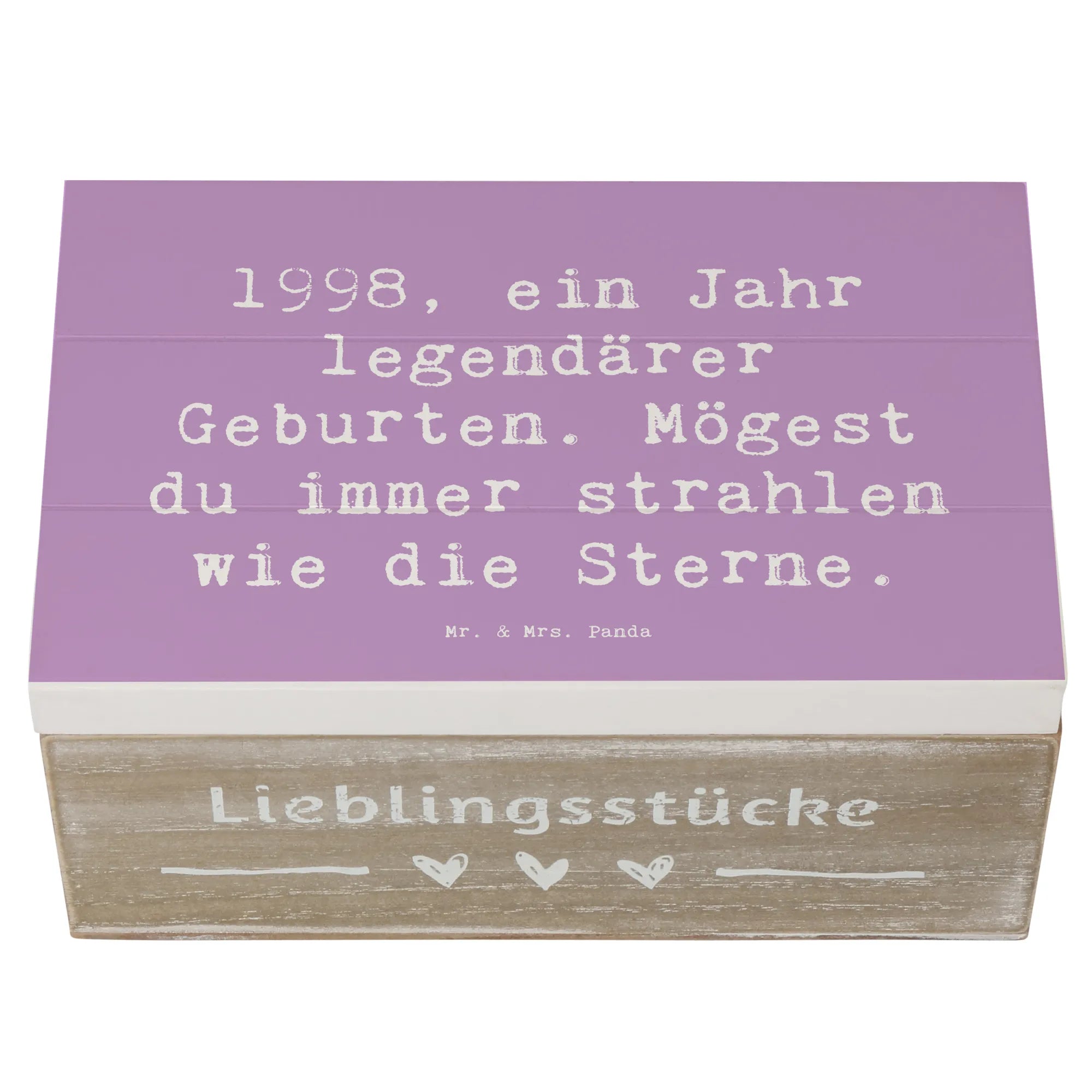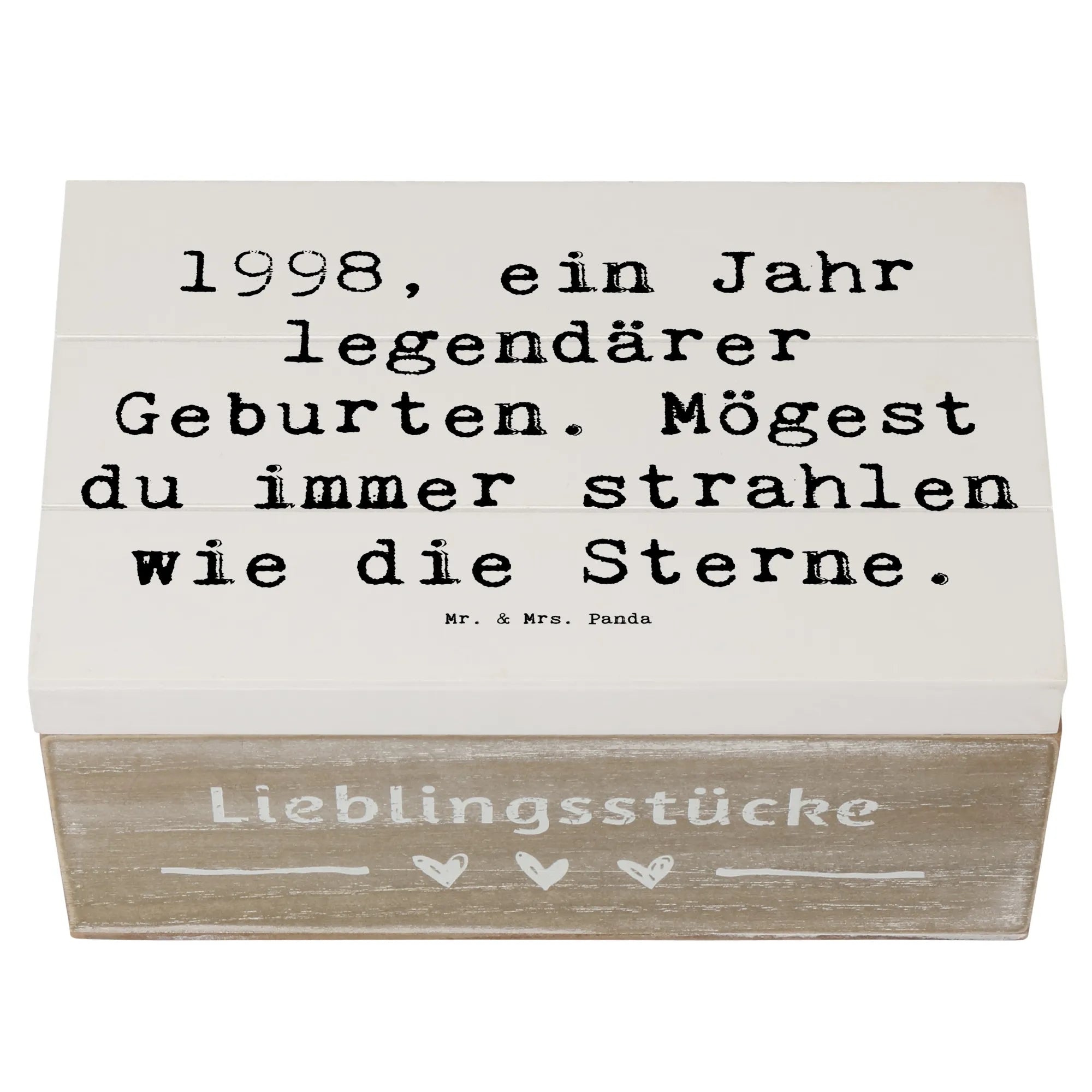 Die wunderschöne Holzkiste von Mr. & Mrs. Panda ist das perfekte Geschenk für jeden, der 1998 geboren wurde oder einen geliebten Menschen hat, der in diesem Jahr das Licht der Welt erblickte. Mit dem liebevoll entworfenen Motiv '1998, ein Jahr legendärer Geburten. Mögest du immer strahlen wie die Sterne.' wird diese Kiste zu einem echten Hingucker und einem würdigen Aufbewahrungsort für kostbare Erinnerungen.