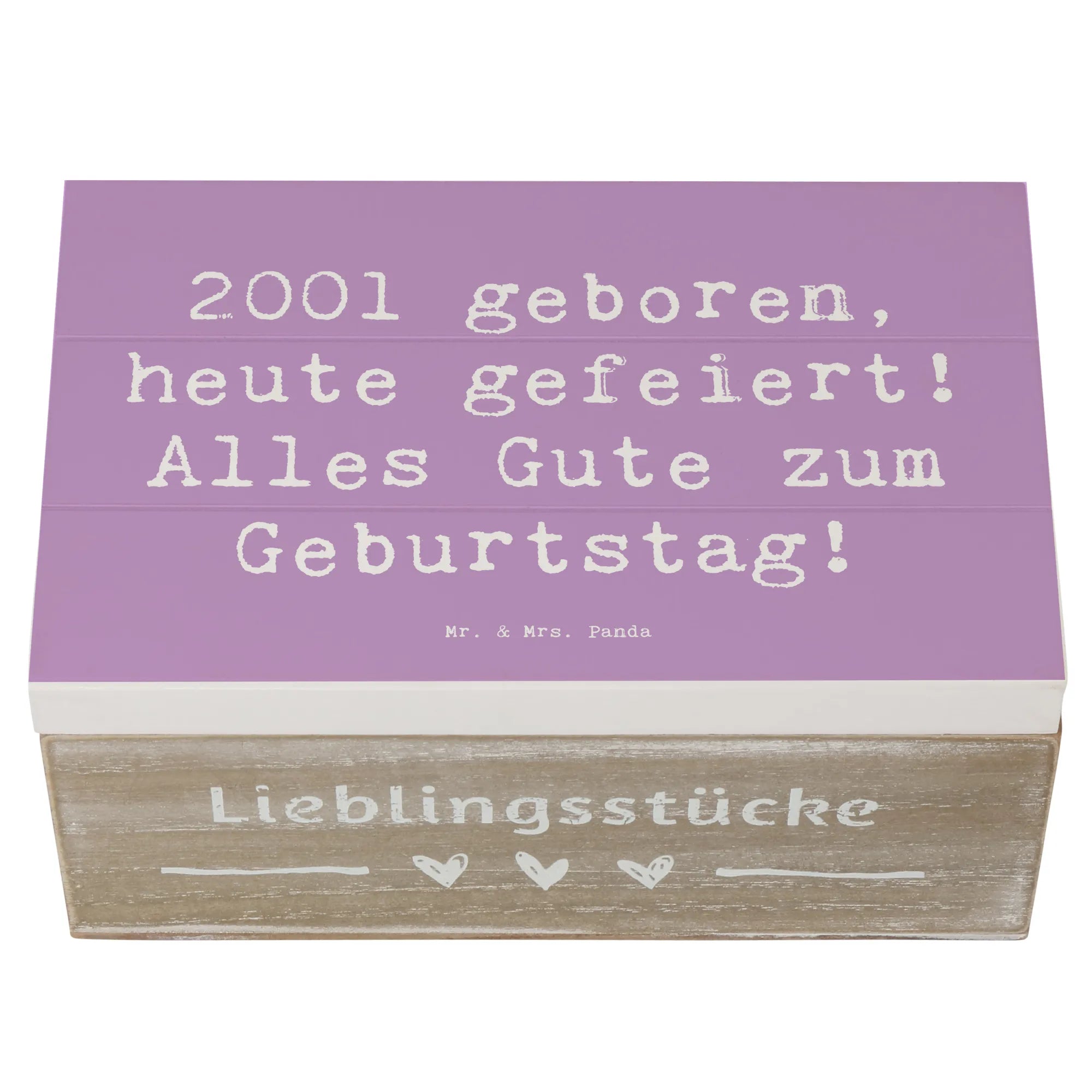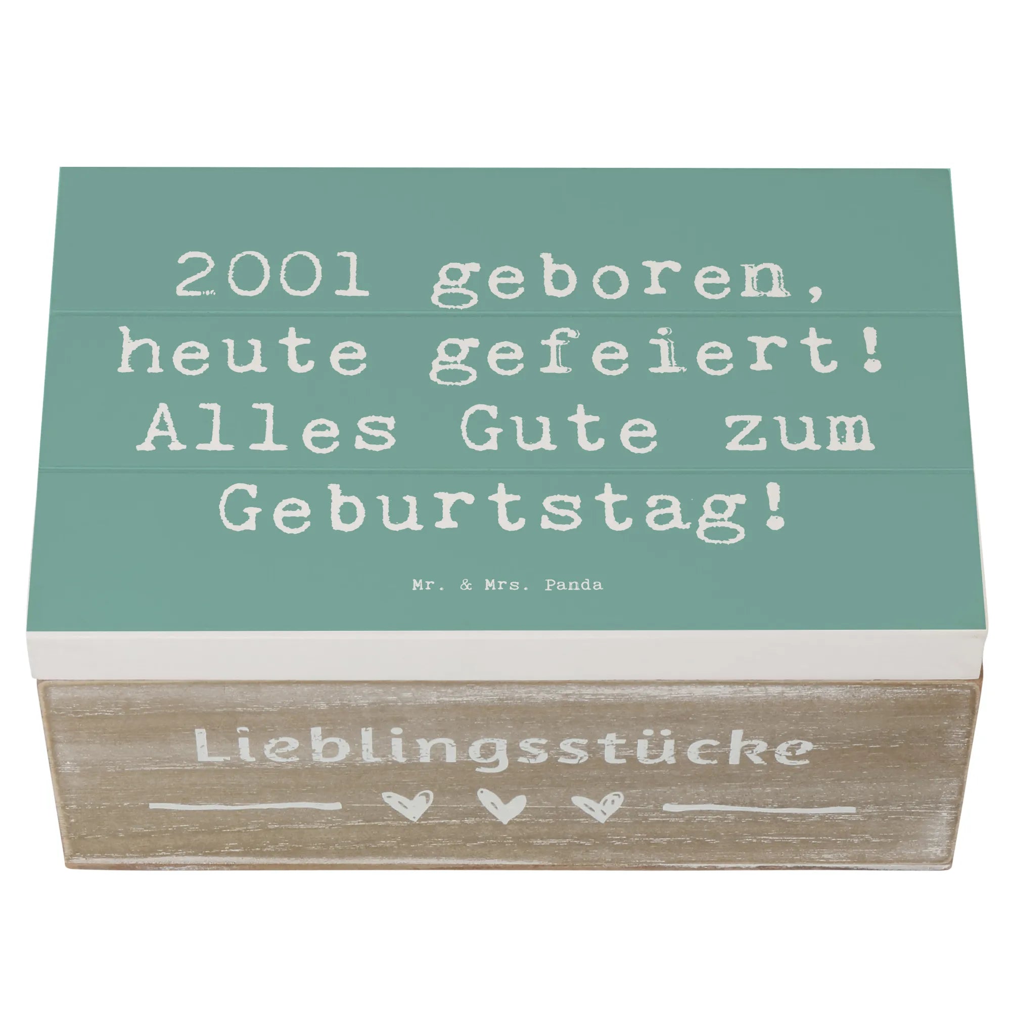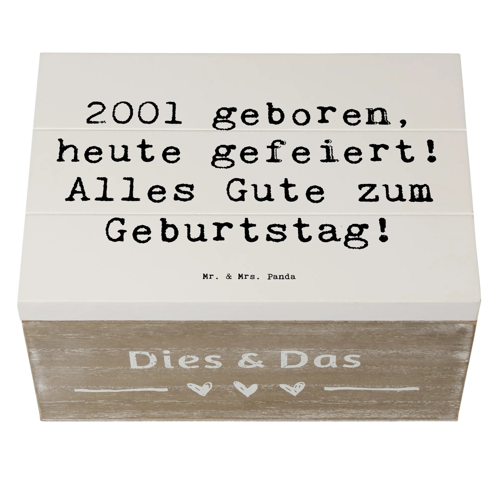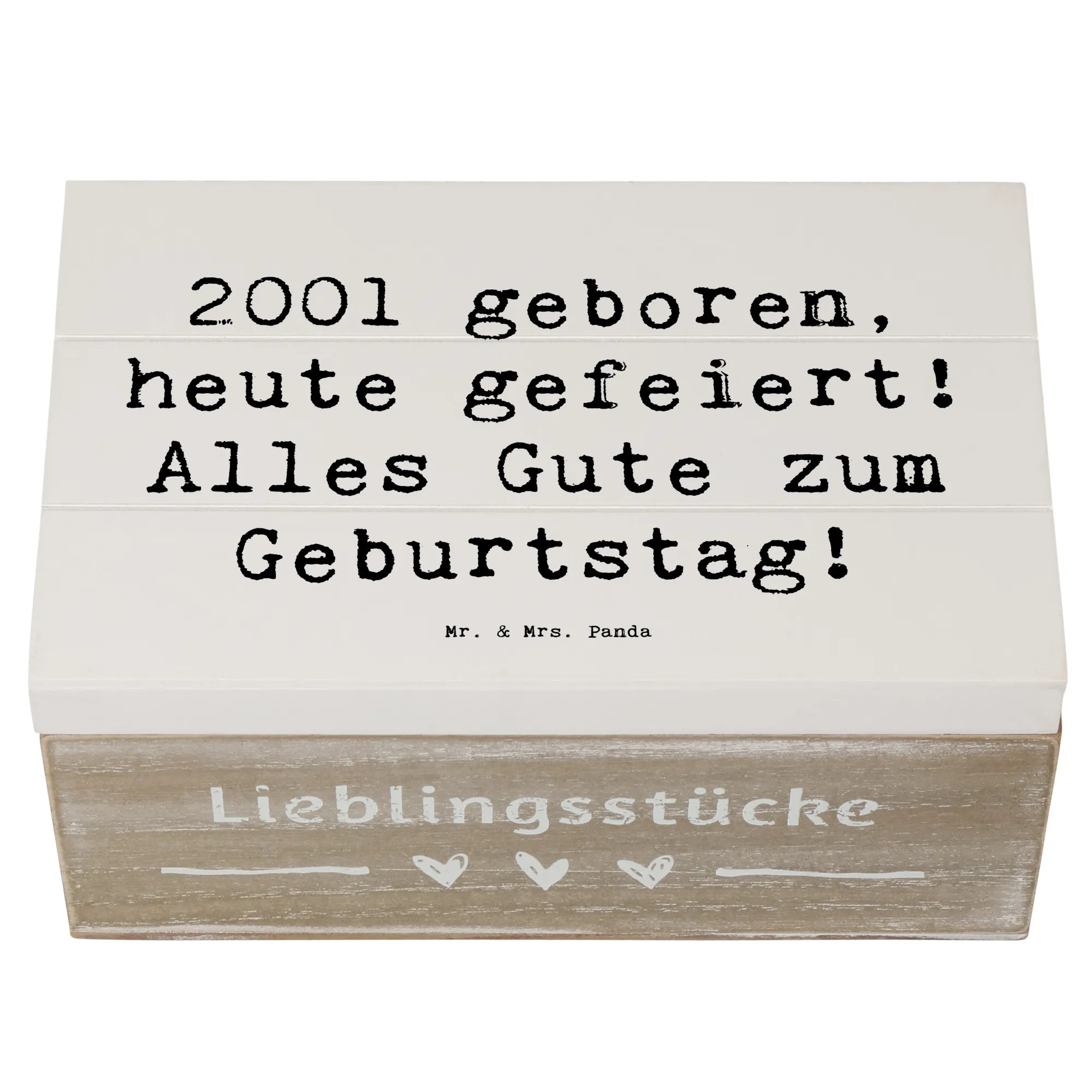 Entdecke die wunderschöne Holzkiste von Mr. & Mrs. Panda für den besonderen Geburtstag eines 2001 Geborenen! Diese Erinnerungskiste ist mehr als nur eine Aufbewahrungsbox – sie ist ein echter Schatz für all die wertvollen Erinnerungen, die du im Laufe der Jahre sammeln wirst.