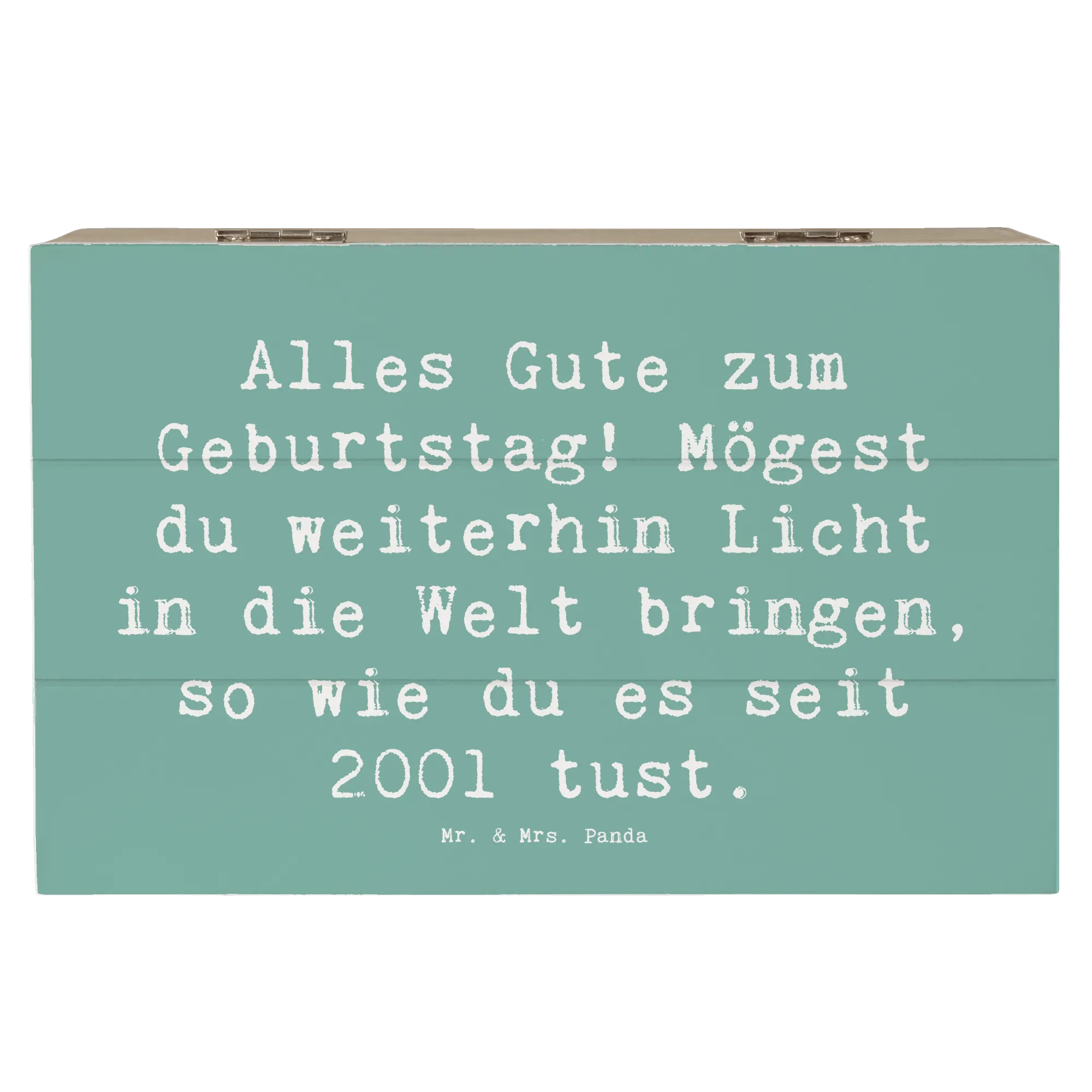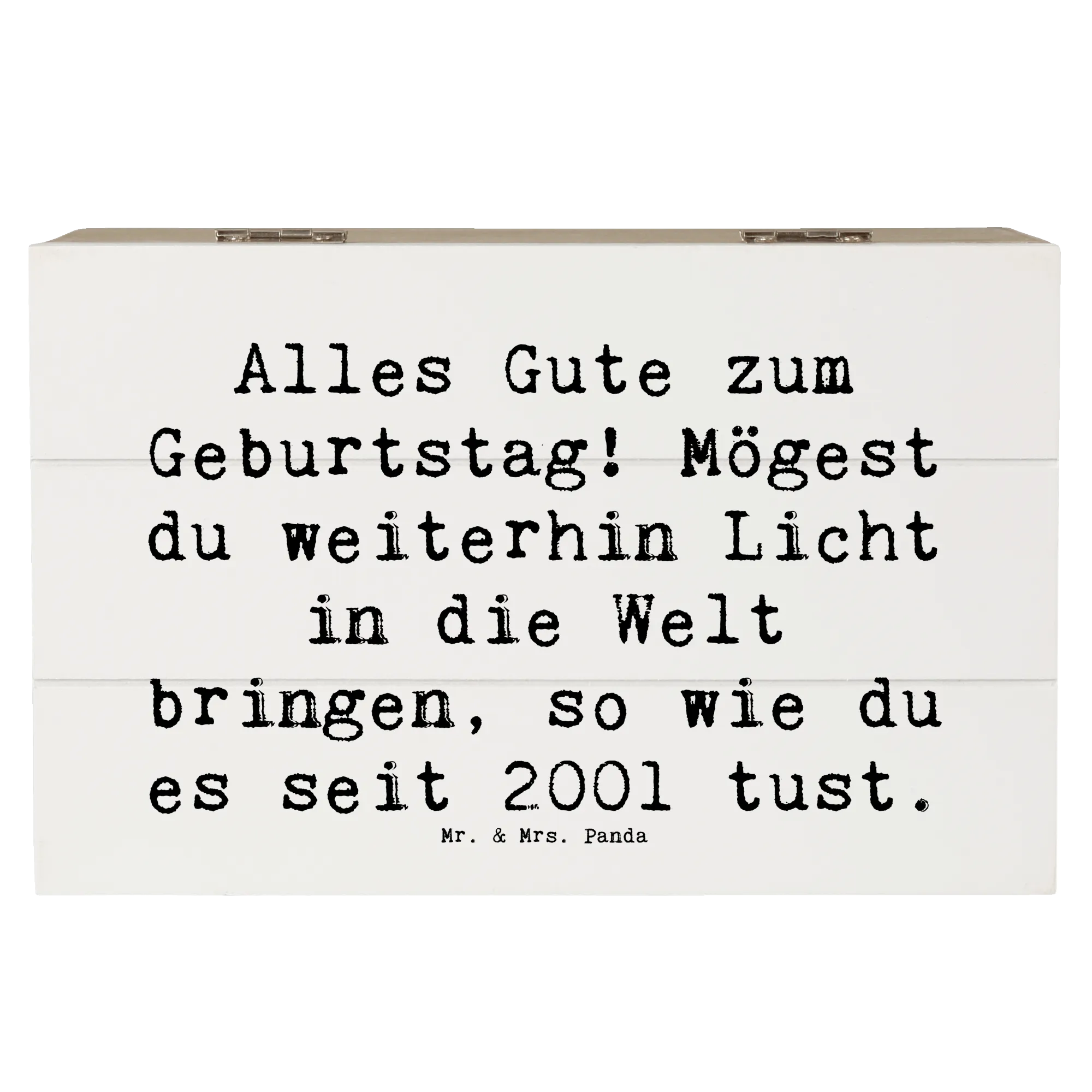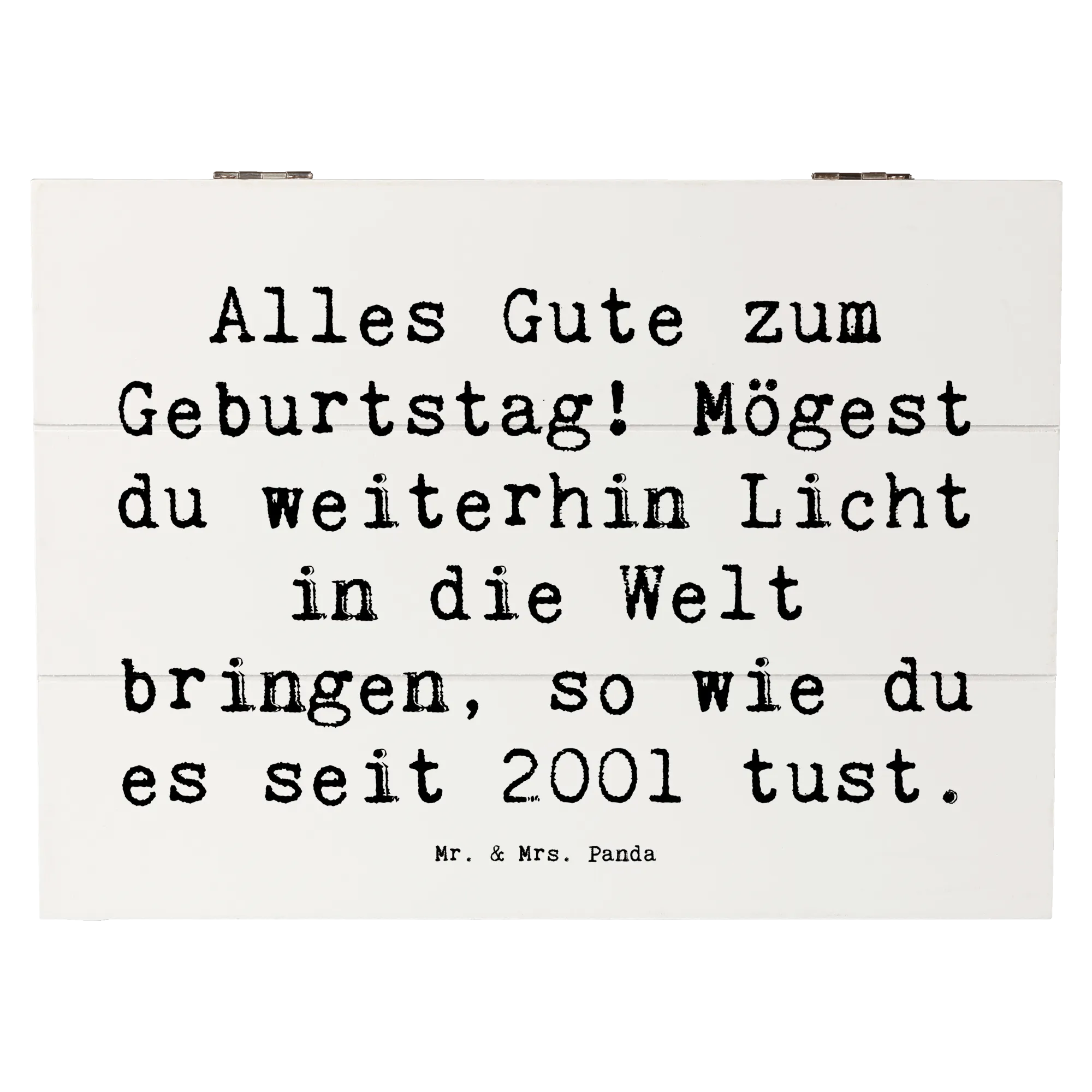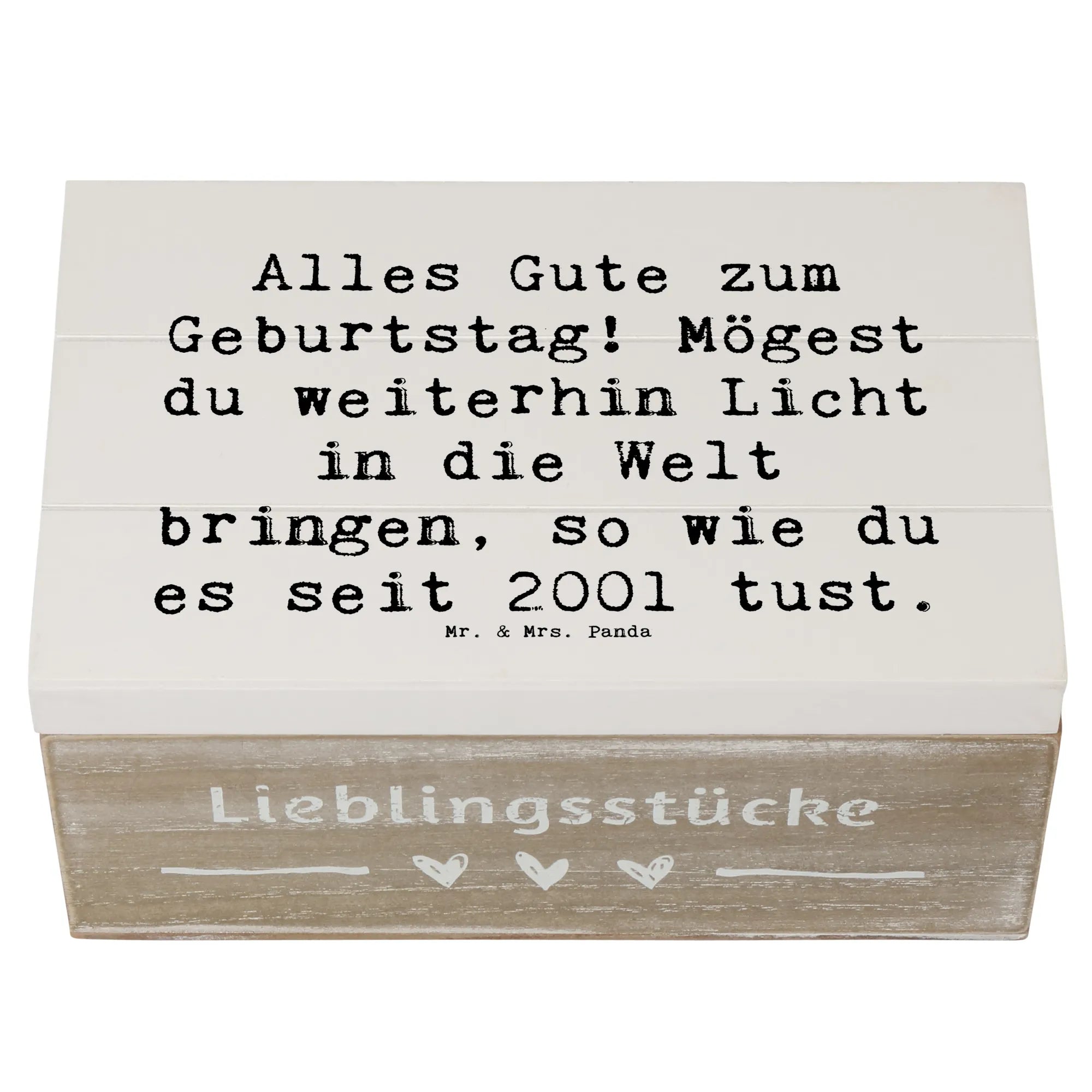 Die Holzkiste "2001 Geburtstag" von Mr. & Mrs. Panda ist das perfekte Geschenk für alle, die ihren besonderen Tag stilvoll und nachhaltig feiern möchten. Egal, ob du auf der Suche nach einem ausgefallenen Geburtstagsgeschenk oder einer liebevollen Erinnerungskiste für das Geburtstagskind bist – diese wunderschöne Holzkiste ist eine außergewöhnliche Wahl! Mit dem aufgedruckten Spruch "Alles Gute zum Geburtstag! Mögest du weiterhin Licht in die Welt bringen, so wie du es seit 2001 tust." versprühst du nicht nur Freude, sondern schaffst auch bleibende Erinnerungen.