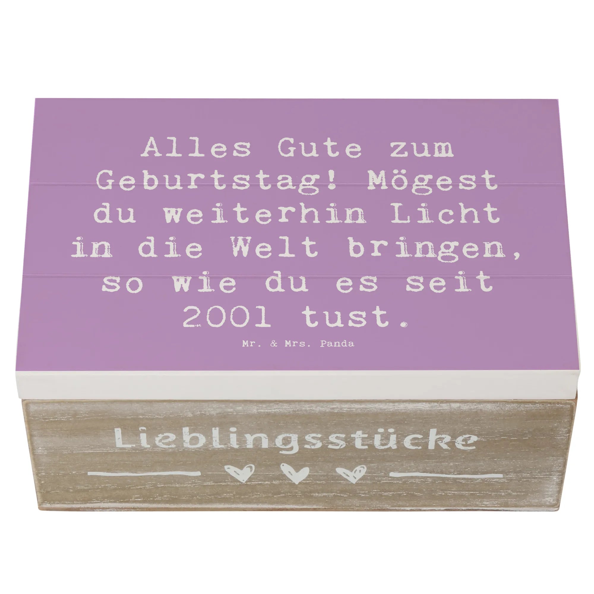 Die Holzkiste 2001 Geburtstag von Mr. & Mrs. Panda ist das perfekte Geschenk für alle, die im Jahr 2001 das Licht der Welt erblickt haben! Sie bietet nicht nur einen stilvollen Aufbewahrungsort von Erinnerungen, sondern bringt auch eine liebevolle Botschaft mit sich. „Alles Gute zum Geburtstag! Mögest du weiterhin Licht in die Welt bringen, so wie du es seit 2001 tust.“