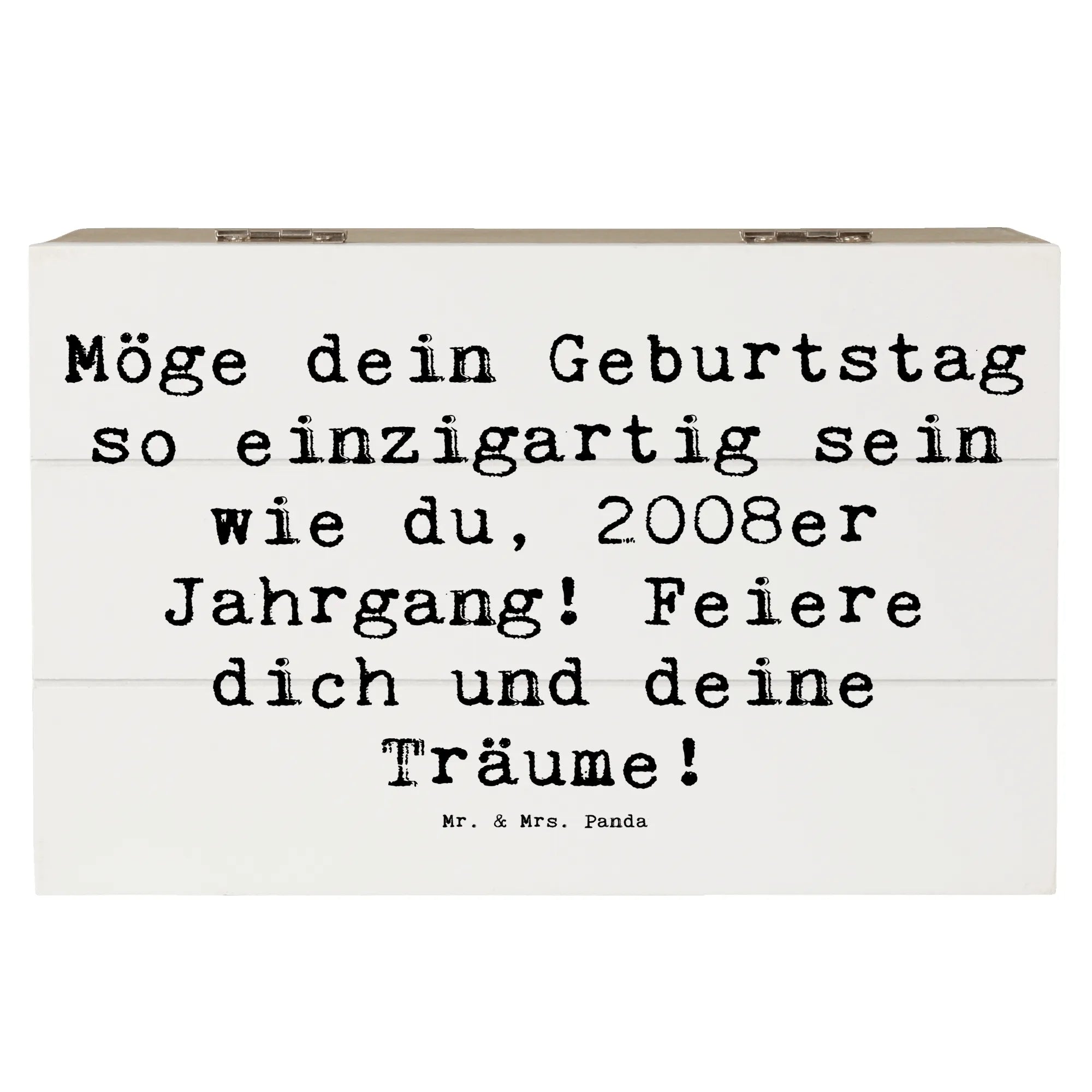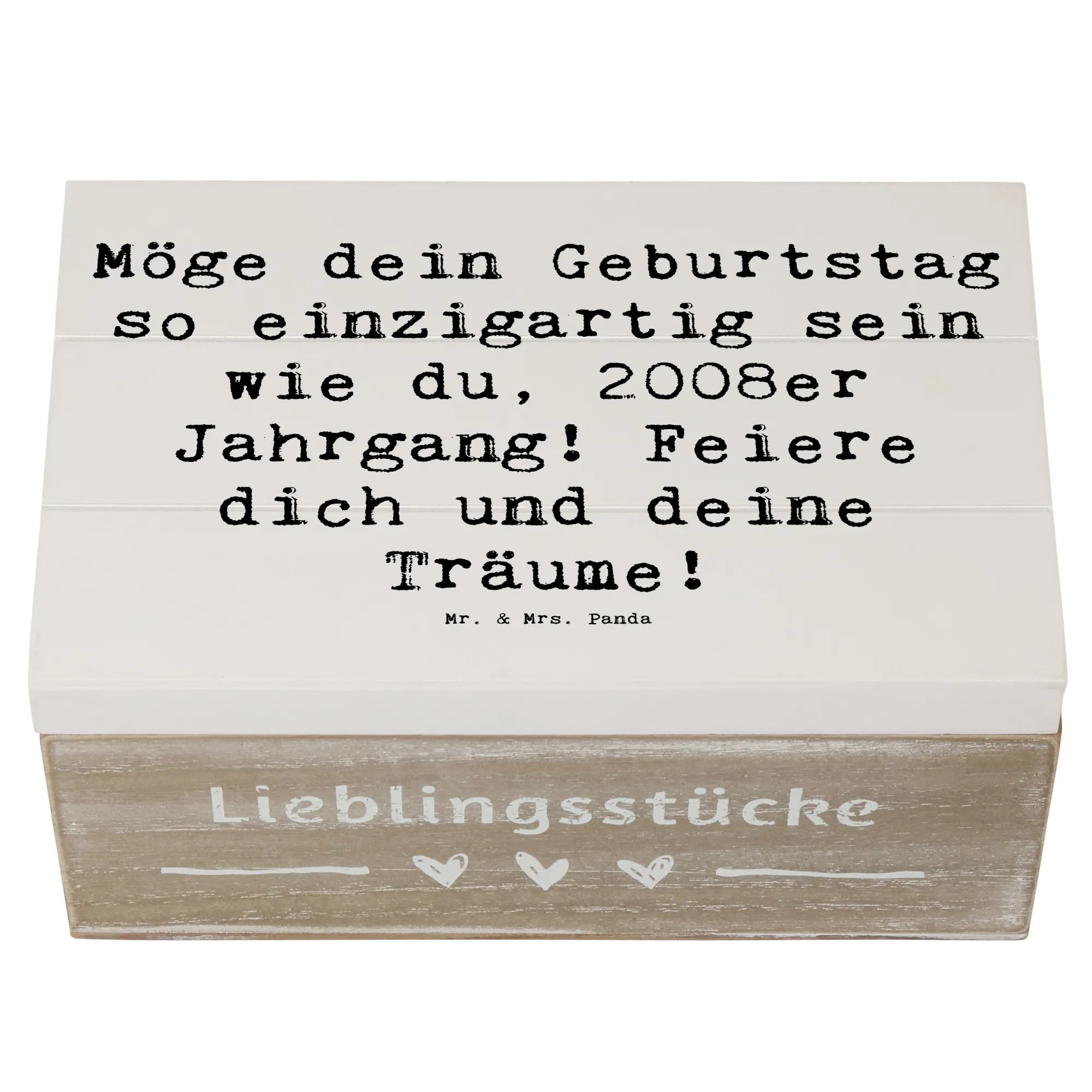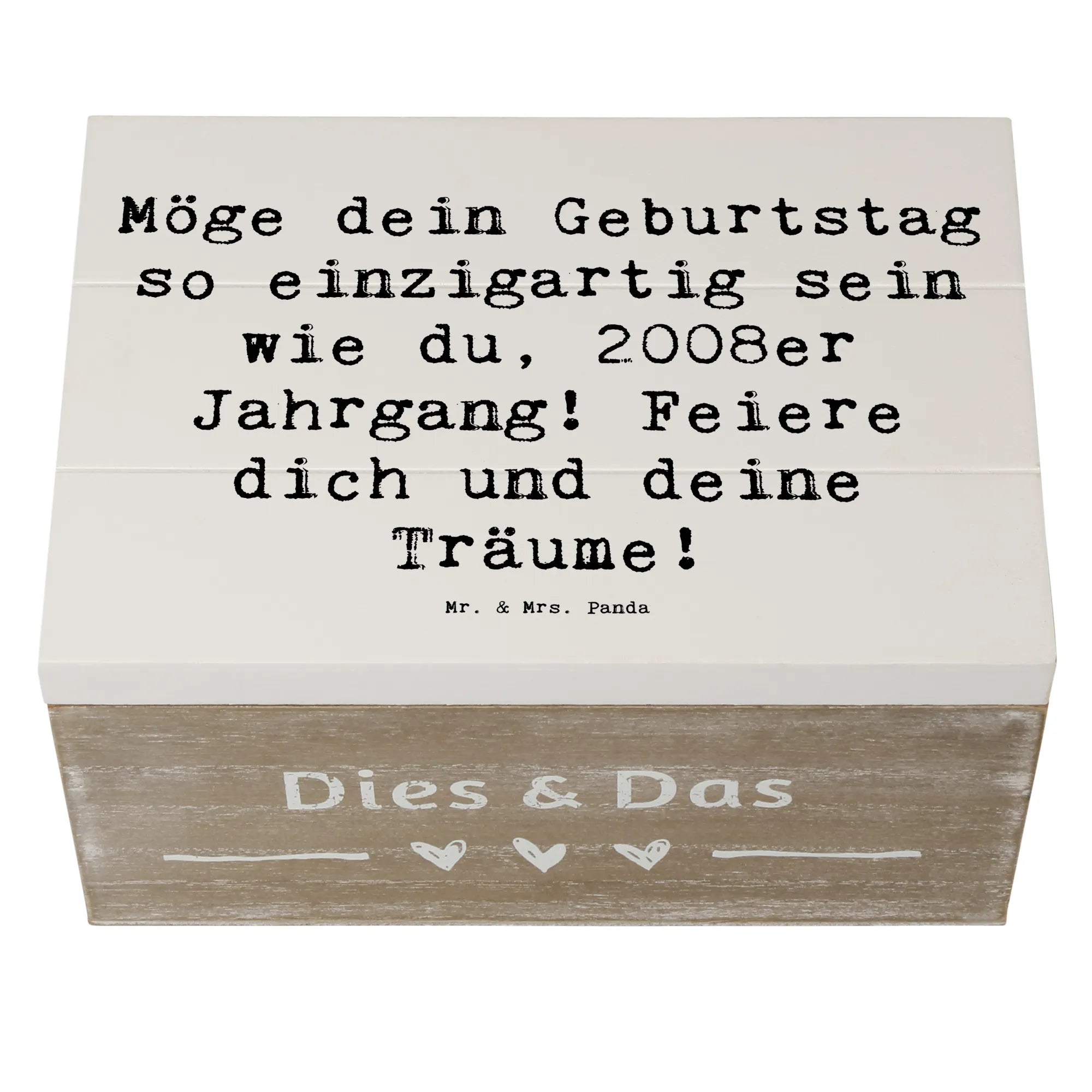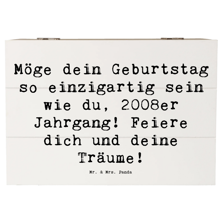 Die wunderschöne Holzkiste von Mr. & Mrs. Panda ist das perfekte Geschenk für jeden, der 2008 geboren wurde! Mit dem liebevollen Spruch "Möge dein Geburtstag so einzigartig sein wie du, 2008er Jahrgang! Feiere dich und deine Träume!" bietet diese Kiste nicht nur Platz für wundervolle Schätze, sondern auch eine liebevolle Botschaft, die an jedem Geburtstag Freude bereitet.