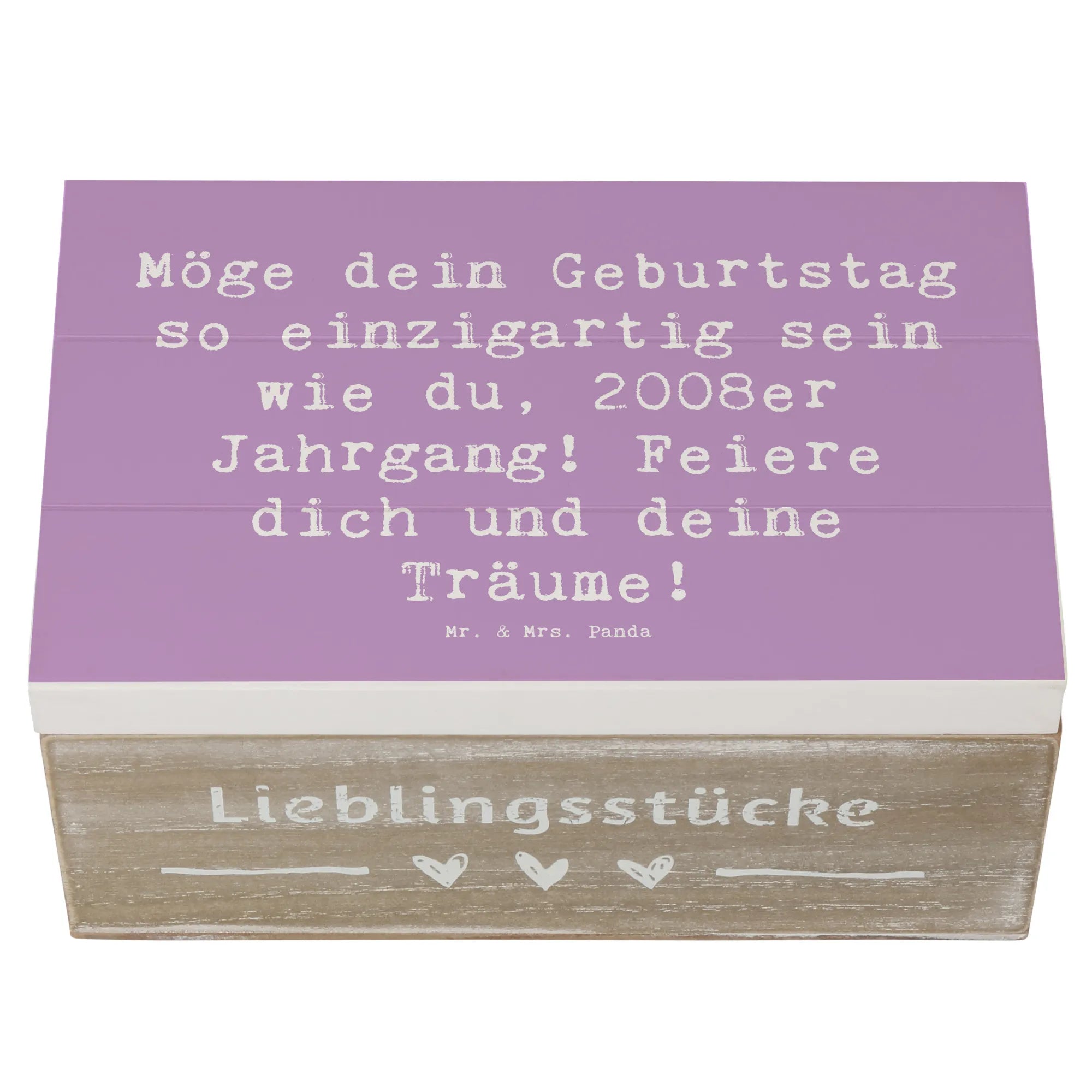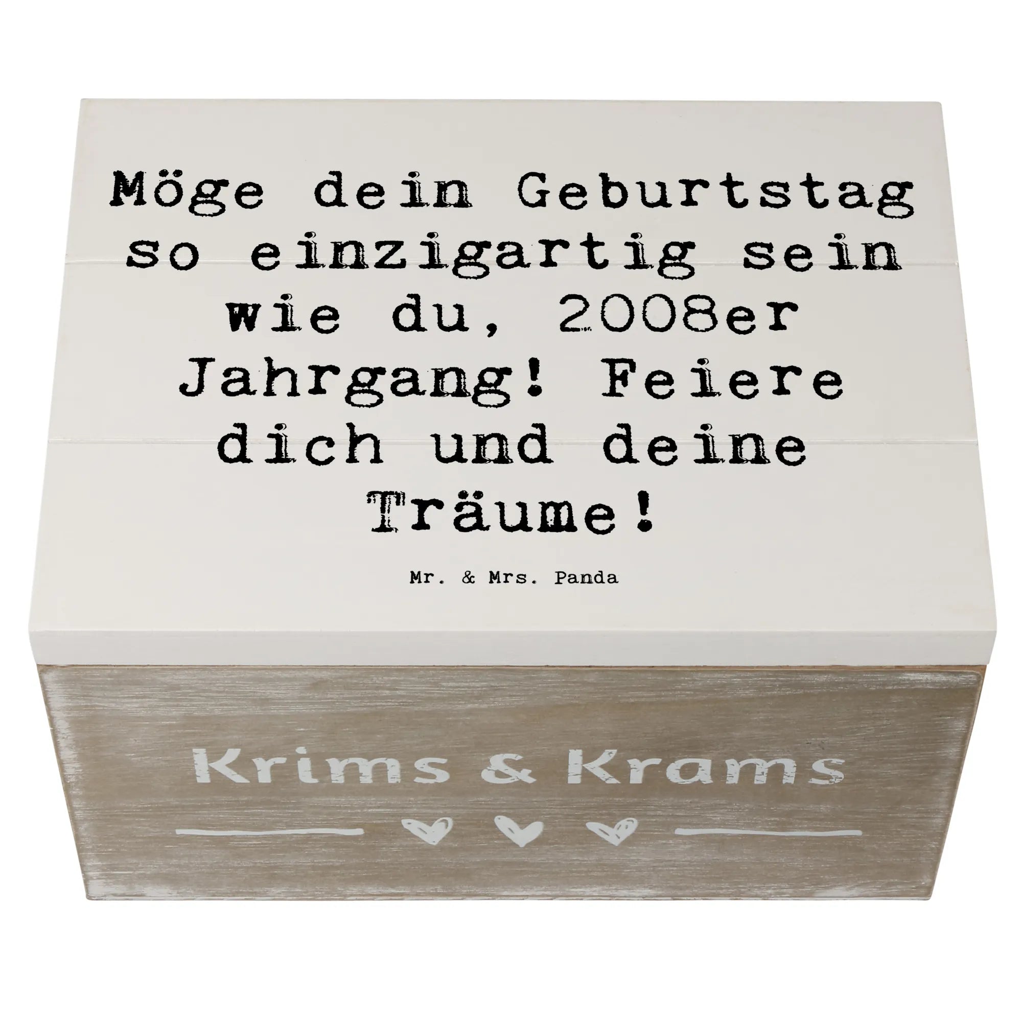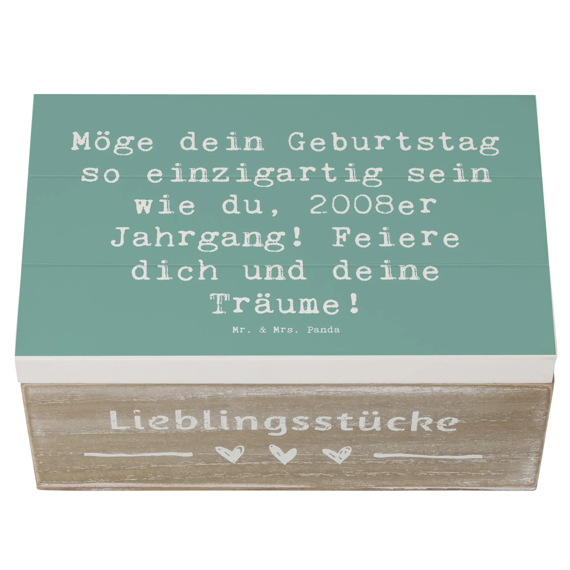 Die wunderschöne Holzkiste von Mr. & Mrs. Panda ist das perfekte Geschenk für jeden, der 2008 geboren wurde! Mit dem liebevollen Spruch "Möge dein Geburtstag so einzigartig sein wie du, 2008er Jahrgang! Feiere dich und deine Träume!" bietet diese Kiste nicht nur Platz für wundervolle Schätze, sondern auch eine liebevolle Botschaft, die an jedem Geburtstag Freude bereitet.