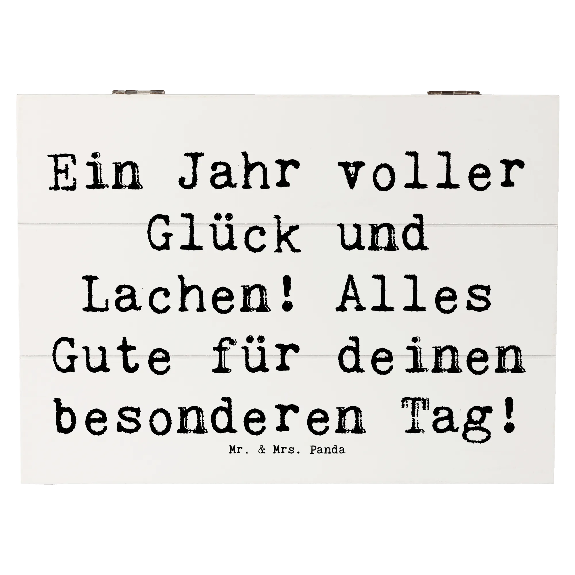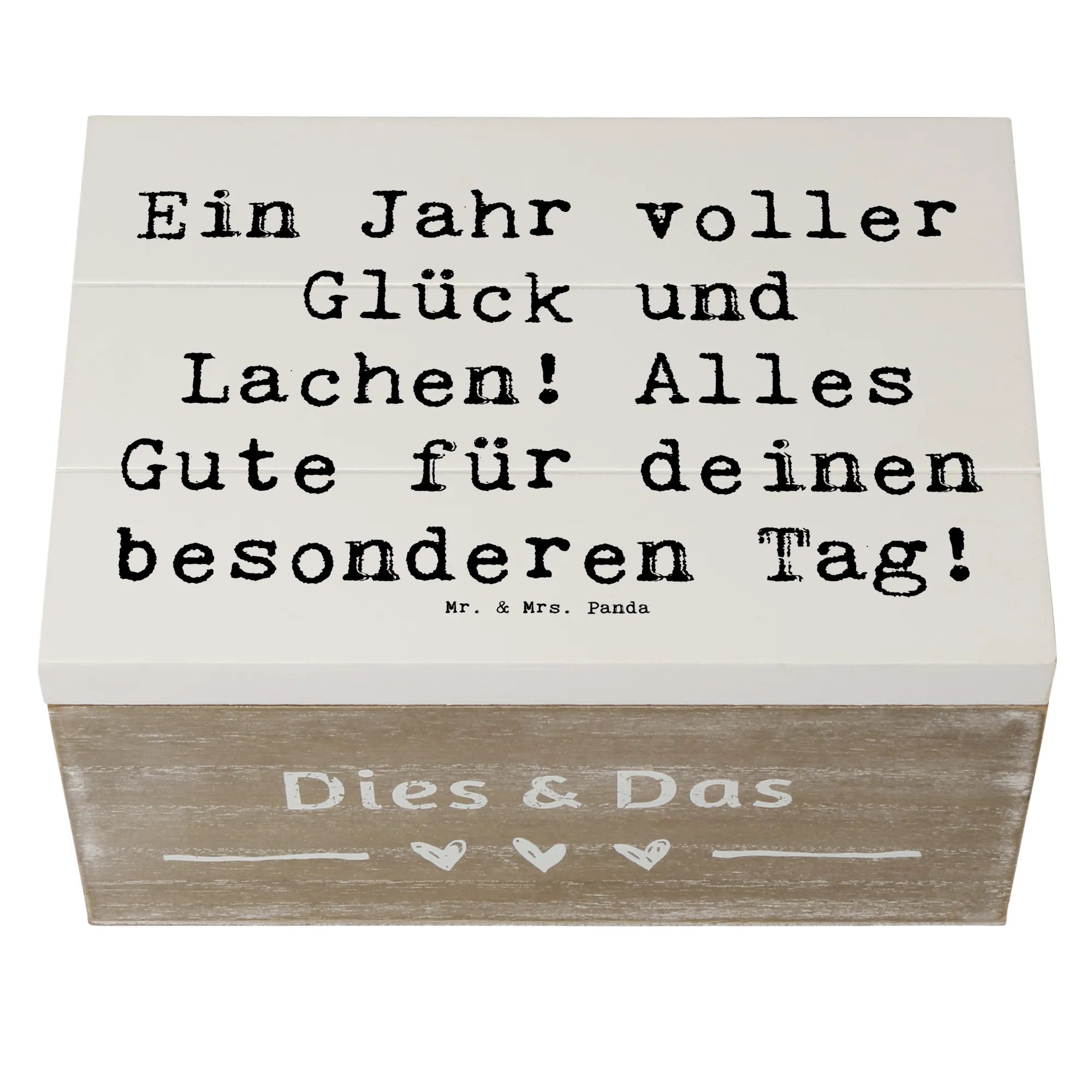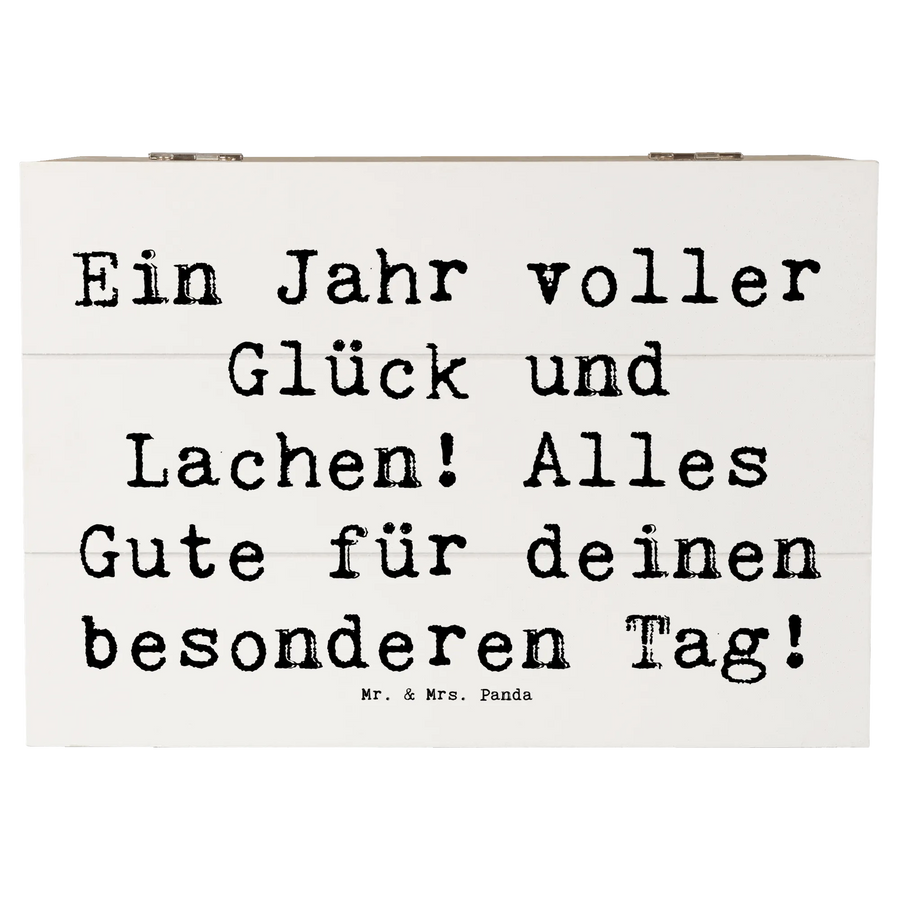Die eingearbeiteten Einschlagscharniere sorgen dafür, dass du die Truhe jederzeit leicht öffnen und schließen kannst. Mit dem fröhlichen Spruch 'Ein Jahr voller Glück und Lachen! Alles Gute für deinen besonderen Tag!' versprüht die Kiste pure Lebensfreude und Glück. Sie ist nicht personalisierbar, aber das macht sie umso besser als durchdachtes Geschenk.