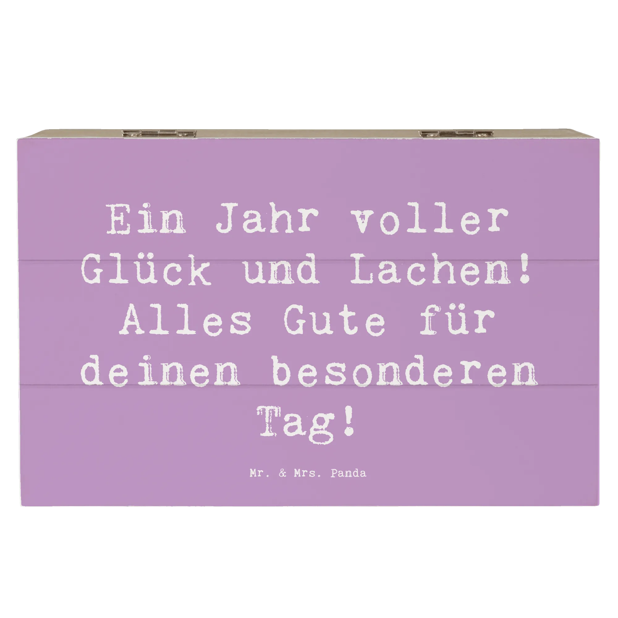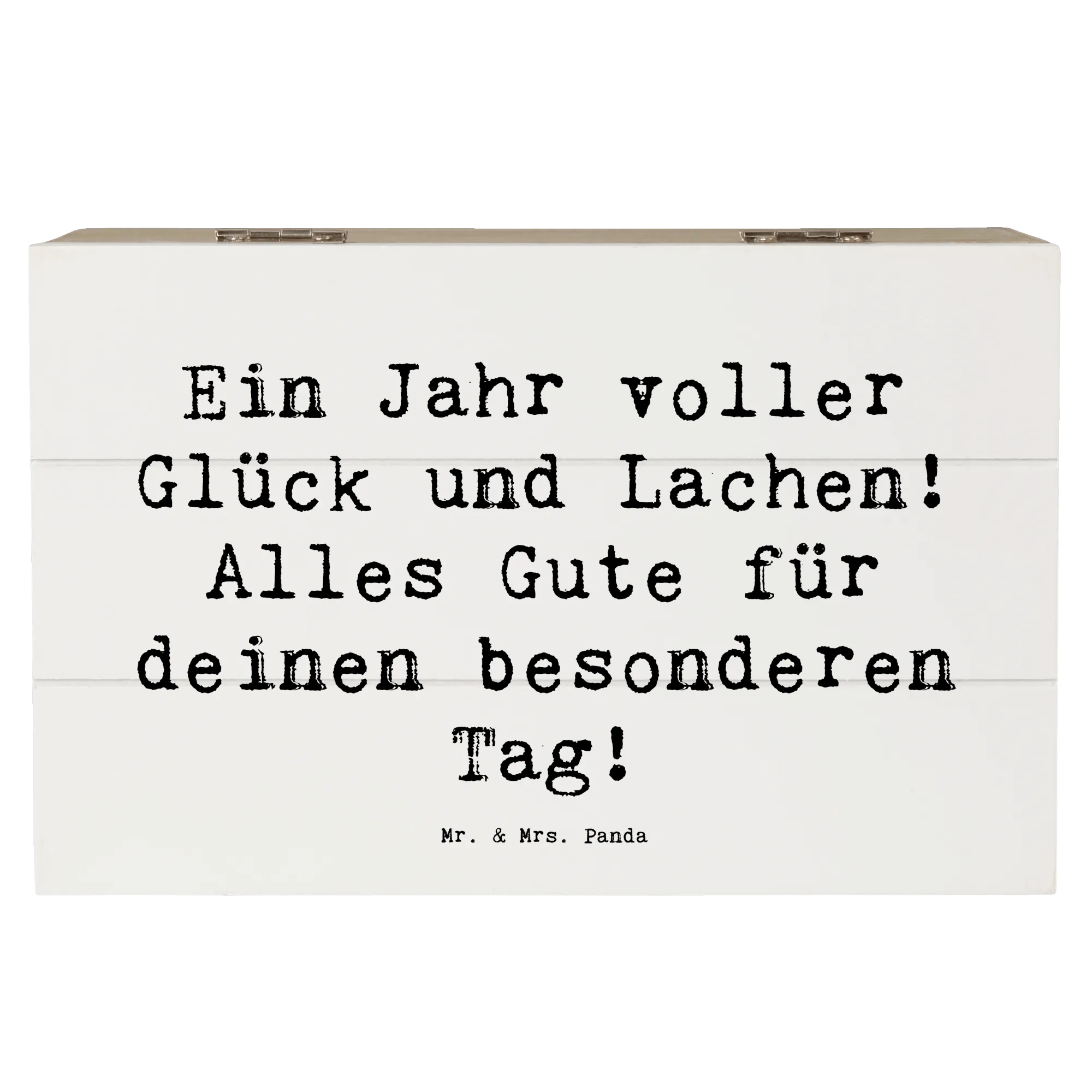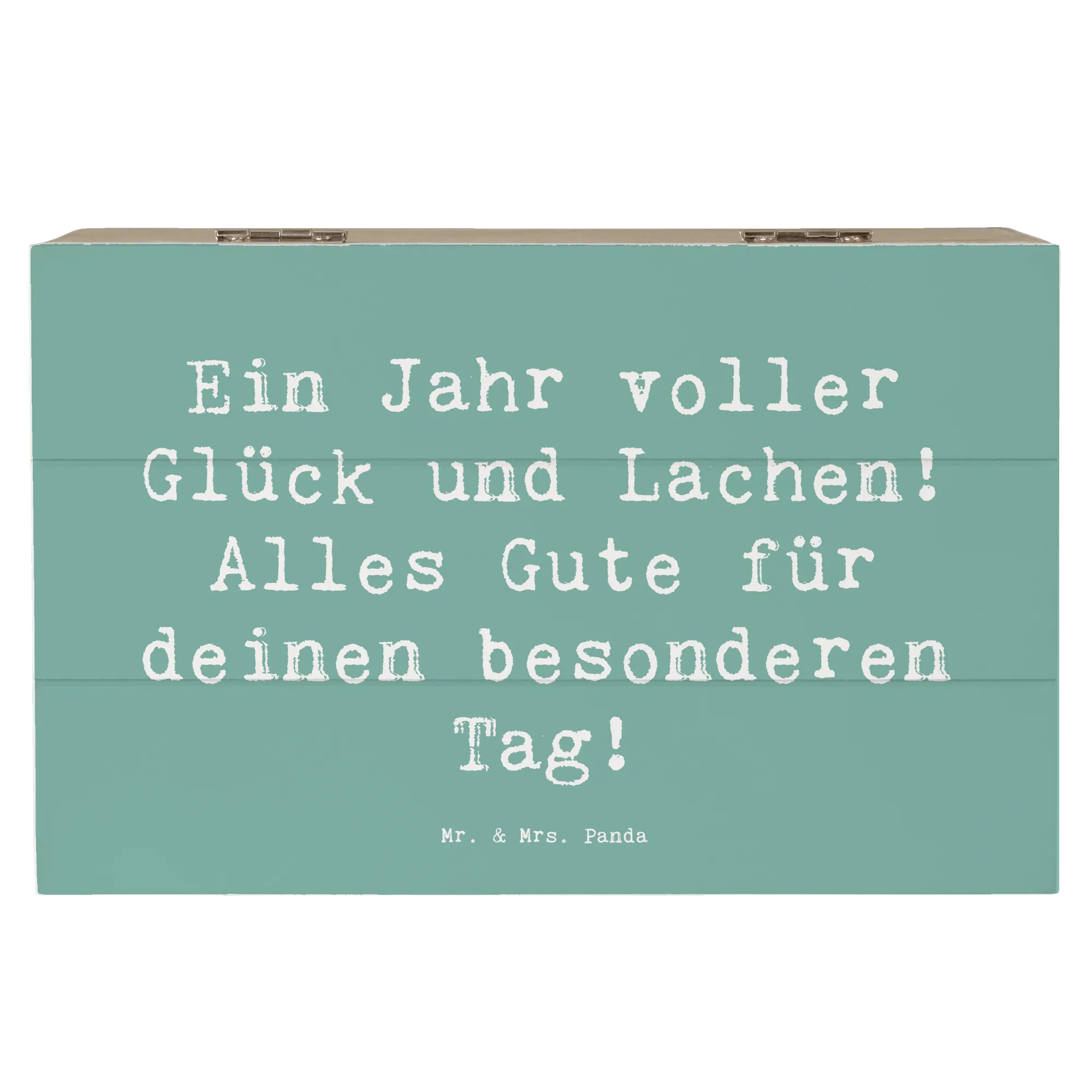 Die eingearbeiteten Einschlagscharniere sorgen dafür, dass du die Truhe jederzeit leicht öffnen und schließen kannst. Mit dem fröhlichen Spruch 'Ein Jahr voller Glück und Lachen! Alles Gute für deinen besonderen Tag!' versprüht die Kiste pure Lebensfreude und Glück. Sie ist nicht personalisierbar, aber das macht sie umso besser als durchdachtes Geschenk.