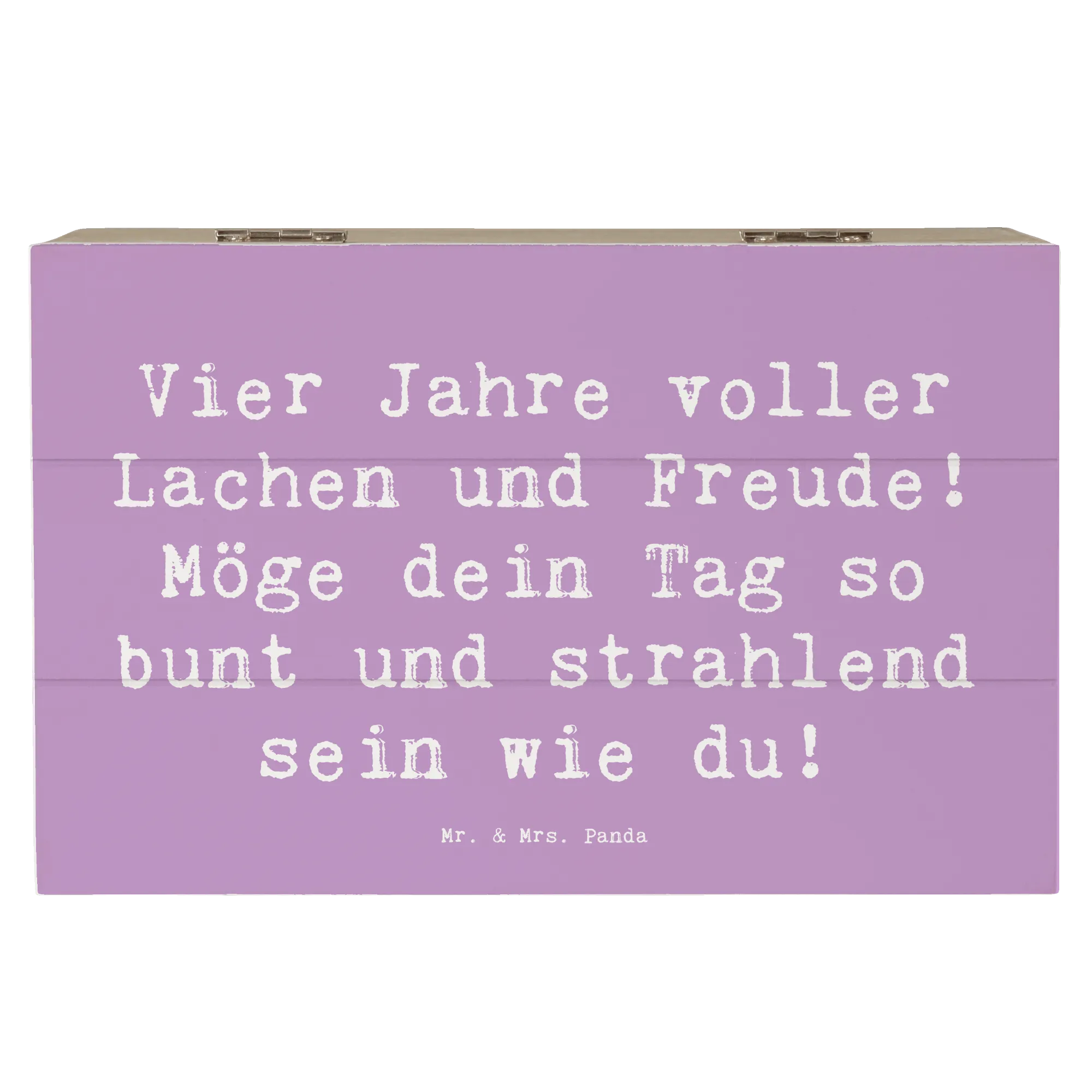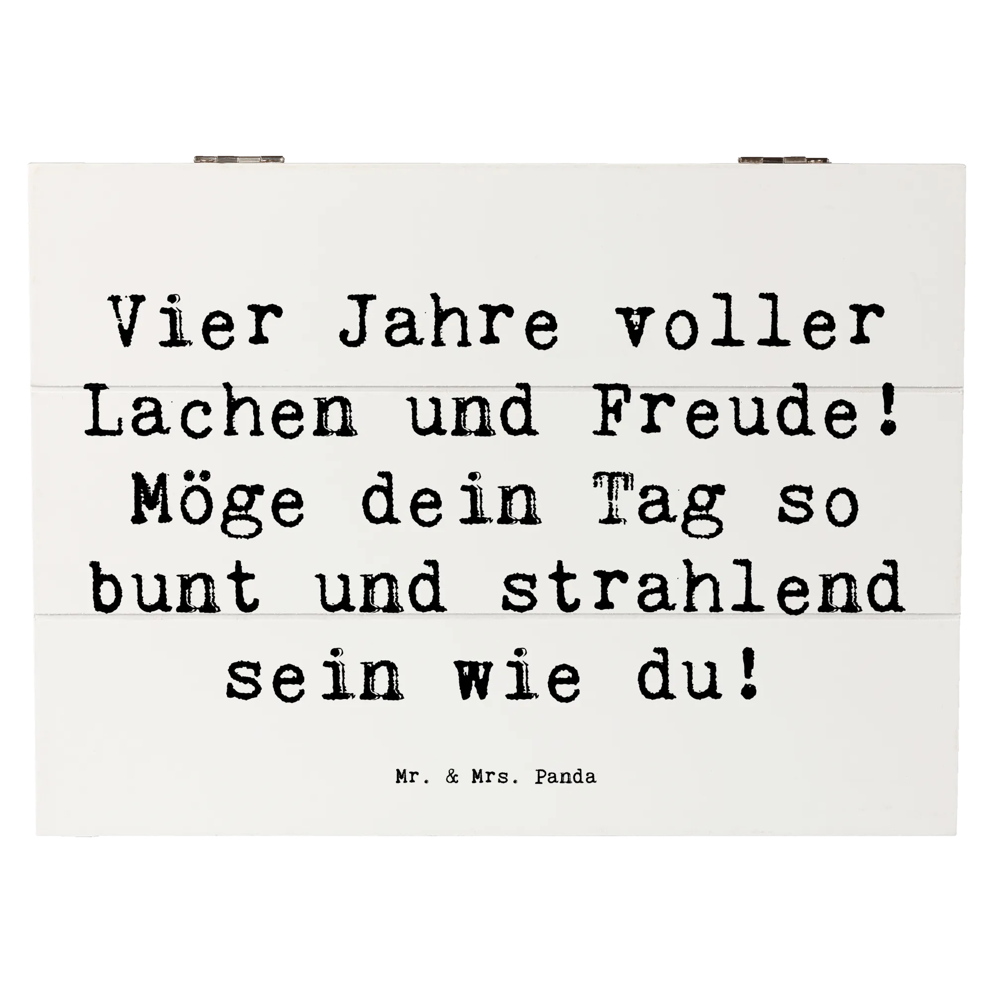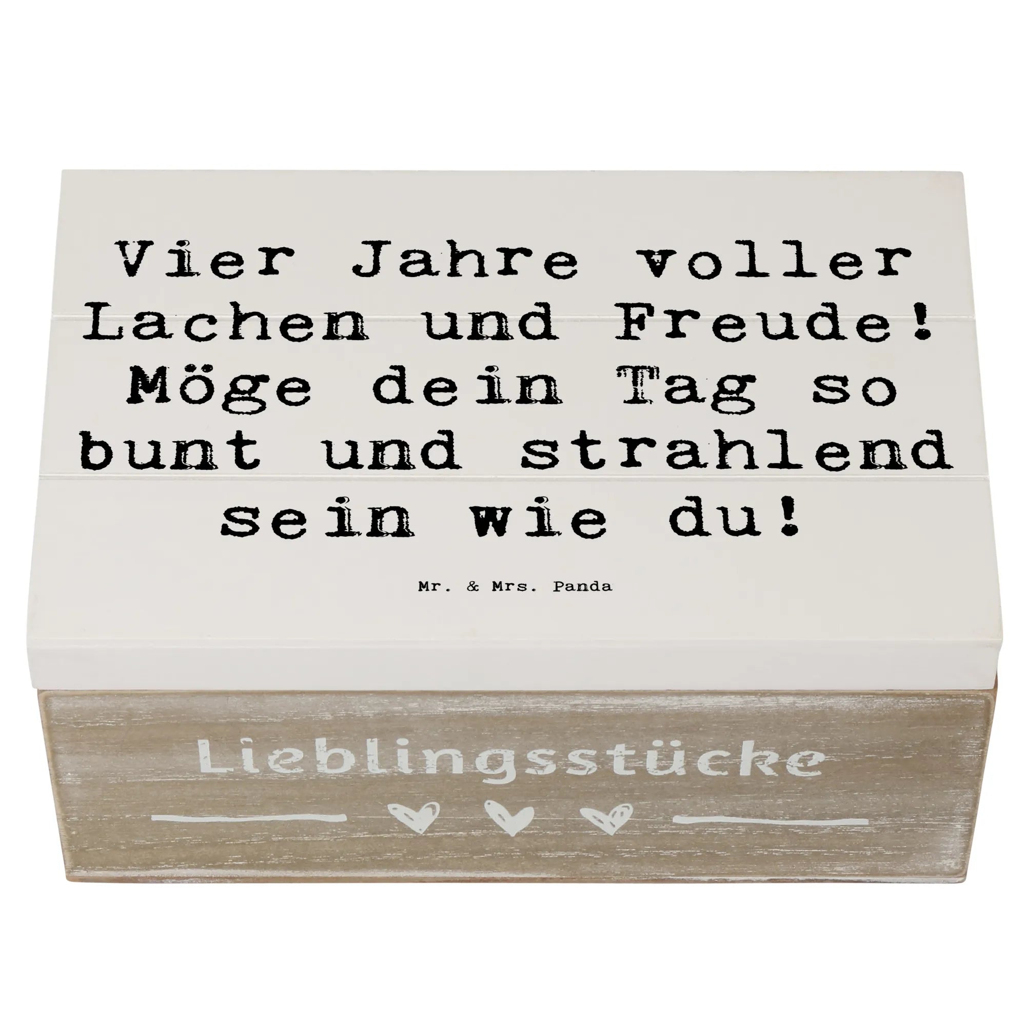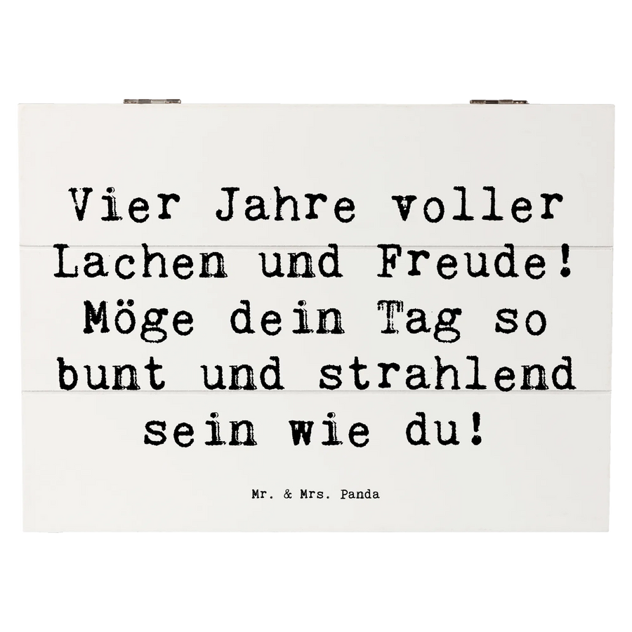 Die wunderschöne Holzkiste zum 4. Geburtstag aus der Kollektion ‚Geburtstag Alter‘ von Mr. & Mrs. Panda ist das perfekte Geschenk für kleine Abenteurer und Sammler von Erinnerungen. Mit ihrem liebevoll gestalteten Design und dem herzerwärmenden Slogan „Vier Jahre voller Lachen und Freude! Möge dein Tag so bunt und strahlend sein wie du!“, bringt sie Freude in jedes Kinderzimmer.