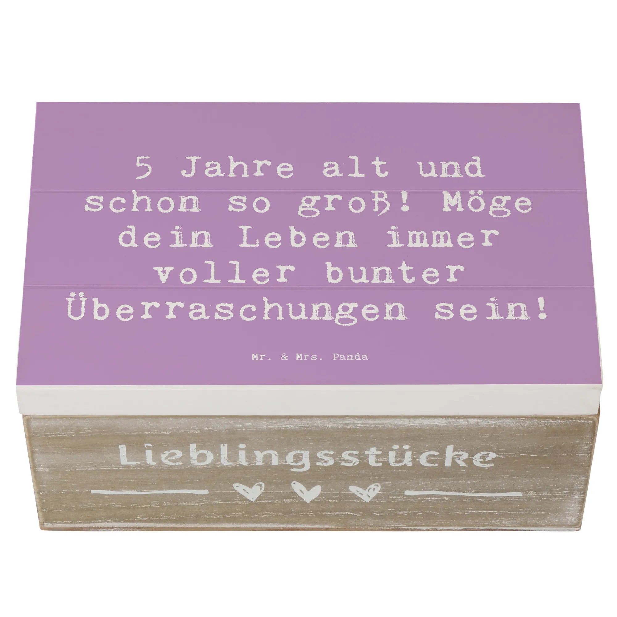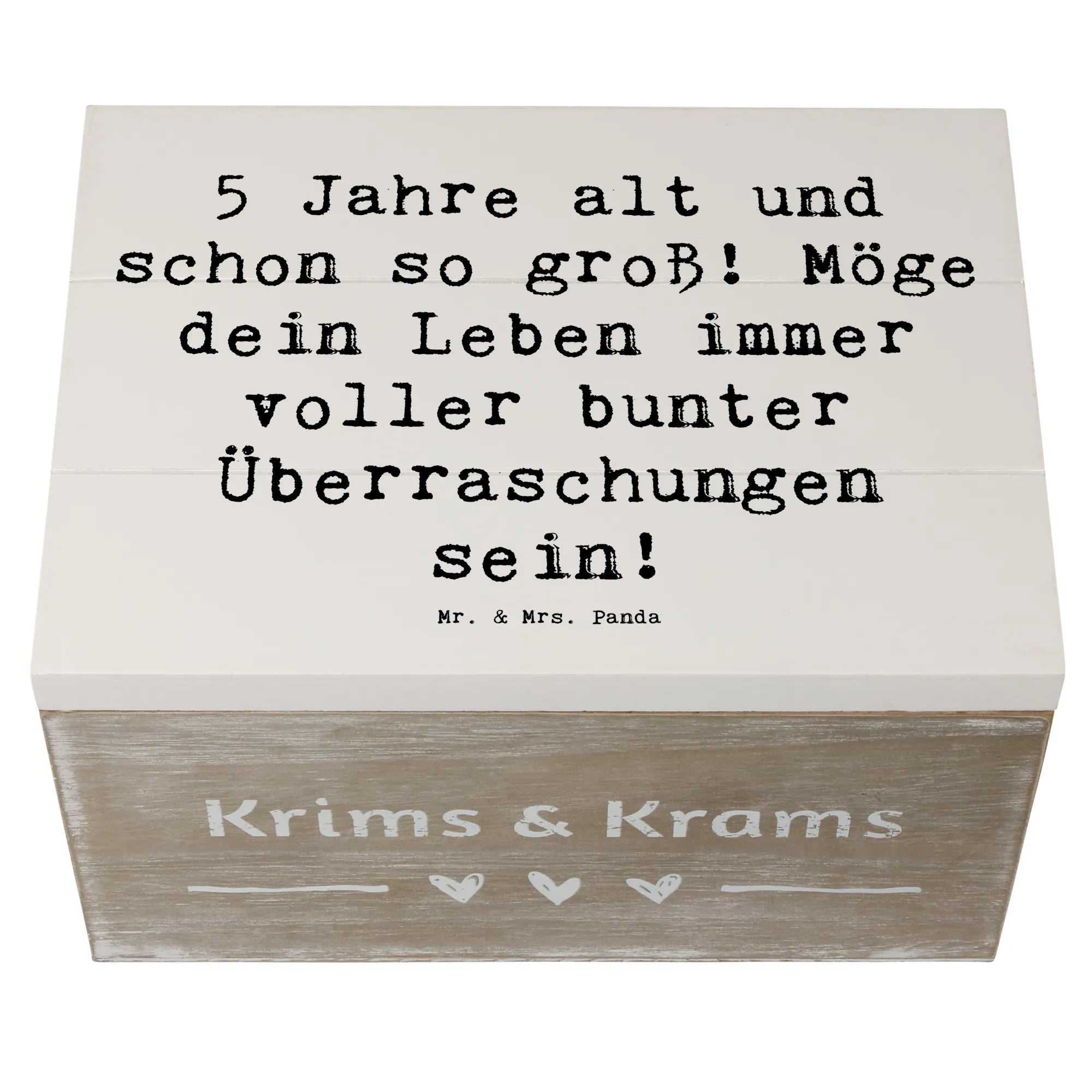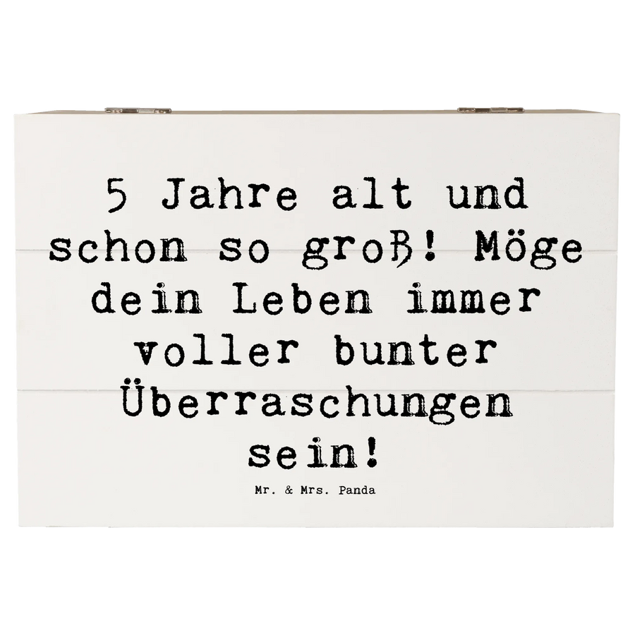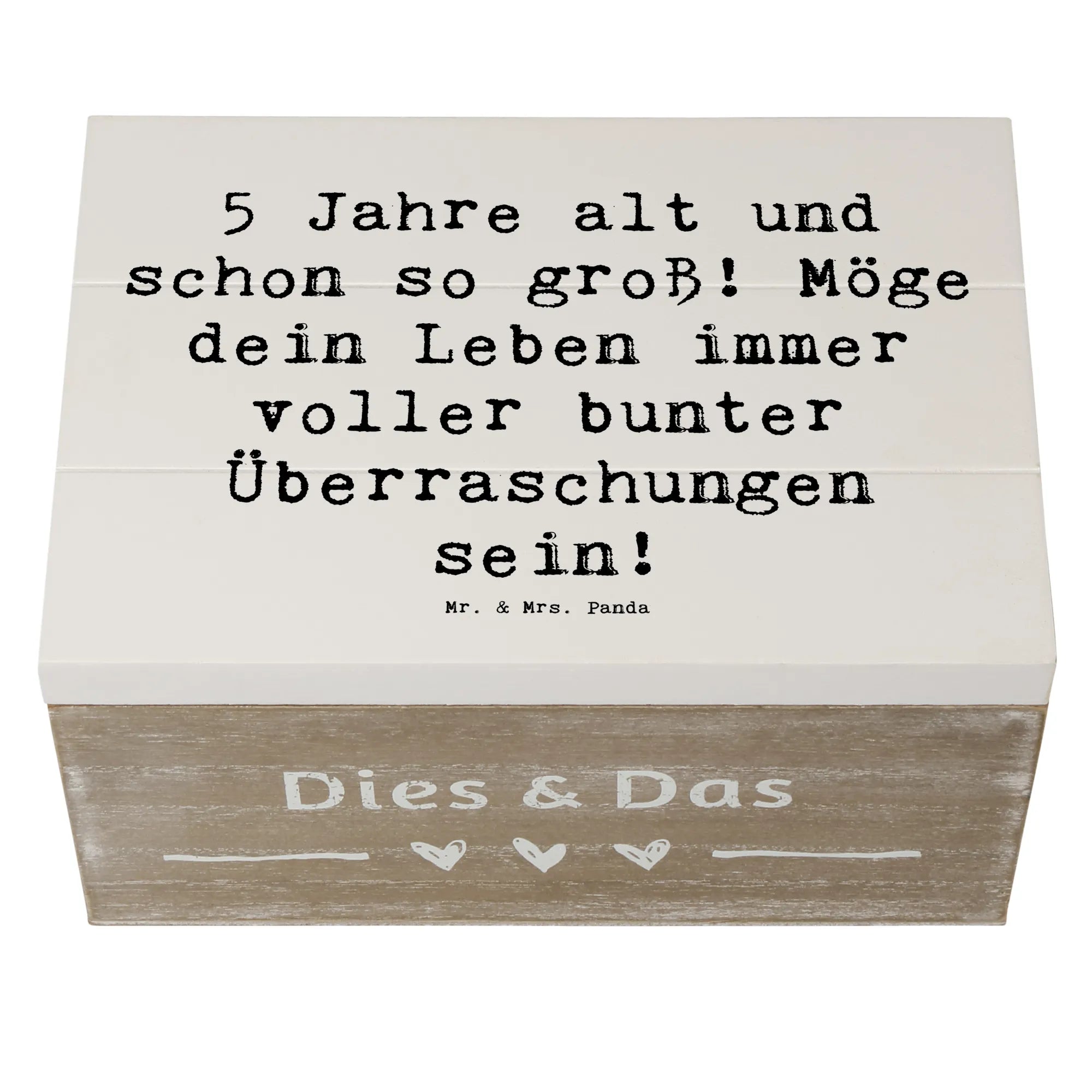 Entdecke die bezaubernde Holzkiste von Mr. & Mrs. Panda, die das perfekte Geschenk zum 5. Geburtstag ist! Diese liebevoll gestaltete Erinnerungskiste trägt den herzerwärmenden Spruch "5 Jahre alt und schon so groß! Möge dein Leben immer voller bunter Überraschungen sein!".