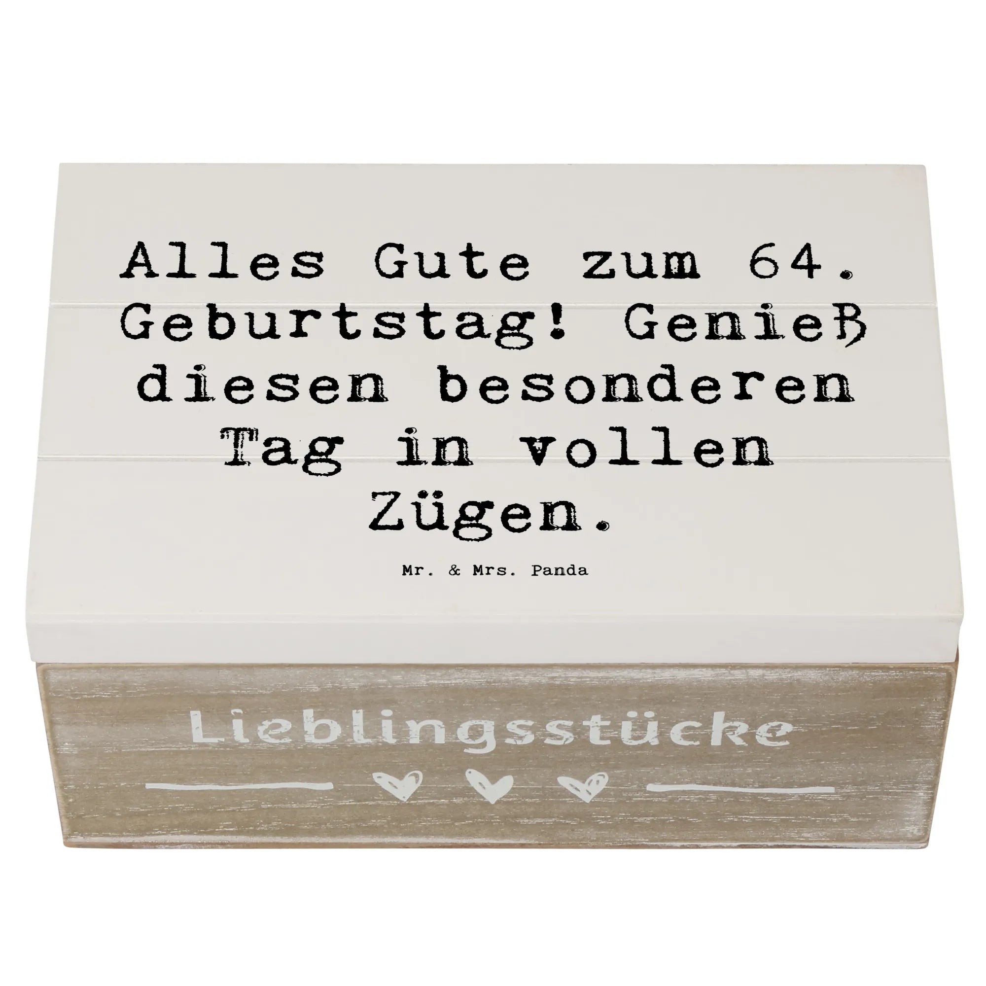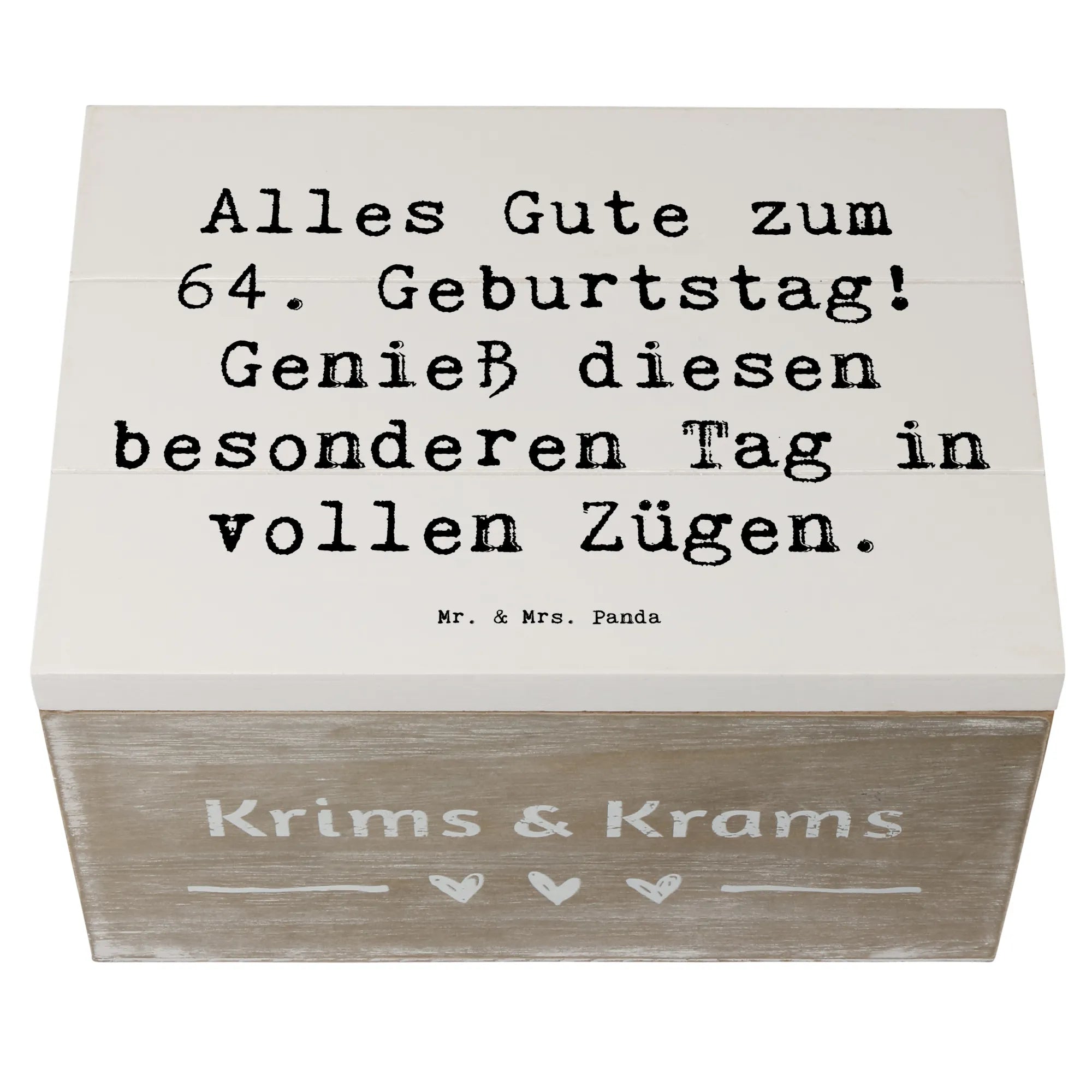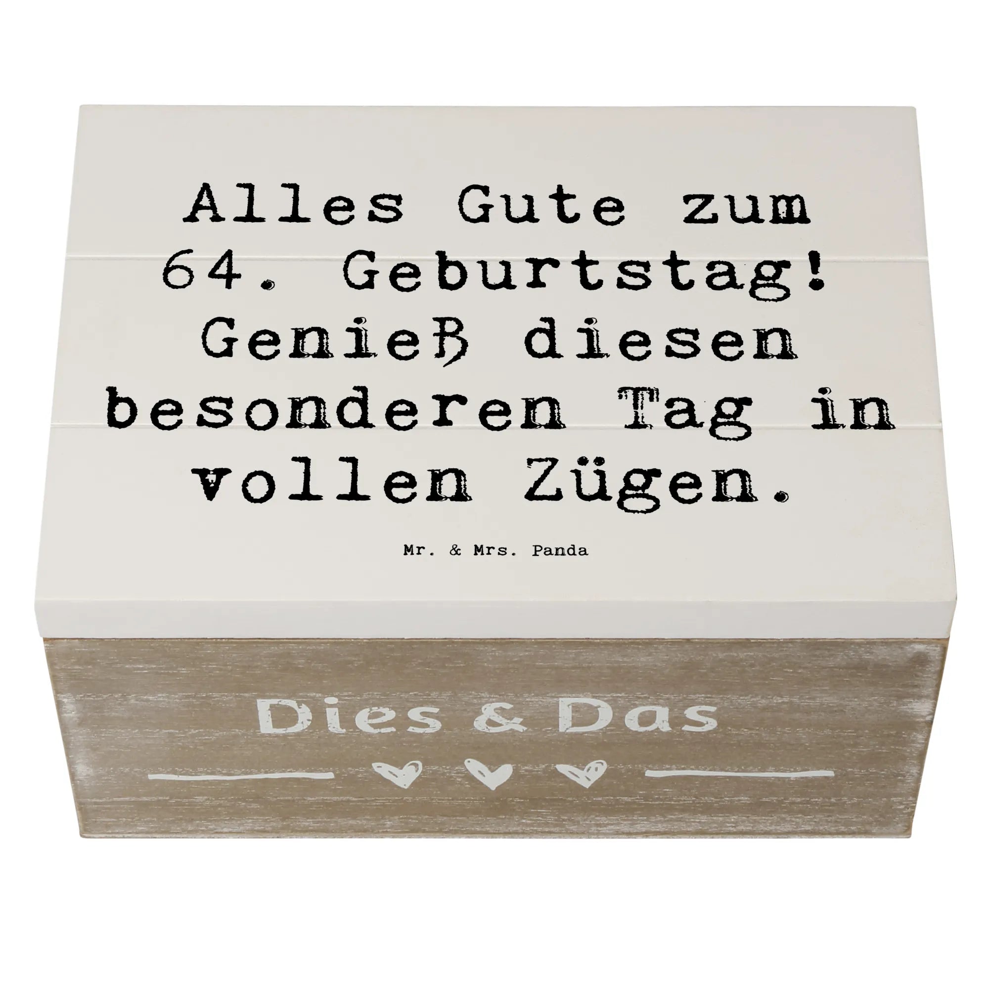 Du suchst nach dem perfekten Geschenk für einen ganz besonderen Menschen, der seinen 64. Geburtstag feiert? Unsere wunderschöne Holzkiste von Mr. & Mrs. Panda ist genau das richtige. Diese einzigartige Kiste ist nicht nur ein wunderbarer Aufbewahrungsort für wertvolle Erinnerungen, sondern auch eine liebevolle Geschenkidee, die im Herzen bleibt. Bedruckt mit dem herzlichen Spruch 'Alles Gute zum 64. Geburtstag! Genieß diesen besonderen Tag in vollen Zügen.' ist sie ein echter Hingucker für jeden Geburtstag.