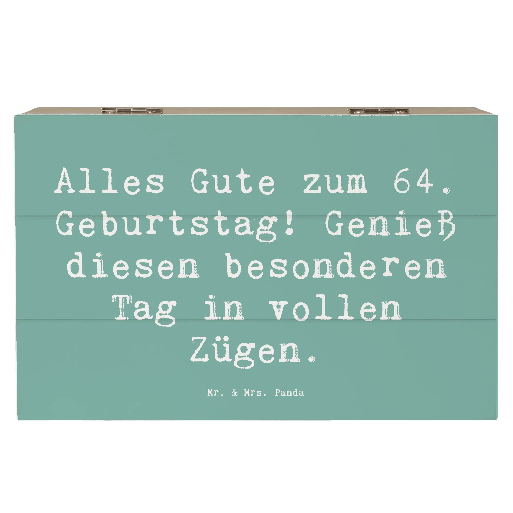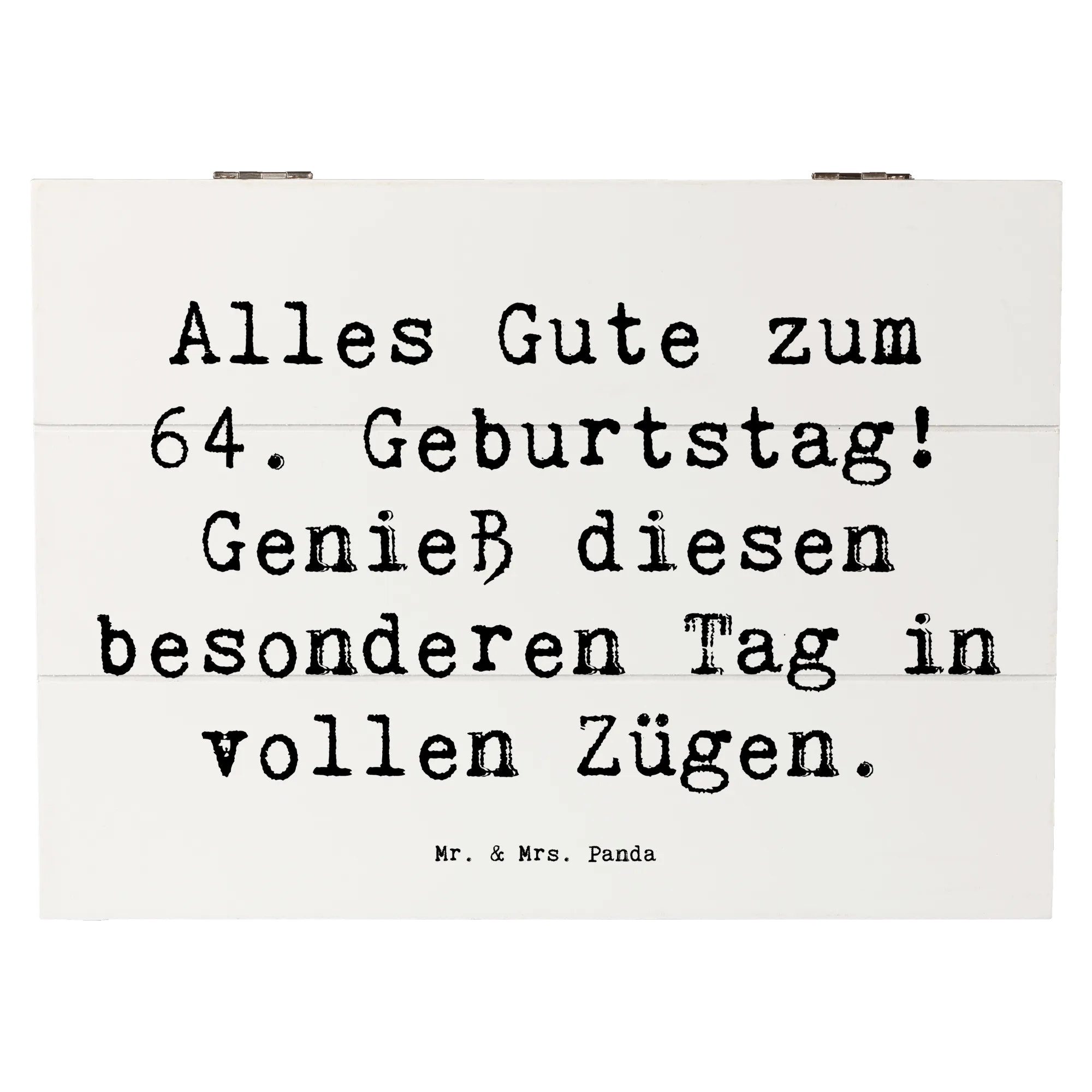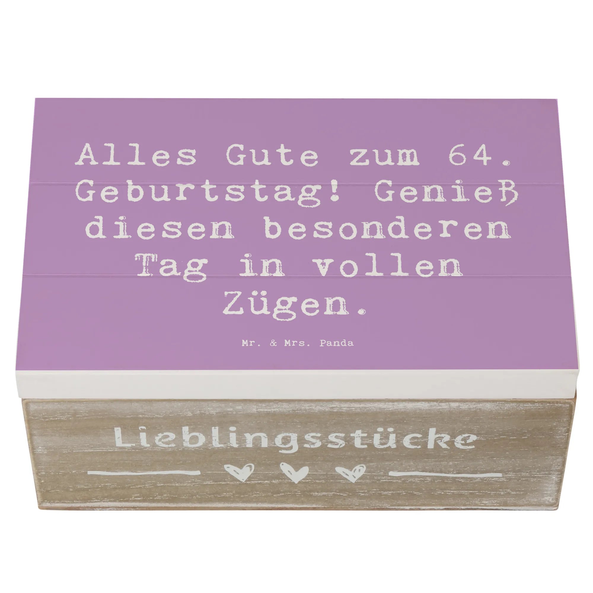 Du suchst nach dem perfekten Geschenk für einen ganz besonderen Menschen, der seinen 64. Geburtstag feiert? Unsere wunderschöne Holzkiste von Mr. & Mrs. Panda ist genau das richtige. Diese einzigartige Kiste ist nicht nur ein wunderbarer Aufbewahrungsort für wertvolle Erinnerungen, sondern auch eine liebevolle Geschenkidee, die im Herzen bleibt. Bedruckt mit dem herzlichen Spruch 'Alles Gute zum 64. Geburtstag! Genieß diesen besonderen Tag in vollen Zügen.' ist sie ein echter Hingucker für jeden Geburtstag.