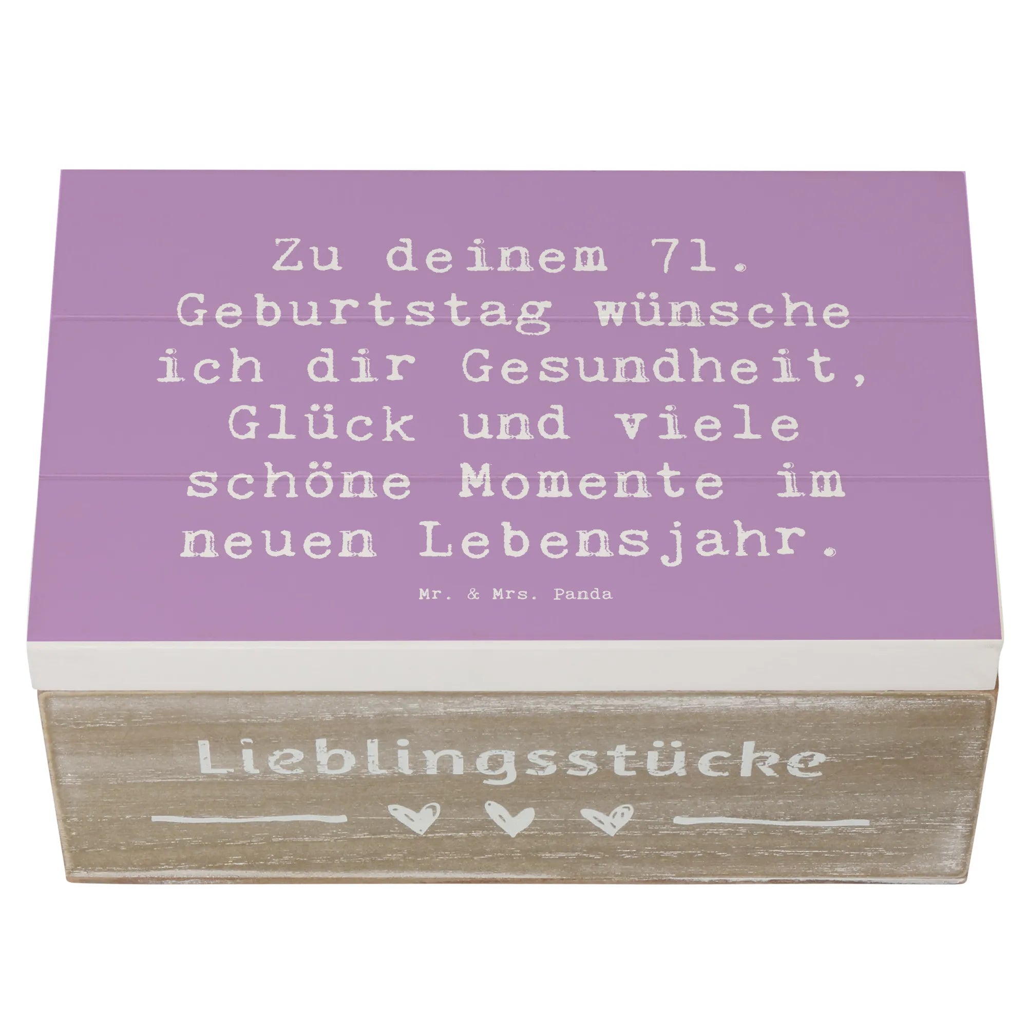 Schenke etwas Besonderes zum 71. Geburtstag! Diese traumhafte Holzkiste von Mr. & Mrs. Panda ist das ideale Geschenk für diesen besonderen Anlass. Die liebevoll gestaltete Kiste, bedruckt mit dem herzlichen Spruch 'Zu deinem 71. Geburtstag wünsche ich dir Gesundheit, Glück und viele schöne Momente im neuen Lebensjahr.', hat nicht nur ein wunderschönes Design, sondern bietet auch jede Menge Platz für die wertvollen Schätze und Erinnerungen des Geburtstagskindes.