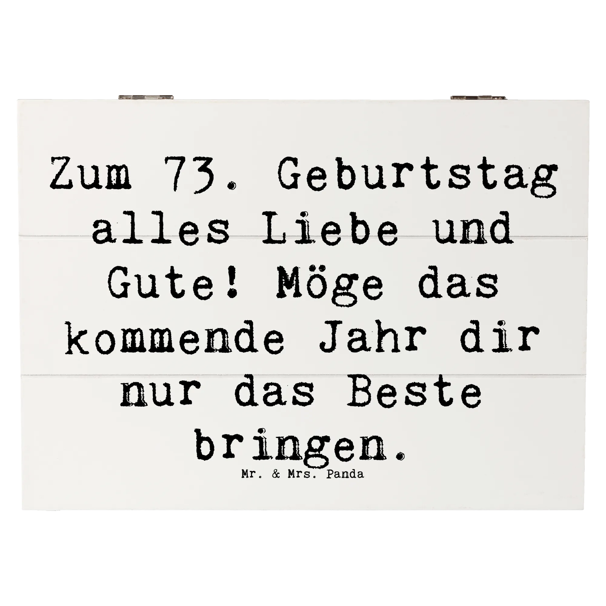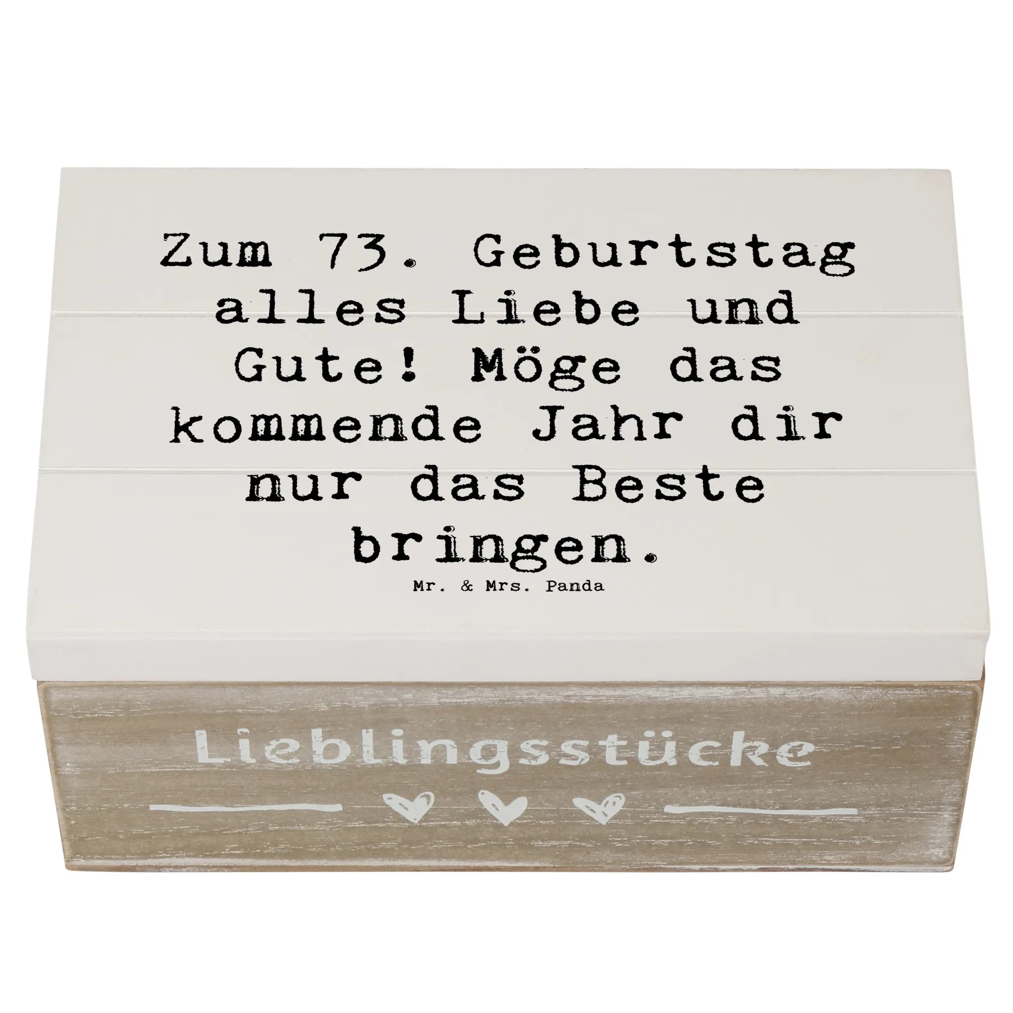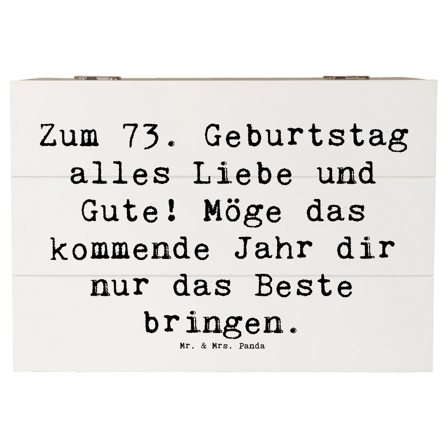 Diese Holzkiste ist einfach die beste Wahl für alle, die jemandem etwas ganz Besonderes schenken möchten. Mach den 73. Geburtstag unvergesslich mit dieser einzigartigen Erinnerungskiste von Mr. & Mrs. Panda. Deine Lieben werden es dir danken und das Geschenk mit Liebe hüten!