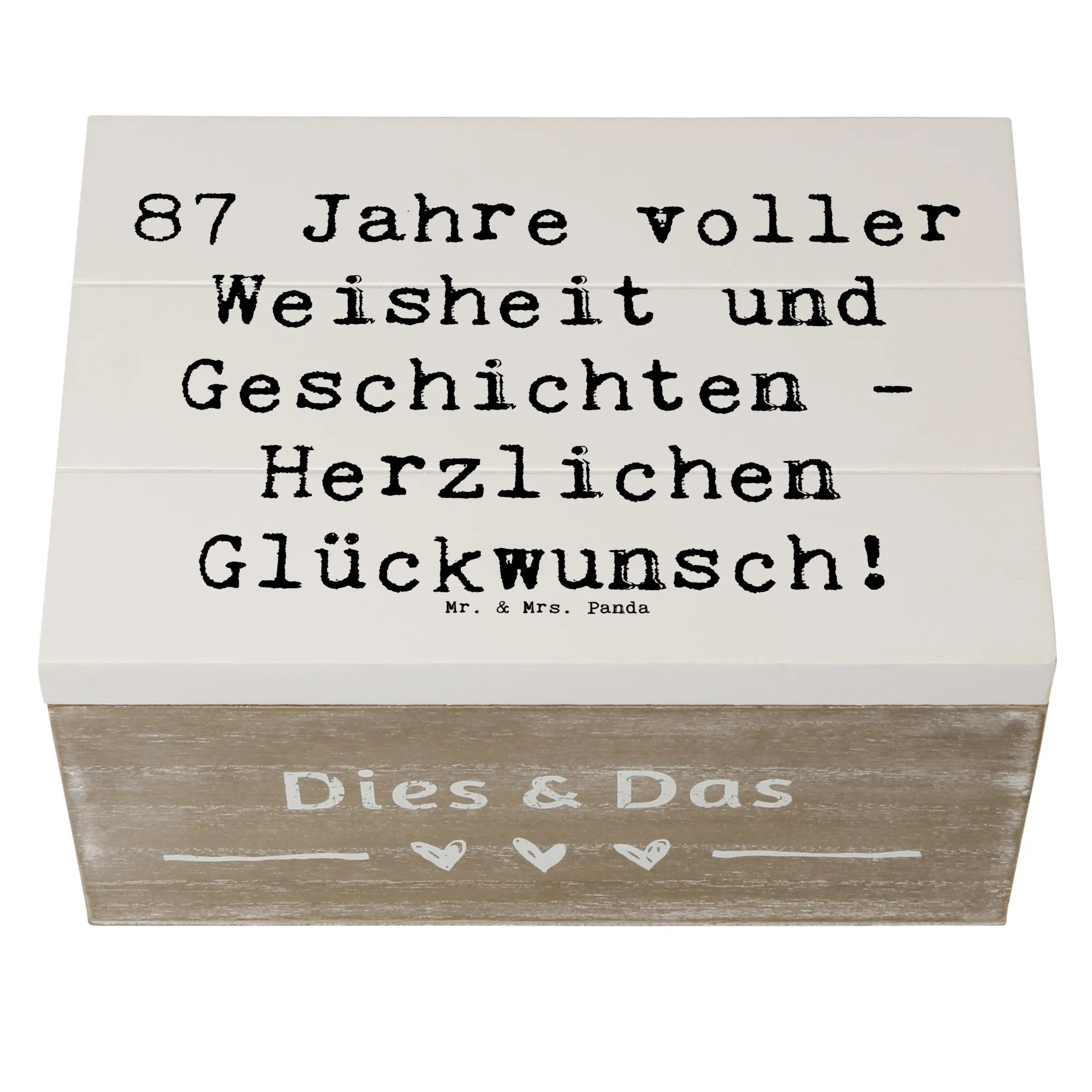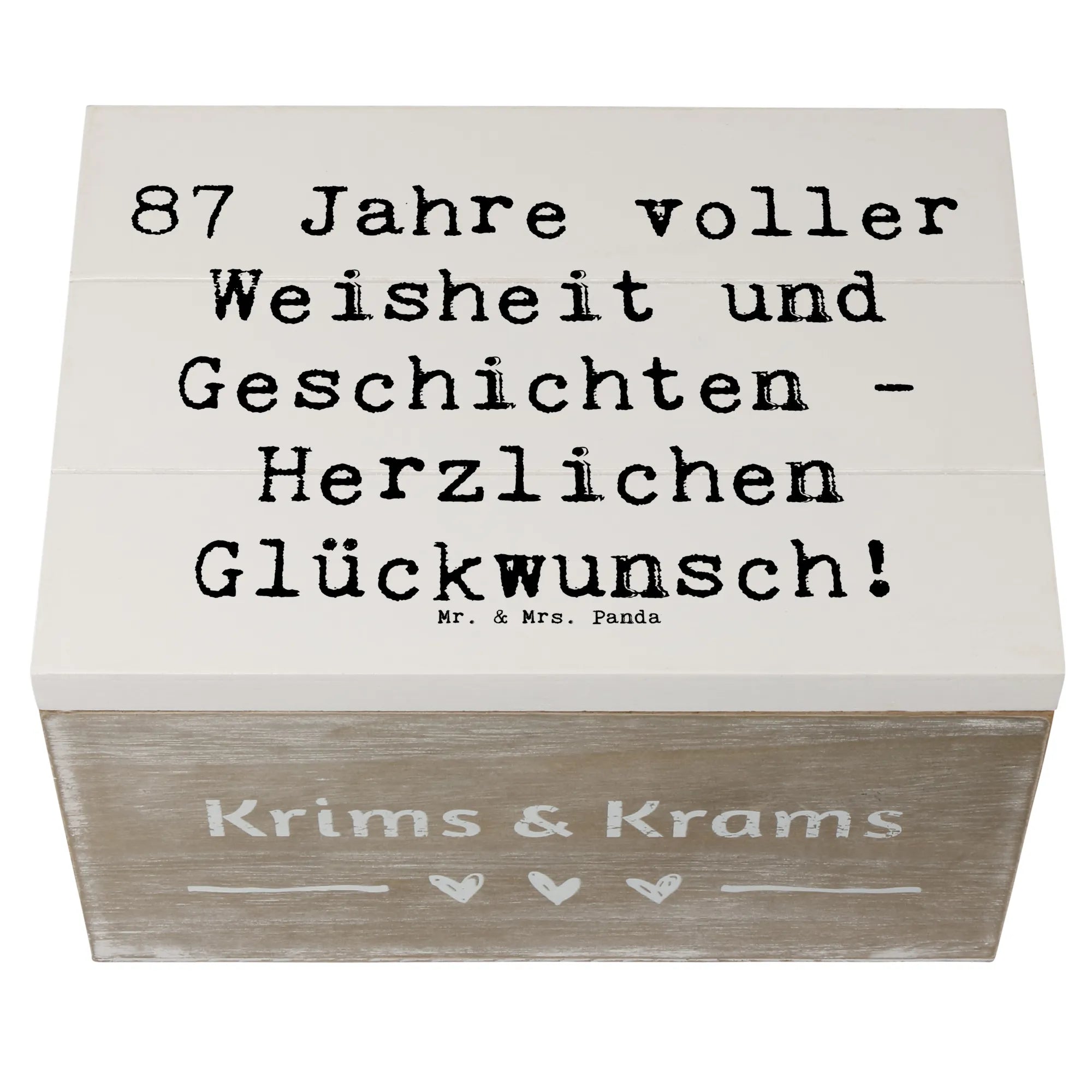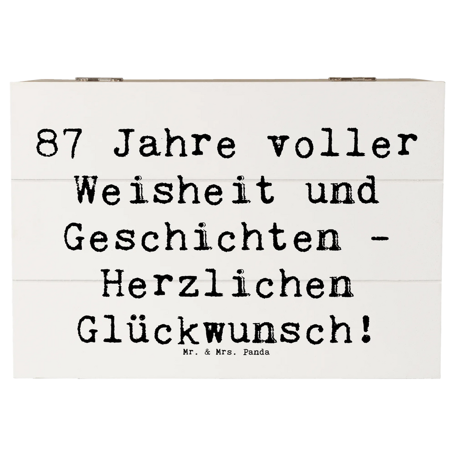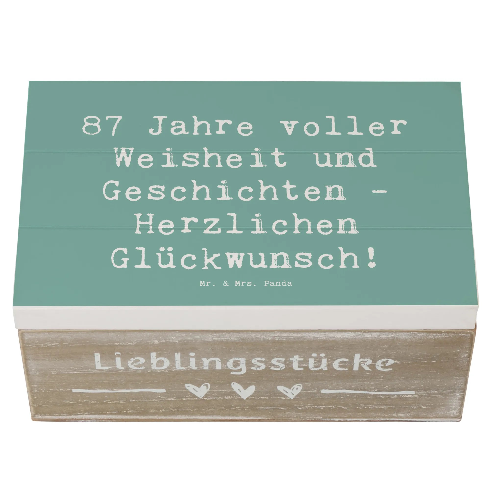 Diese wunderschöne Holzkiste von Mr. & Mrs. Panda ist das perfekte Geschenk zum 87. Geburtstag! Mit dem liebevollen Spruch '87 Jahre voller Weisheit und Geschichten - Herzlichen Glückwunsch!' bringt sie Freude und nimmt die Beschenkten mit auf eine Reise durch die Erinnerungen.