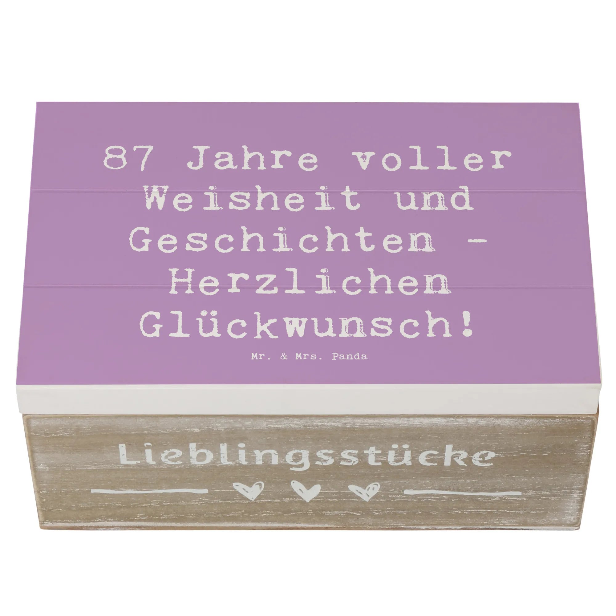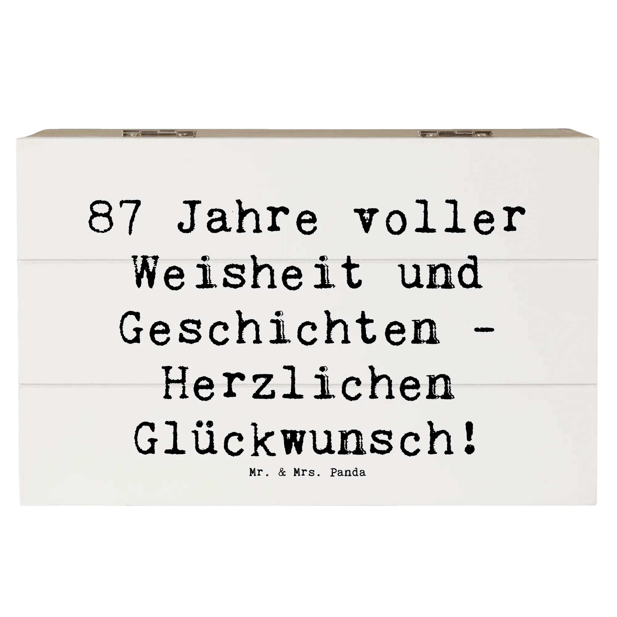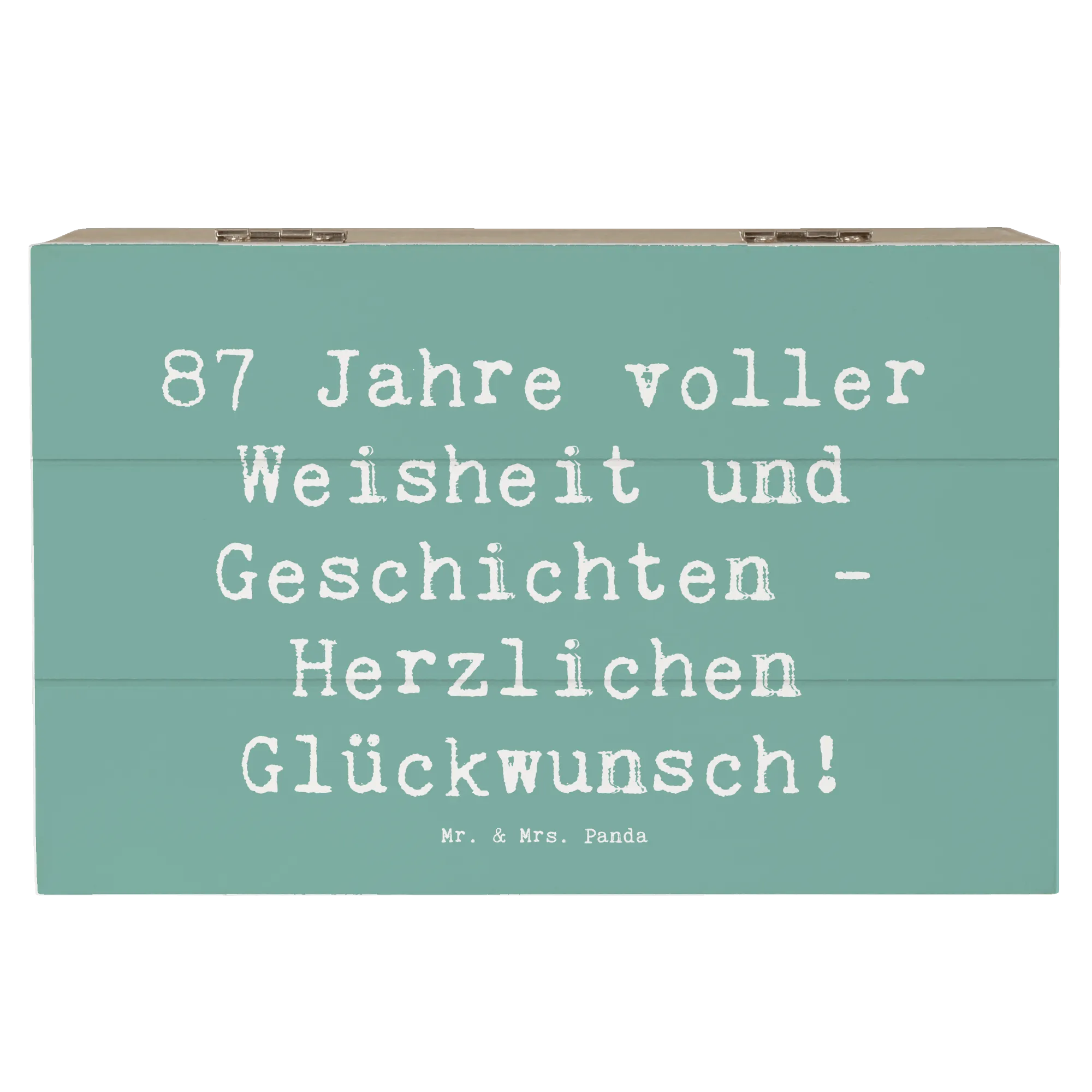 Diese wunderschöne Holzkiste von Mr. & Mrs. Panda ist das perfekte Geschenk zum 87. Geburtstag! Mit dem liebevollen Spruch '87 Jahre voller Weisheit und Geschichten - Herzlichen Glückwunsch!' bringt sie Freude und nimmt die Beschenkten mit auf eine Reise durch die Erinnerungen.