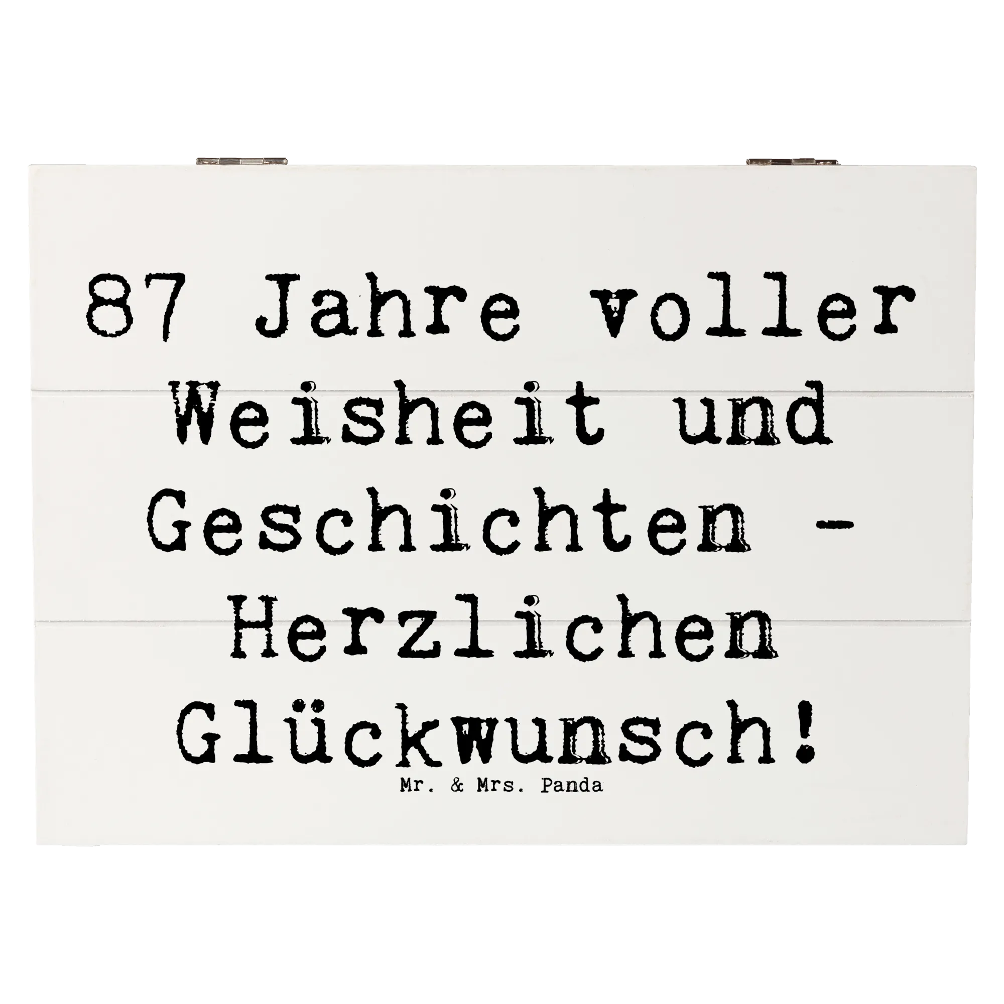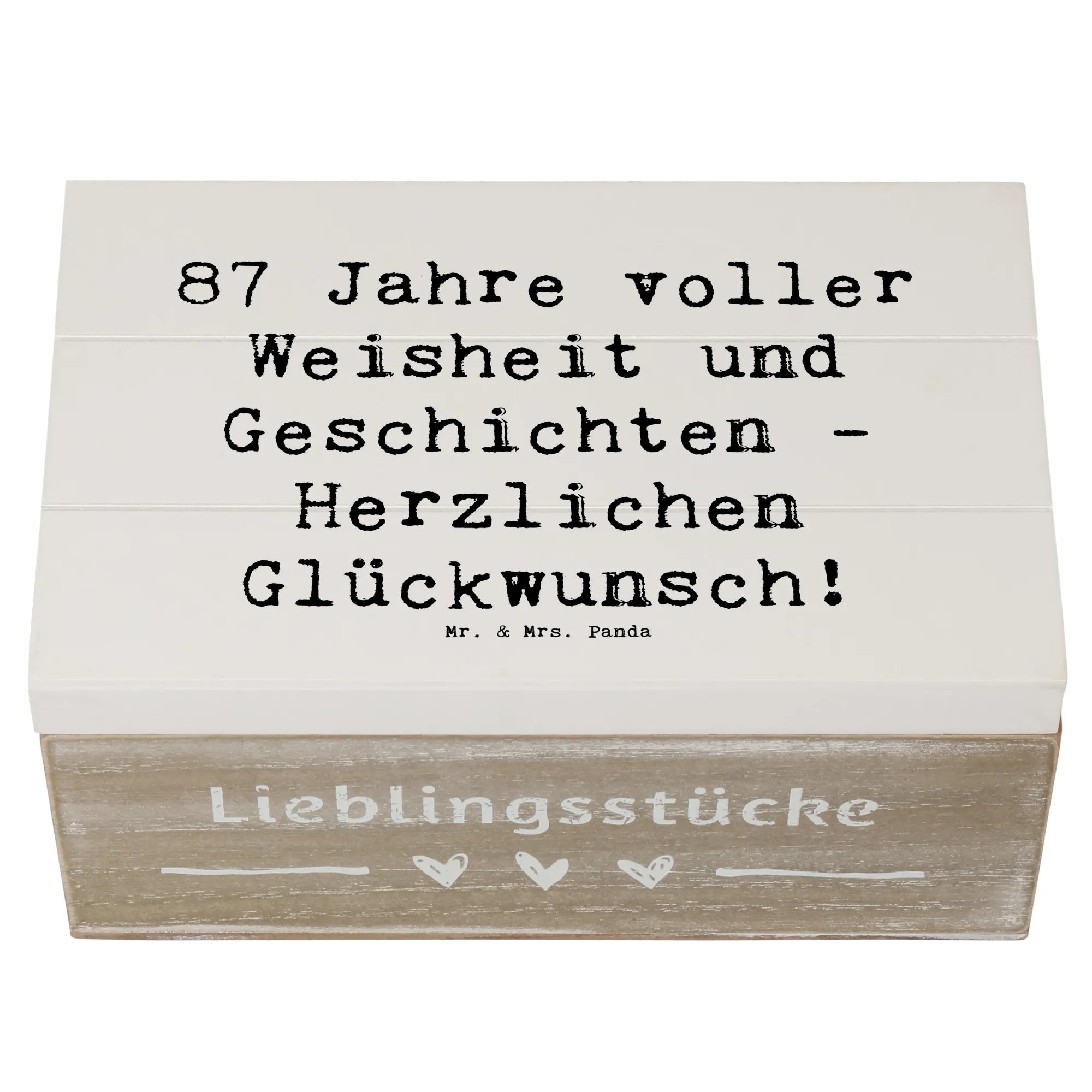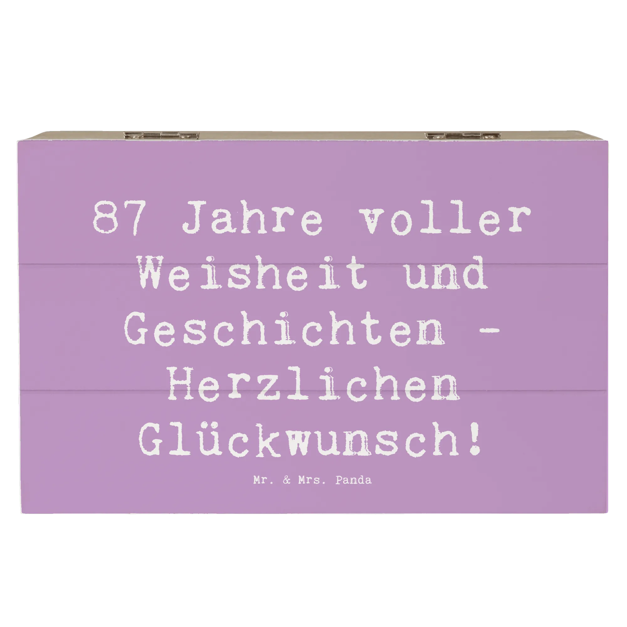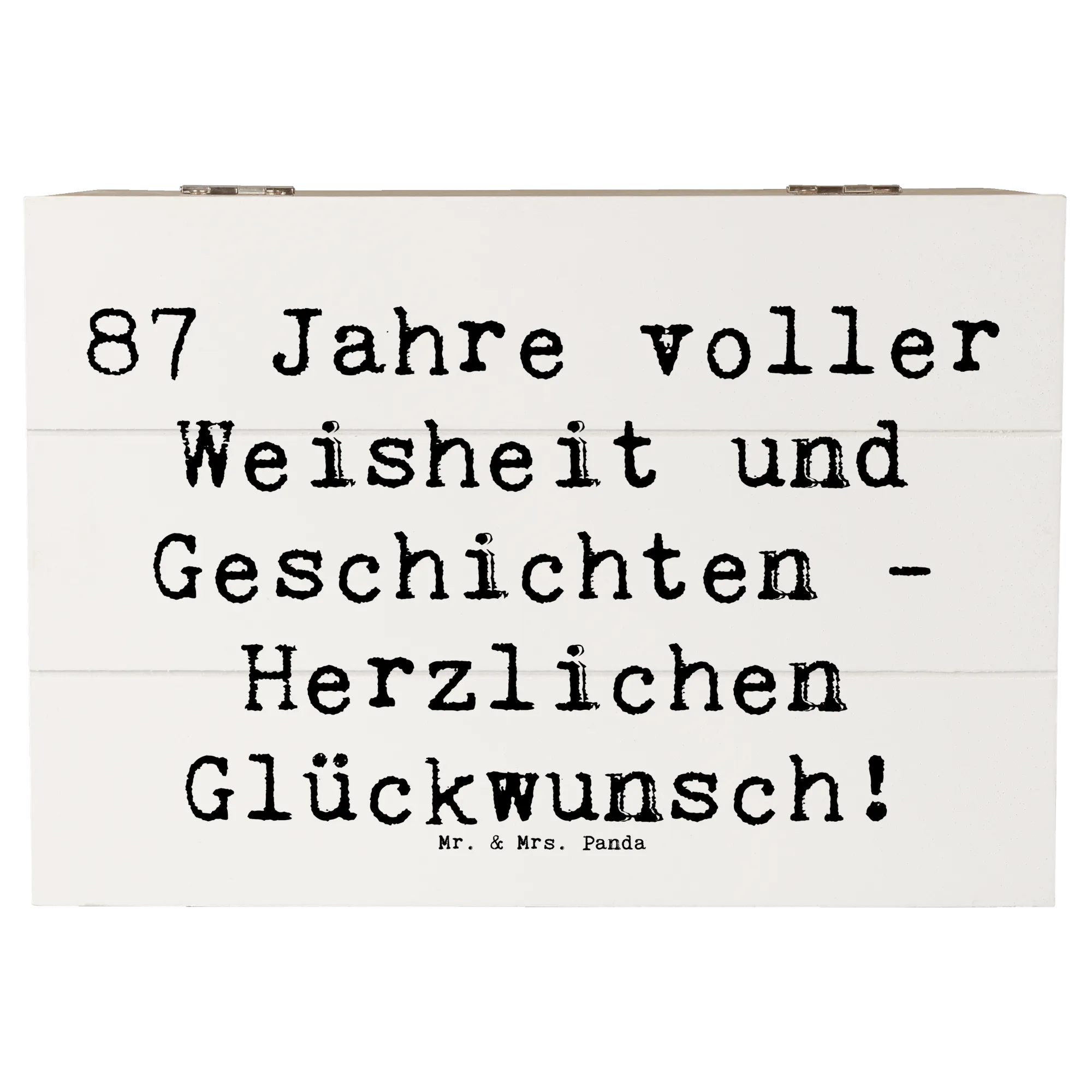 Diese wunderschöne Holzkiste von Mr. & Mrs. Panda ist das perfekte Geschenk zum 87. Geburtstag! Mit dem liebevollen Spruch '87 Jahre voller Weisheit und Geschichten - Herzlichen Glückwunsch!' bringt sie Freude und nimmt die Beschenkten mit auf eine Reise durch die Erinnerungen.
