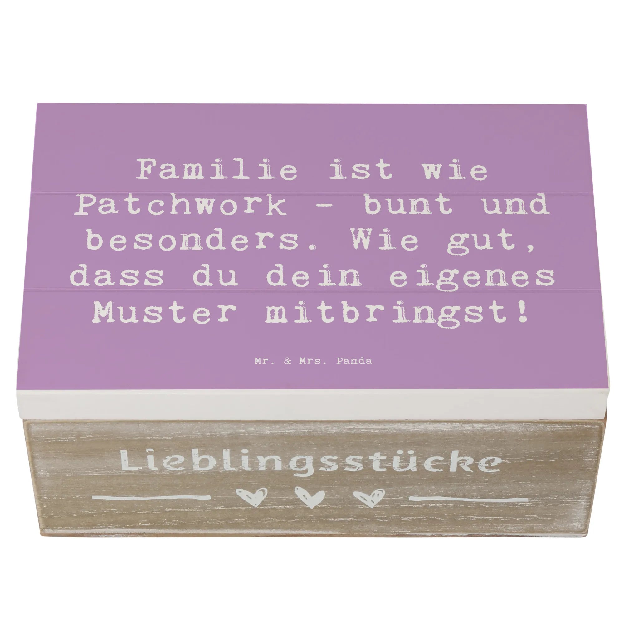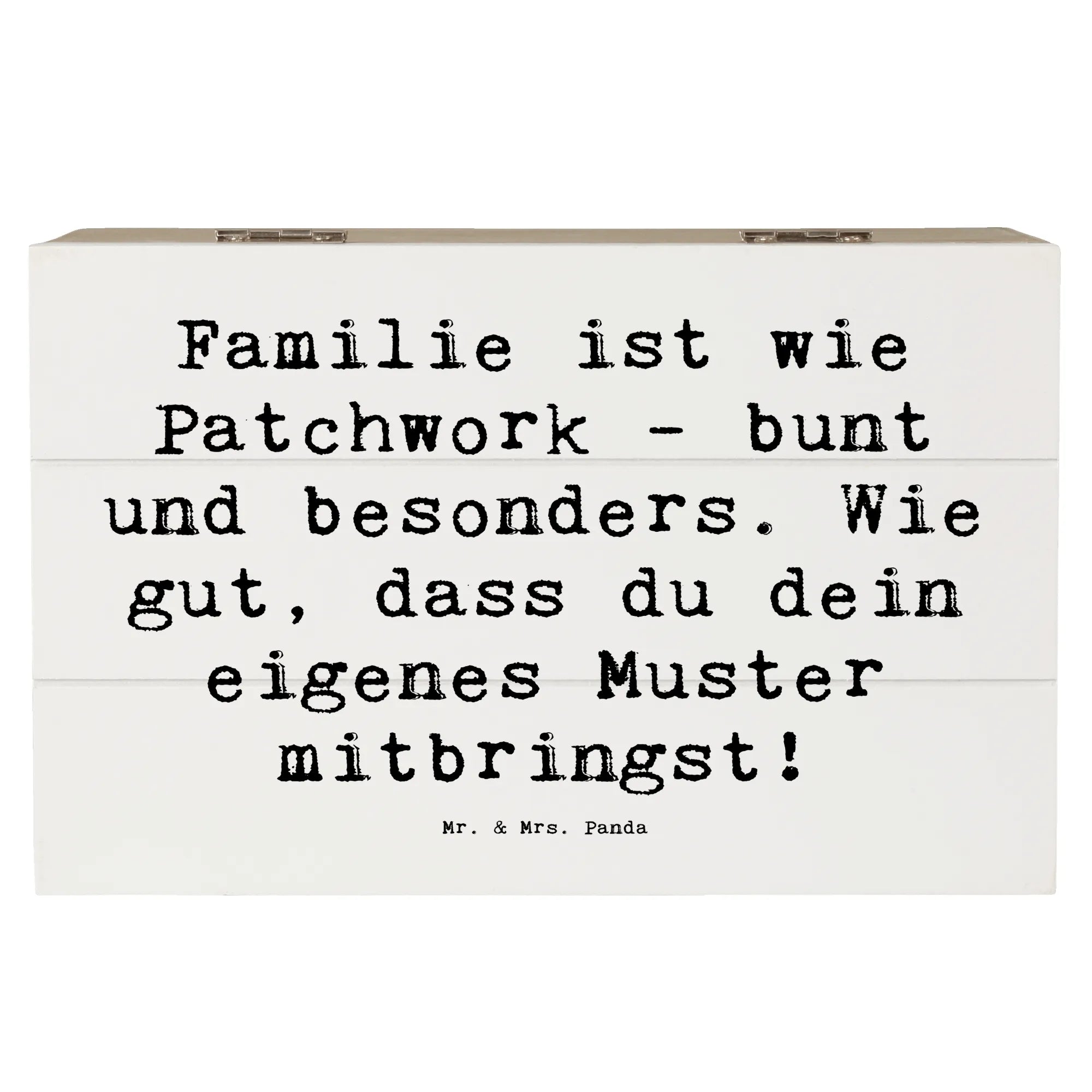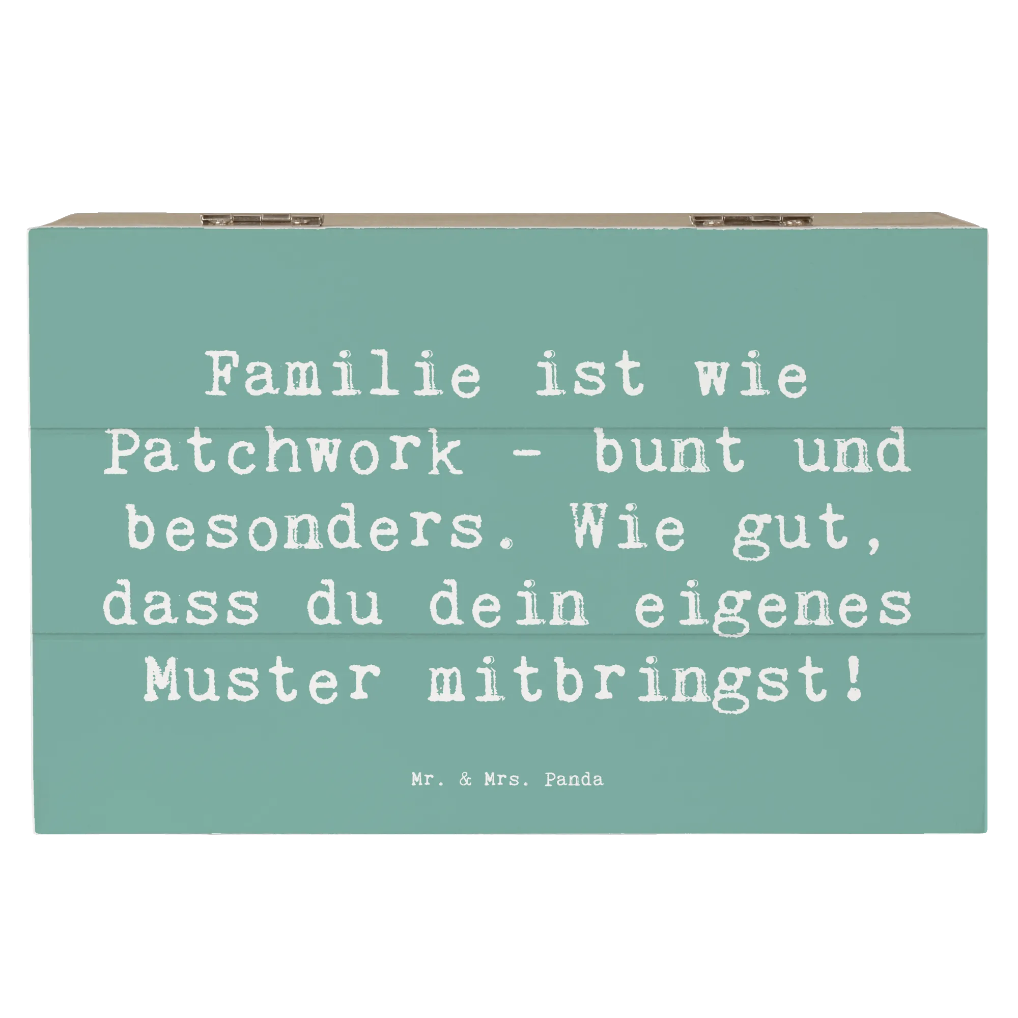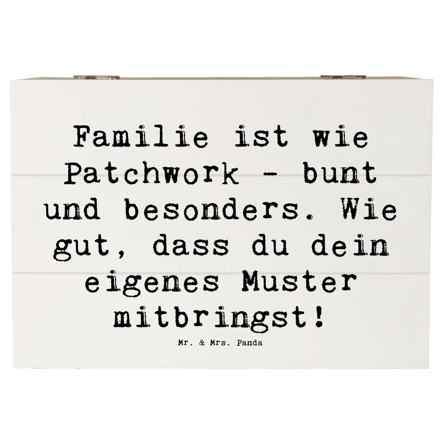 Der wunderbare Spruch "Familie ist wie Patchwork - bunt und besonders. Wie gut, dass du dein eigenes Muster mitbringst!" ziert den Deckel dieser Kiste und erinnert an die einzigartigen Familienbande, die durch Adoption entstehen. Dieses Motto ist nicht nur ein schöner Gedanke, sondern unterstreicht auch die Liebe und den Zusammenhalt, die in einer Patchworkfamilie bestehen.