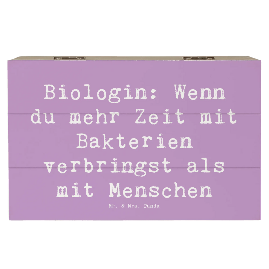 Die wunderschöne Holzkiste "Biologin" von Mr. & Mrs. Panda ist das perfekte Geschenk für alle, die ihre Leidenschaft für die Natur und das Leben zelebrieren möchten. Mit dem liebevoll gestalteten Motiv und dem witzigen Spruch "Biologin: Wenn du mehr Zeit mit Bakterien verbringst als mit Menschen" spricht diese Erinnerungskiste alles an, was das Herz eines jeden Biologen höher schlagen lässt.