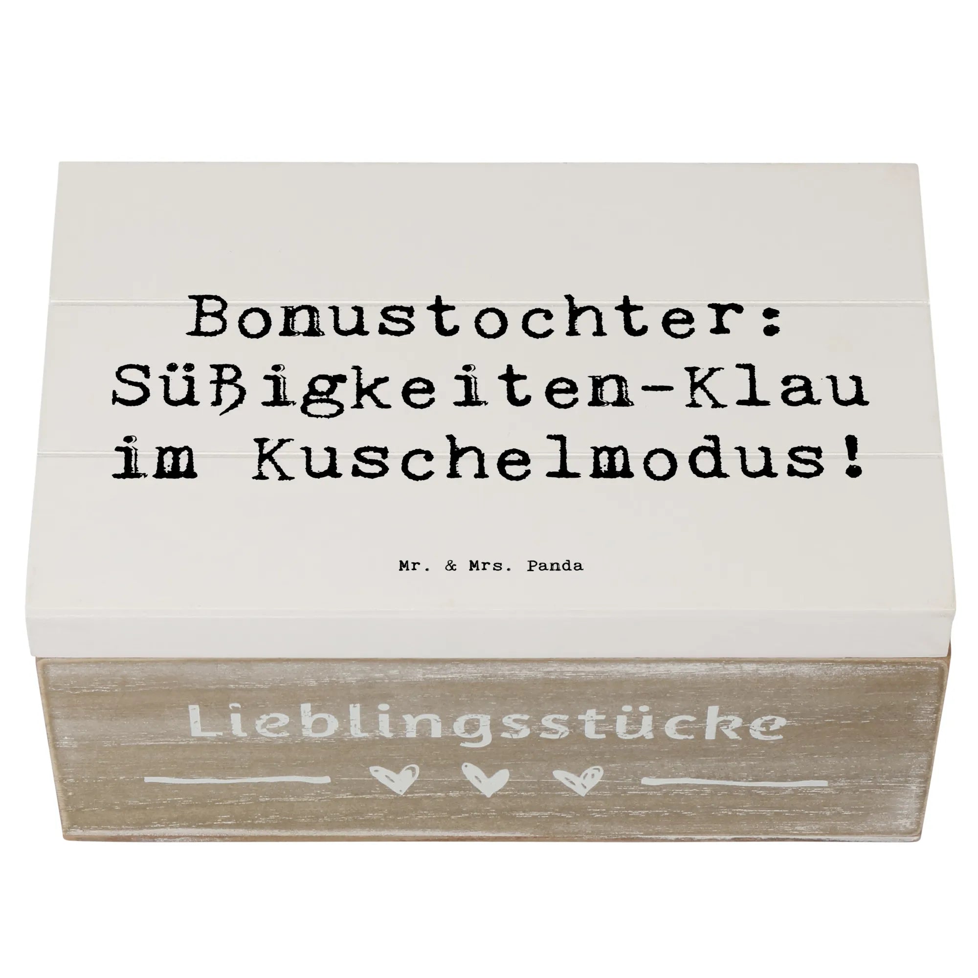 Entdecke die zauberhafte Holzkiste von Mr. & Mrs. Panda, die perfekt für Deine Bonustochter ist! Diese wunderschöne Schatzkiste ist mehr als nur ein Aufbewahrungsort für kleine Schätze. Sie ist ein Ausdruck der besonderen Beziehung, die Du zu Deiner Stieftochter hast. Mit dem charmanten Spruch "Bonustochter: Süßigkeiten-Klau im Kuschelmodus!" zauberst Du ein Lächeln auf ihr Gesicht und zeigst ihr, wie wichtig sie für Dich ist.