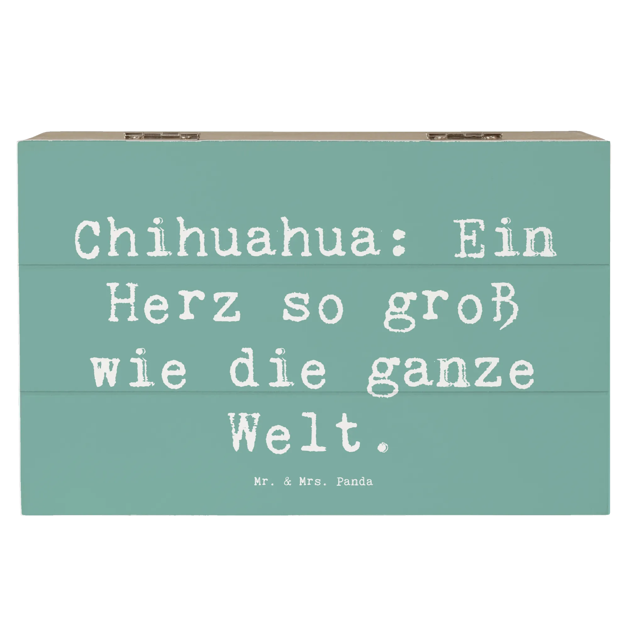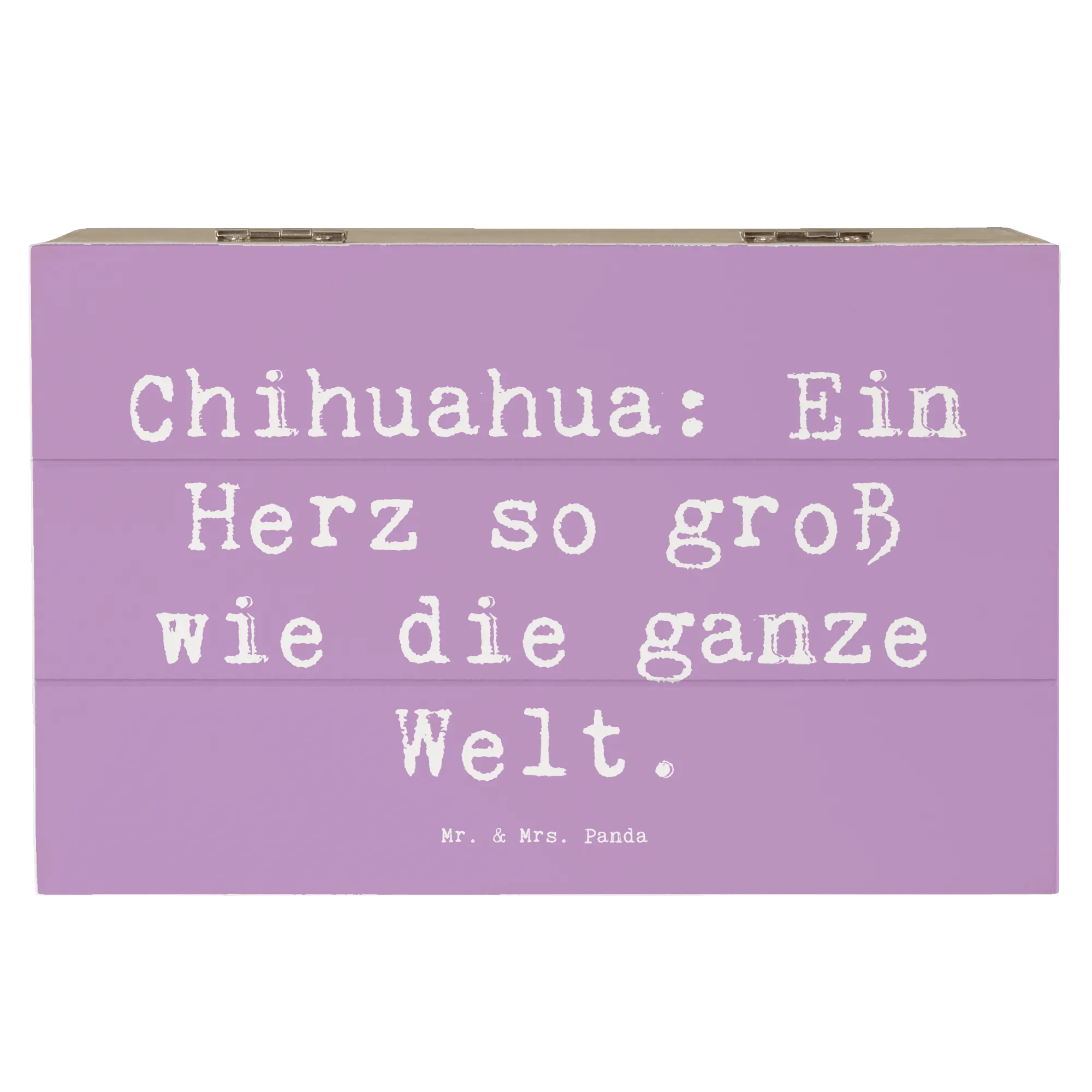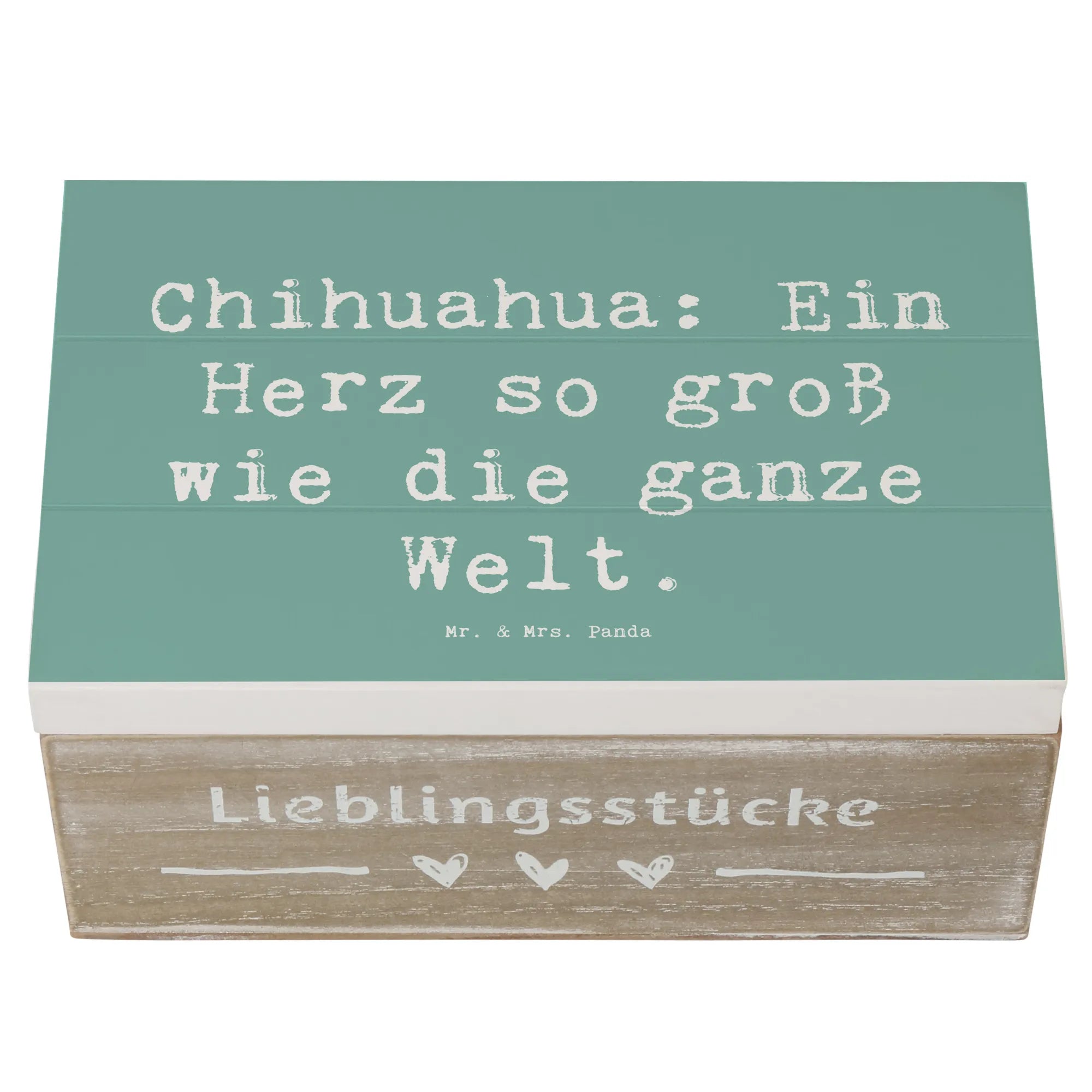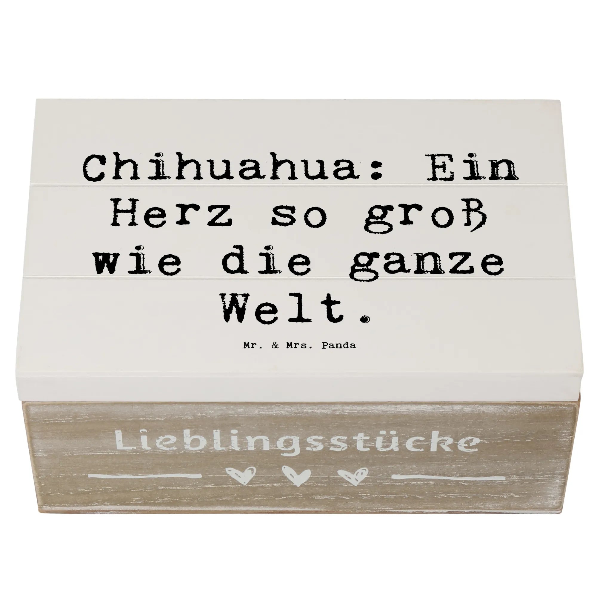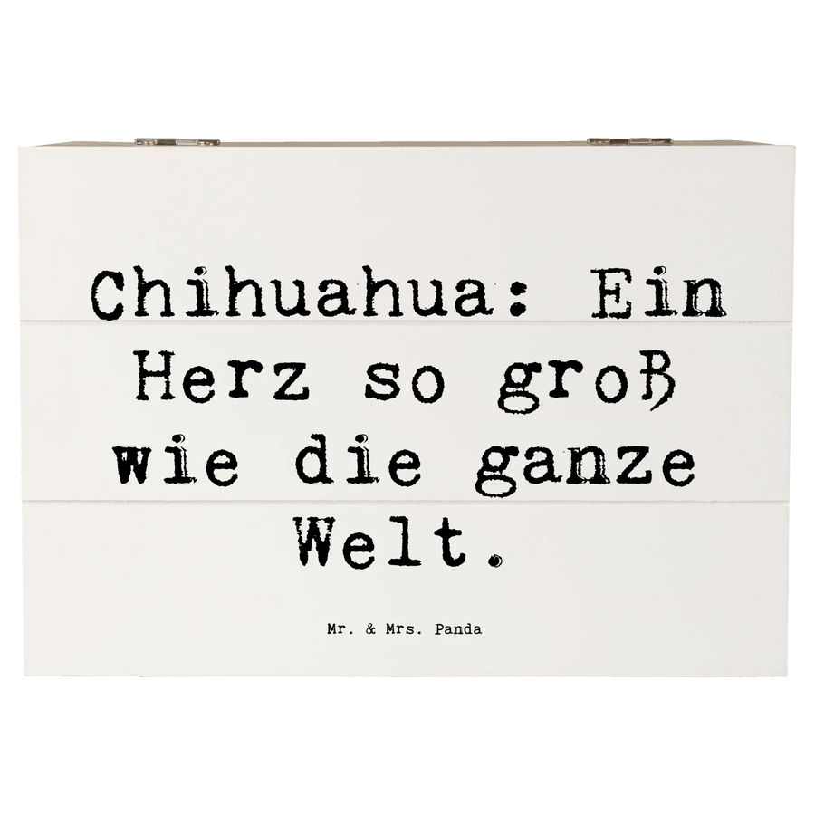 Entdecke die zauberhafte Holzkiste von Mr. & Mrs. Panda, bedruckt mit dem liebevollen Chihuahua-Motiv und dem wundervollen Spruch "Chihuahua: Ein Herz so groß wie die ganze Welt". Diese besondere Erinnerungskiste ist nicht nur ein wunderschöner Blickfang, sondern auch ein idealer Aufbewahrungsort für all deine wertvollen Schätze.