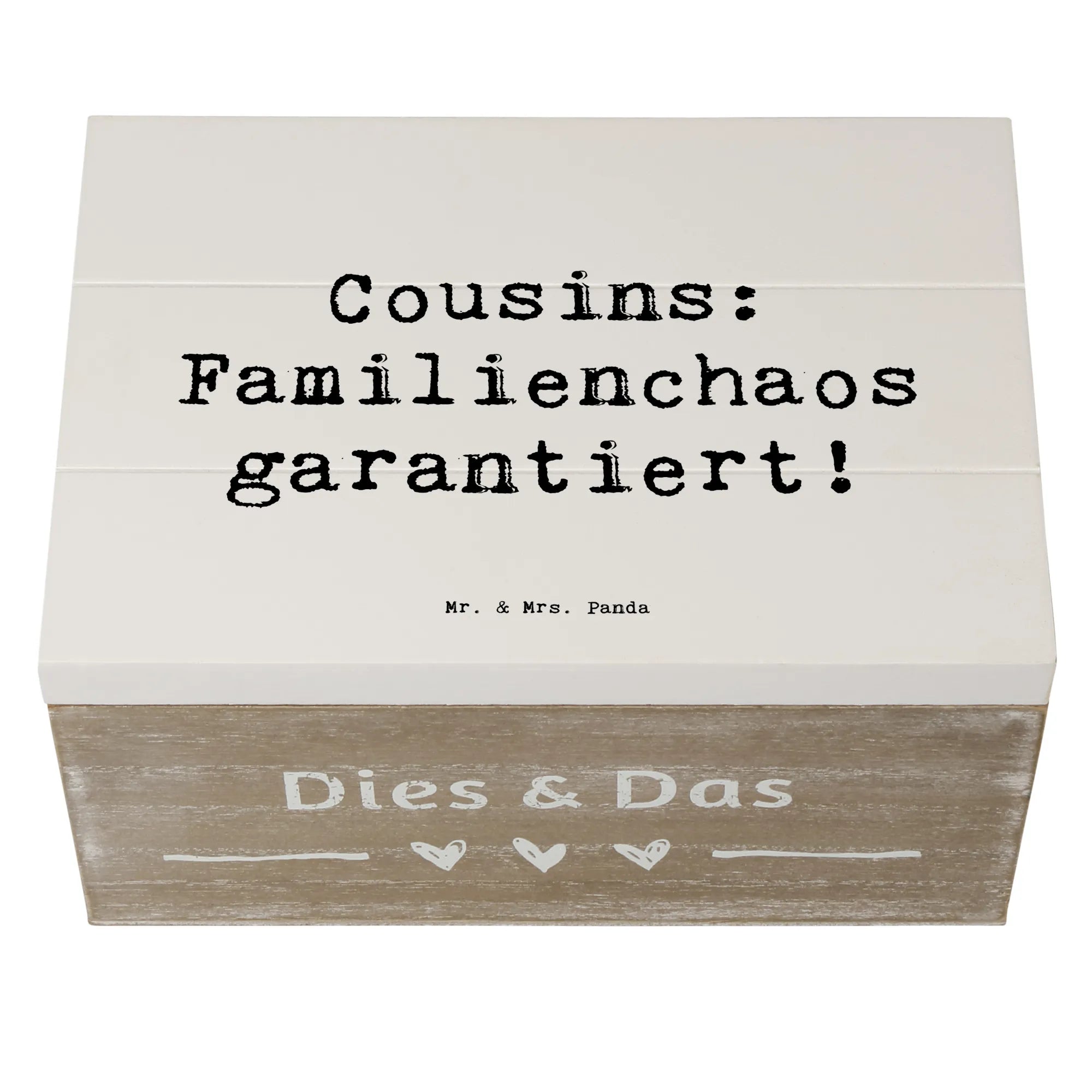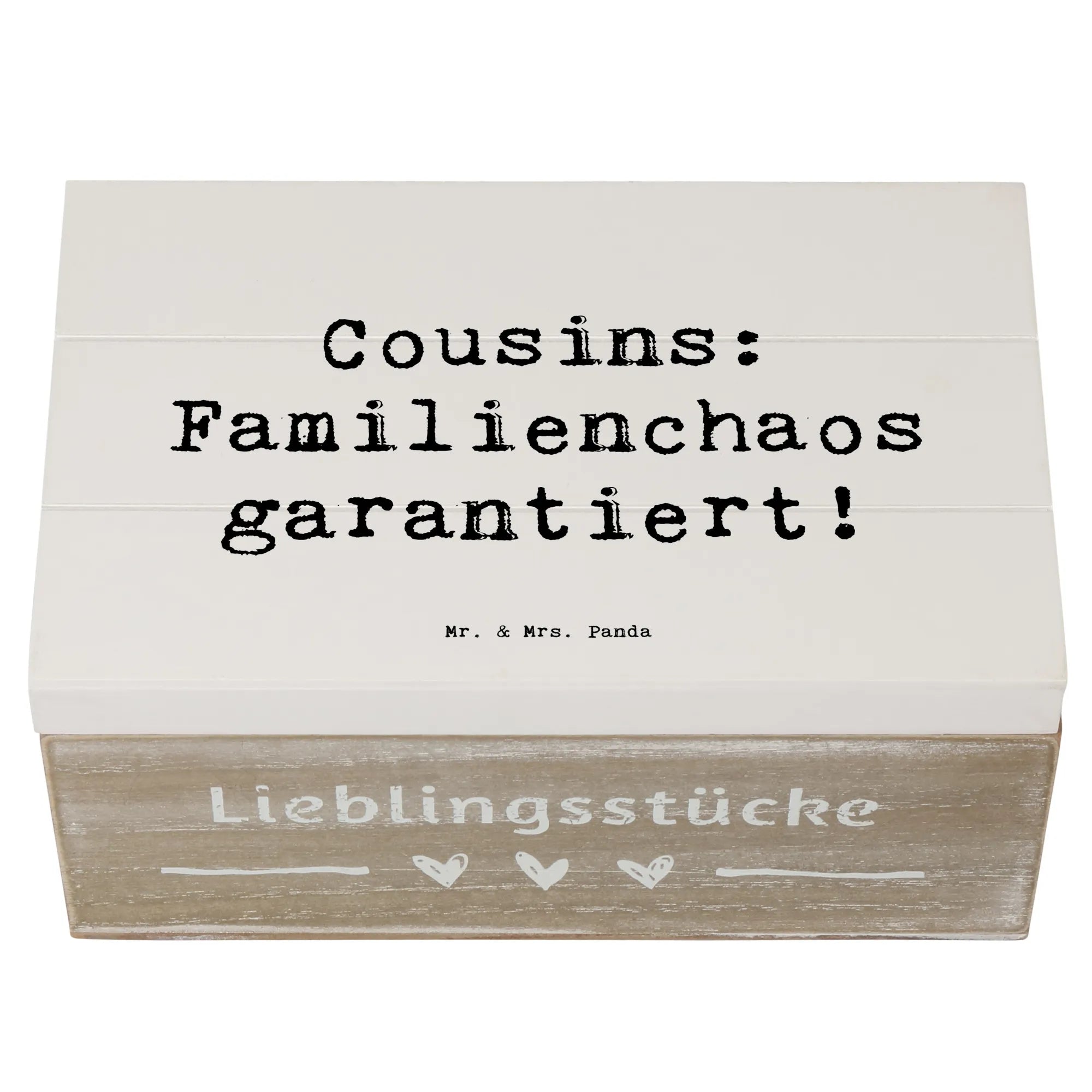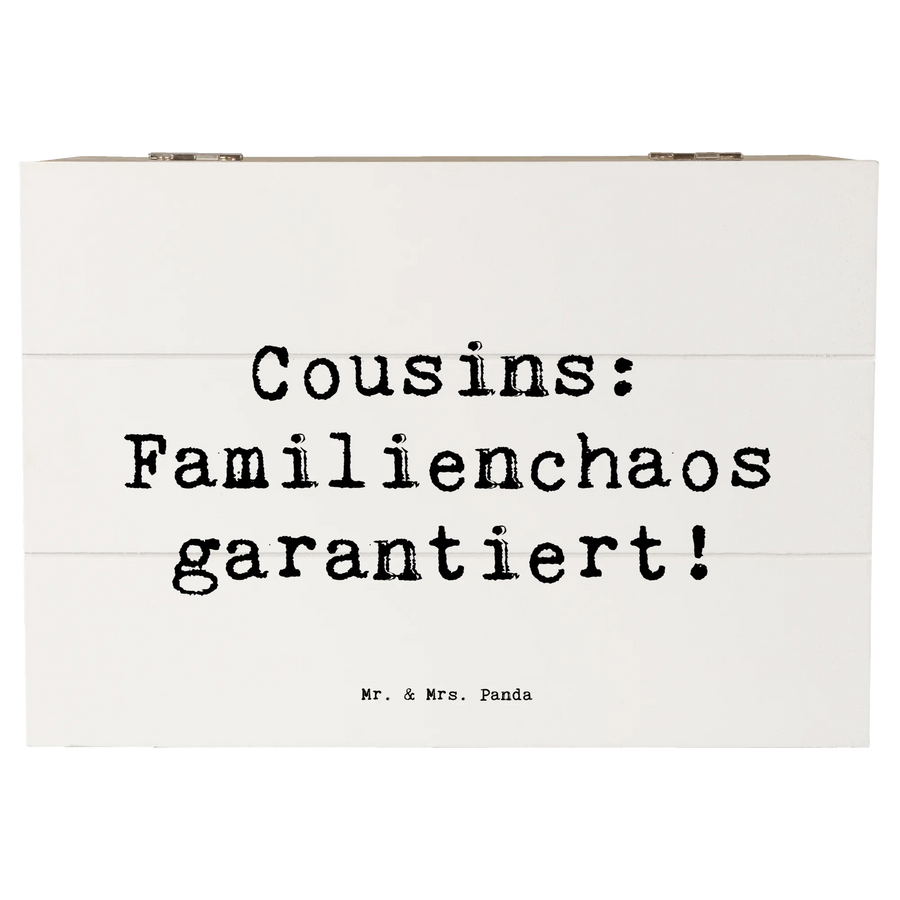 Entdecke die zauberhafte Holzkiste von Mr. & Mrs. Panda, die perfekt für all die kleinen und großen Schätze ist, die Du im Laufe der Jahre sammelst! Diese liebevoll gestaltete Erinnerungskiste ist nicht nur ein praktischer Aufbewahrungsort, sondern auch ein wunderbares Geschenk für Deinen Cousin oder Deine Cousine. Mit dem lustigen Spruch 'Cousins: Familienchaos garantiert!' bringt sie ein Lächeln auf jedes Gesicht und erinnert an all die schönen gemeinsamen Momente.