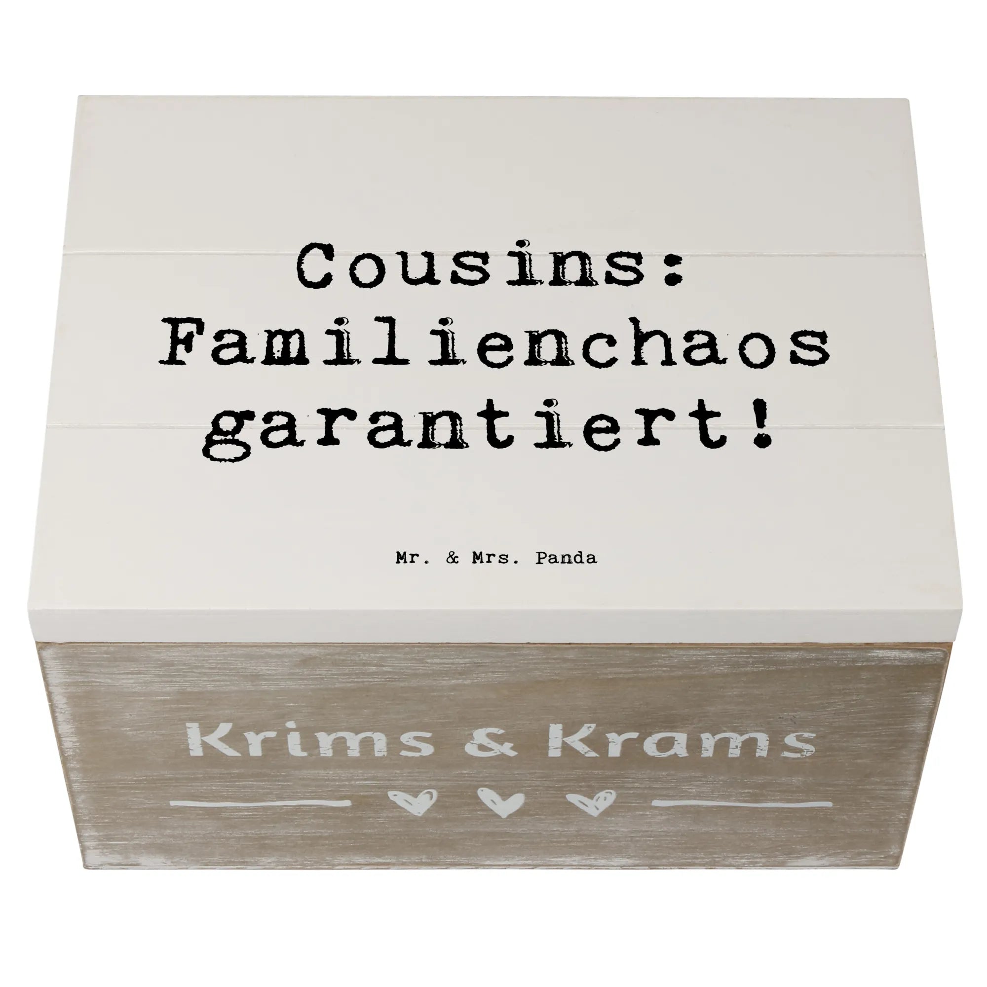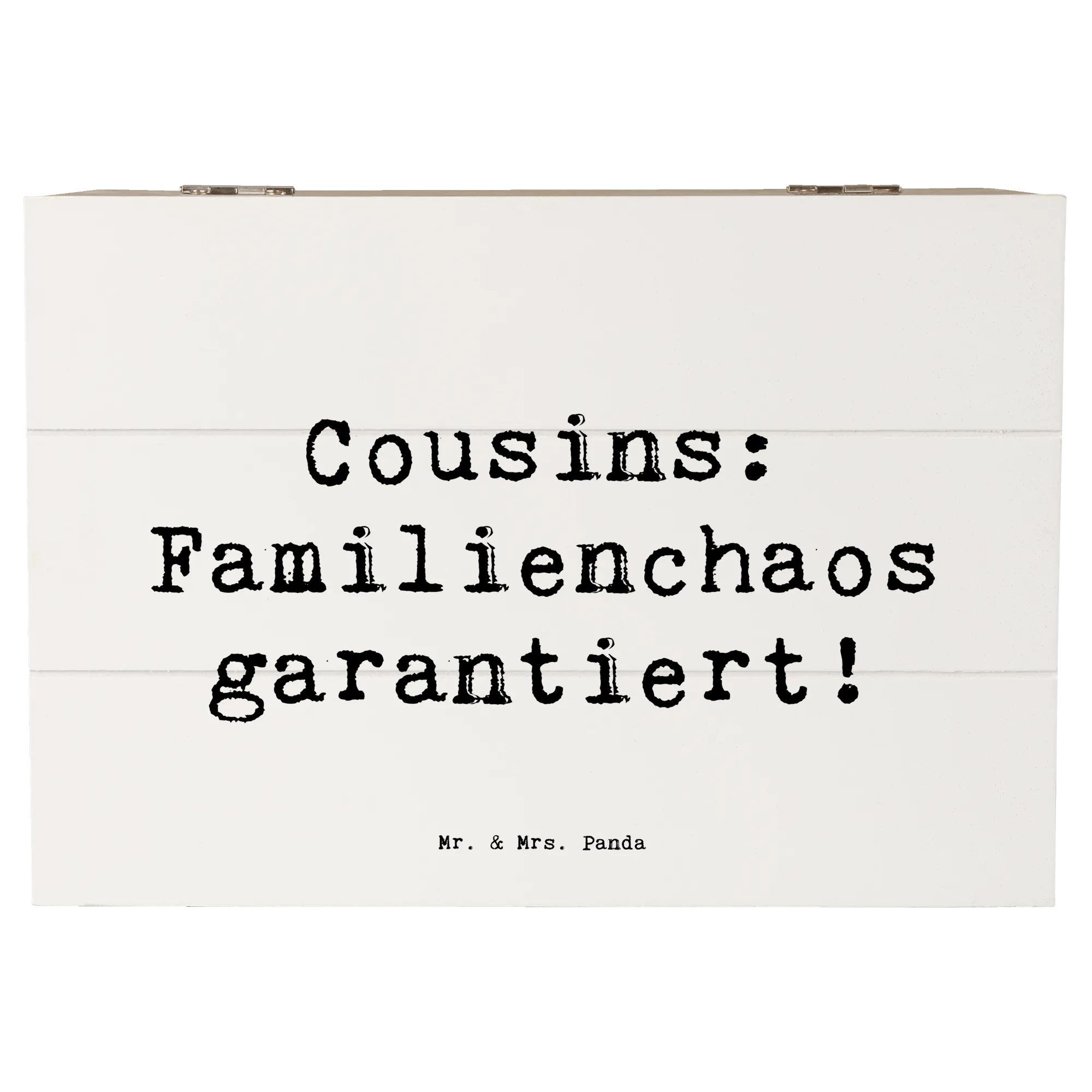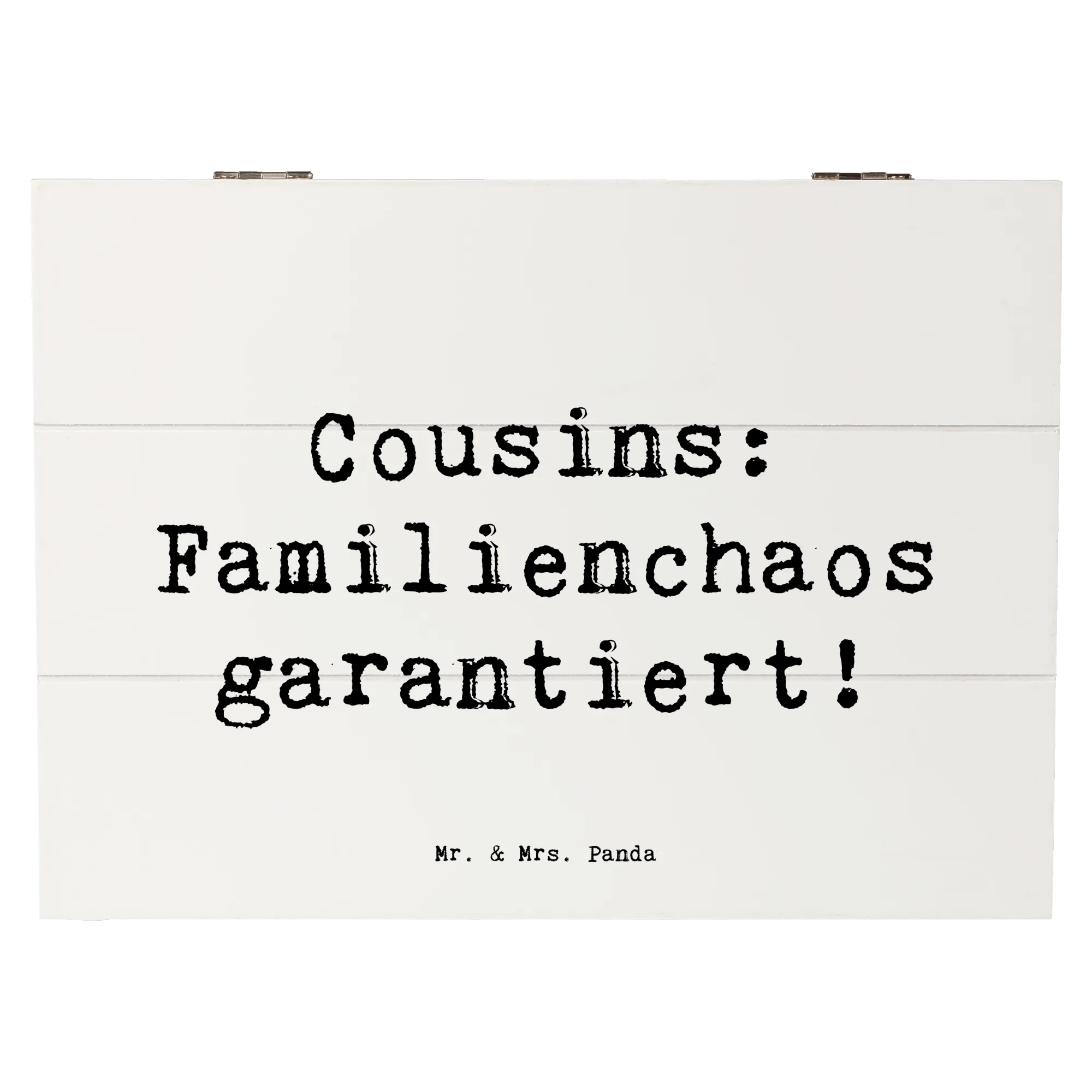 Entdecke die zauberhafte Holzkiste von Mr. & Mrs. Panda, die perfekt für all die kleinen und großen Schätze ist, die Du im Laufe der Jahre sammelst! Diese liebevoll gestaltete Erinnerungskiste ist nicht nur ein praktischer Aufbewahrungsort, sondern auch ein wunderbares Geschenk für Deinen Cousin oder Deine Cousine. Mit dem lustigen Spruch 'Cousins: Familienchaos garantiert!' bringt sie ein Lächeln auf jedes Gesicht und erinnert an all die schönen gemeinsamen Momente.