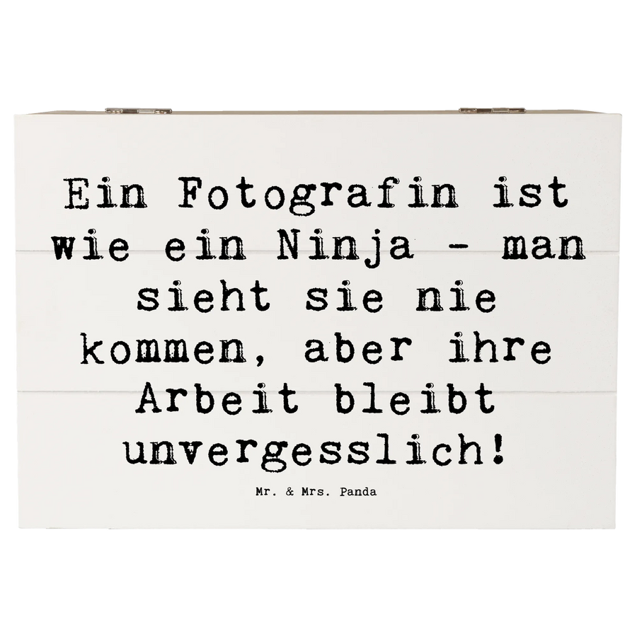 Du suchst nach dem perfekten Geschenk für eine Fotografin? Unsere wunderschöne Holzkiste von Mr. & Mrs. Panda, bedruckt mit dem charmanten Spruch "Ein Fotografin ist wie ein Ninja - man sieht sie nie kommen, aber ihre Arbeit bleibt unvergesslich!", ist die ideale Wahl!