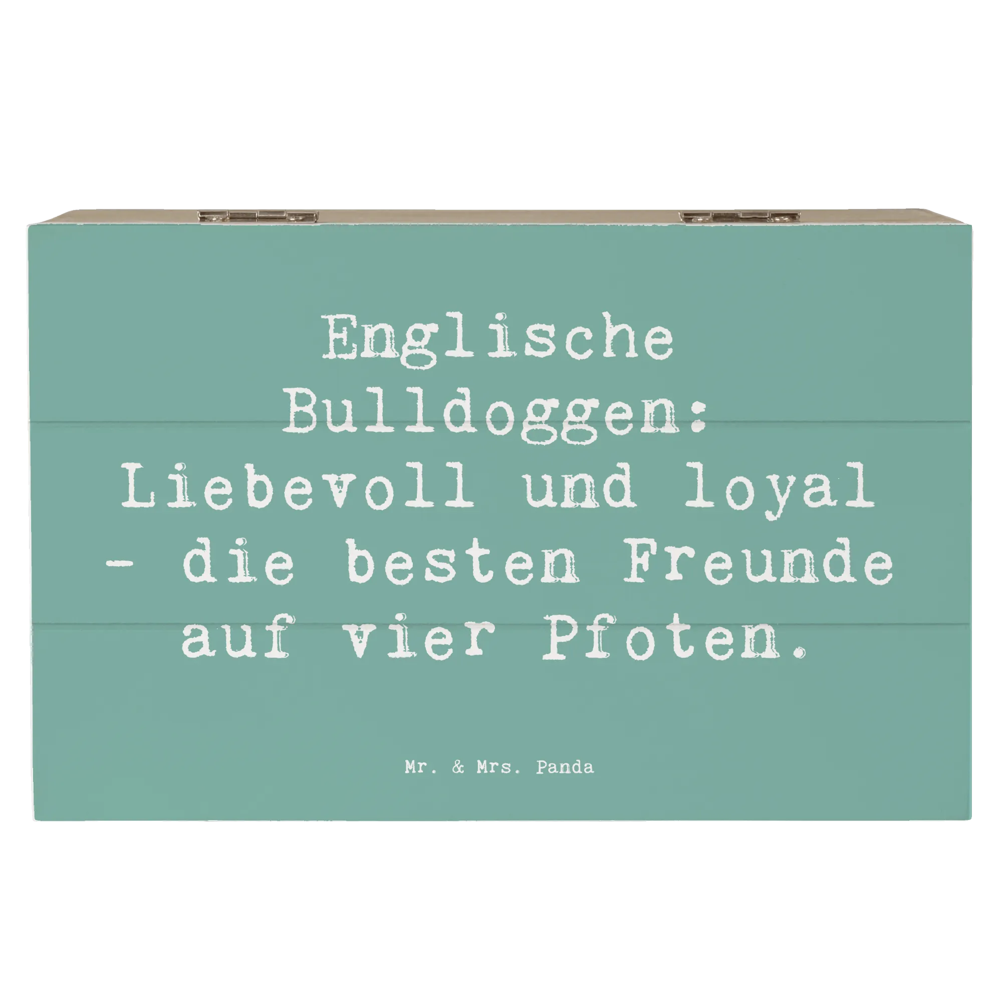 Der charmante Spruch "Englische Bulldoggen: Liebevoll und loyal - die besten Freunde auf vier Pfoten." ziert die Kiste und gibt ihr eine persönliche Note. Sie ist nicht abschließbar, lässt sich aber dank der besonderen Einschlagscharniere leicht öffnen und schließen.