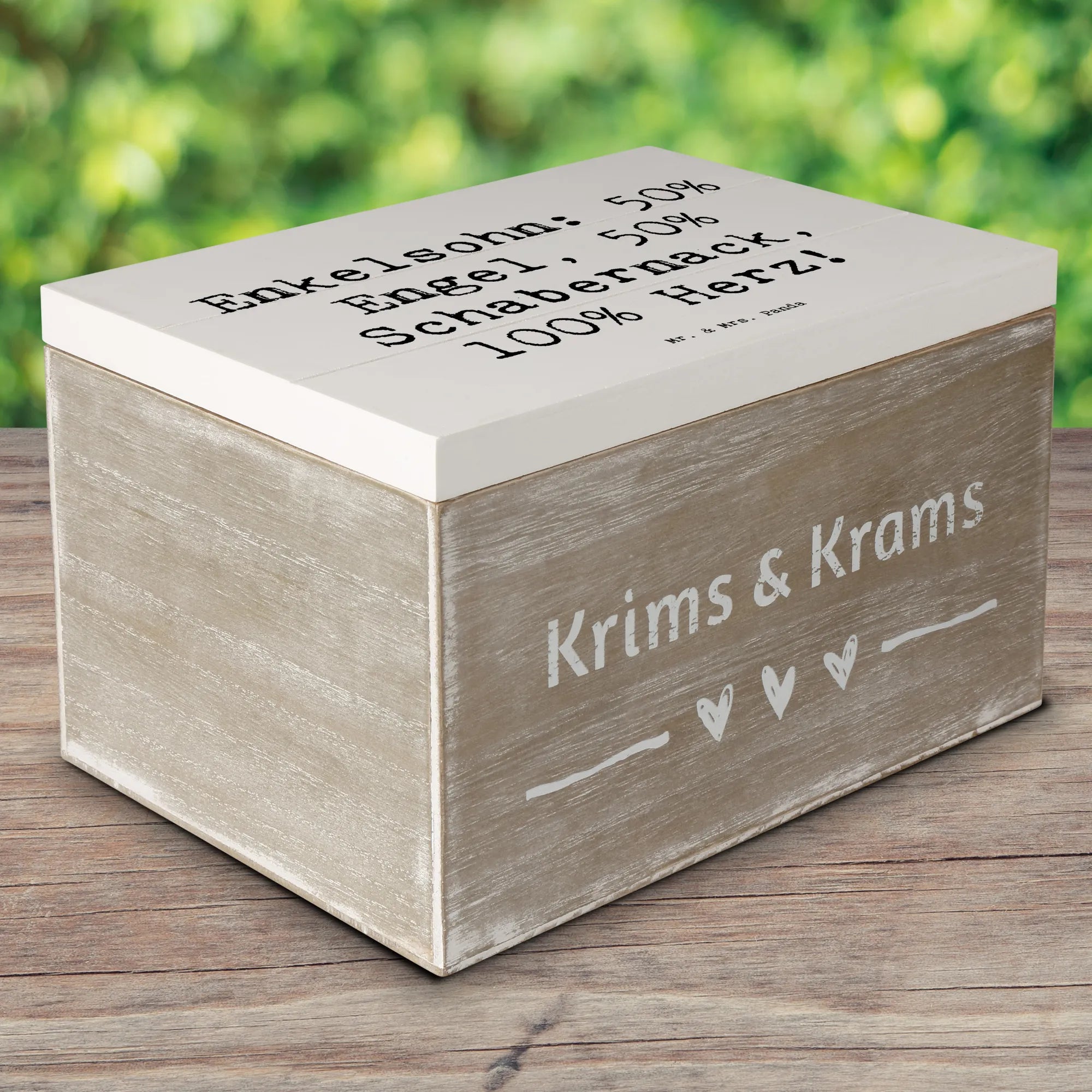 Mit einem liebevollen Motiv, das den Grundsatz "Enkelsohn: 50% Engel, 50% Schabernack, 100% Herz!" trägt, wird diese Kiste zu einem echten Schatzort in jedem Zuhause. Diese Erinnerungskiste eignet sich perfekt für festliche Anlässe wie Kommunion oder Konfirmation und bietet Platz für unvergessliche Fotos und kleine Schätze aus der Kindheit.