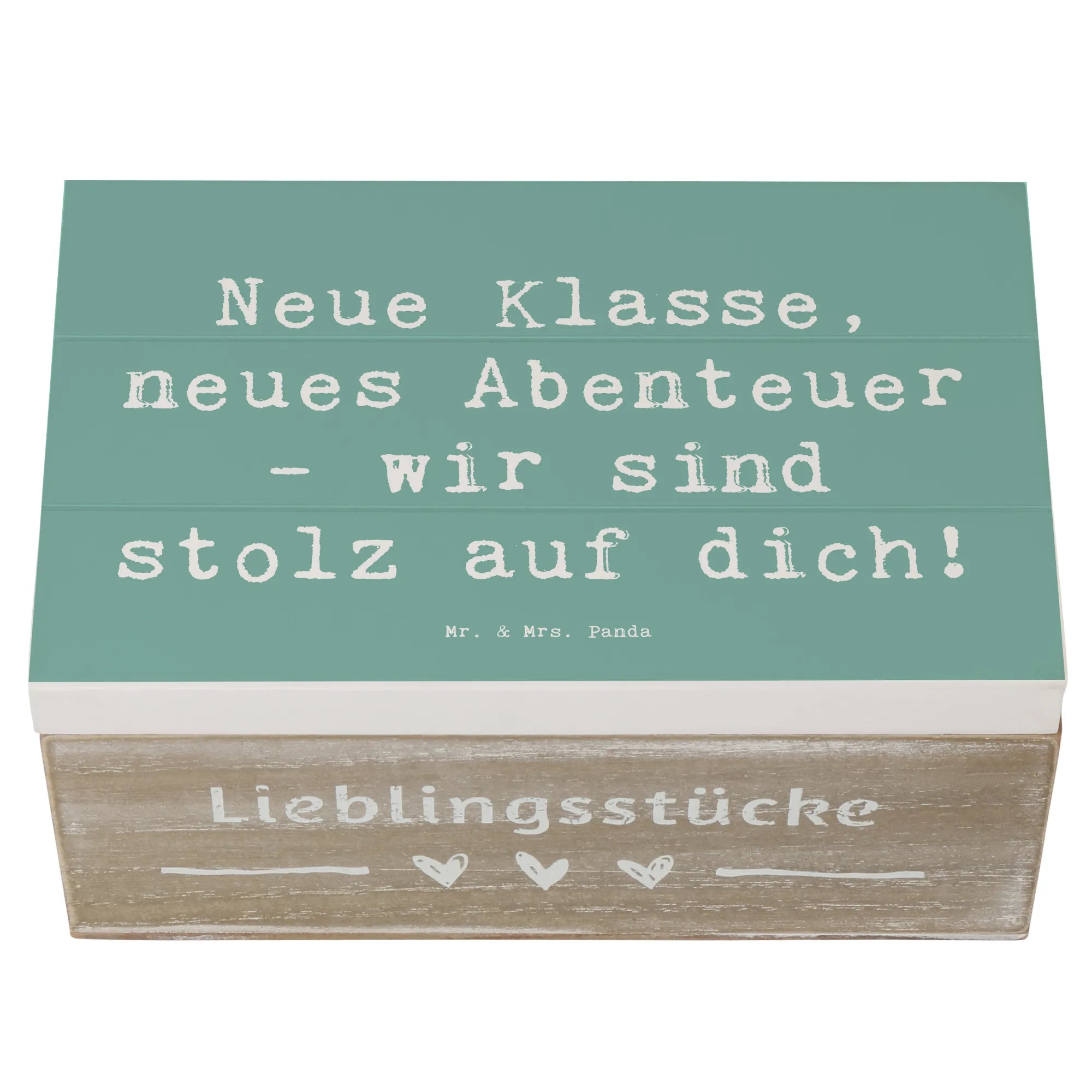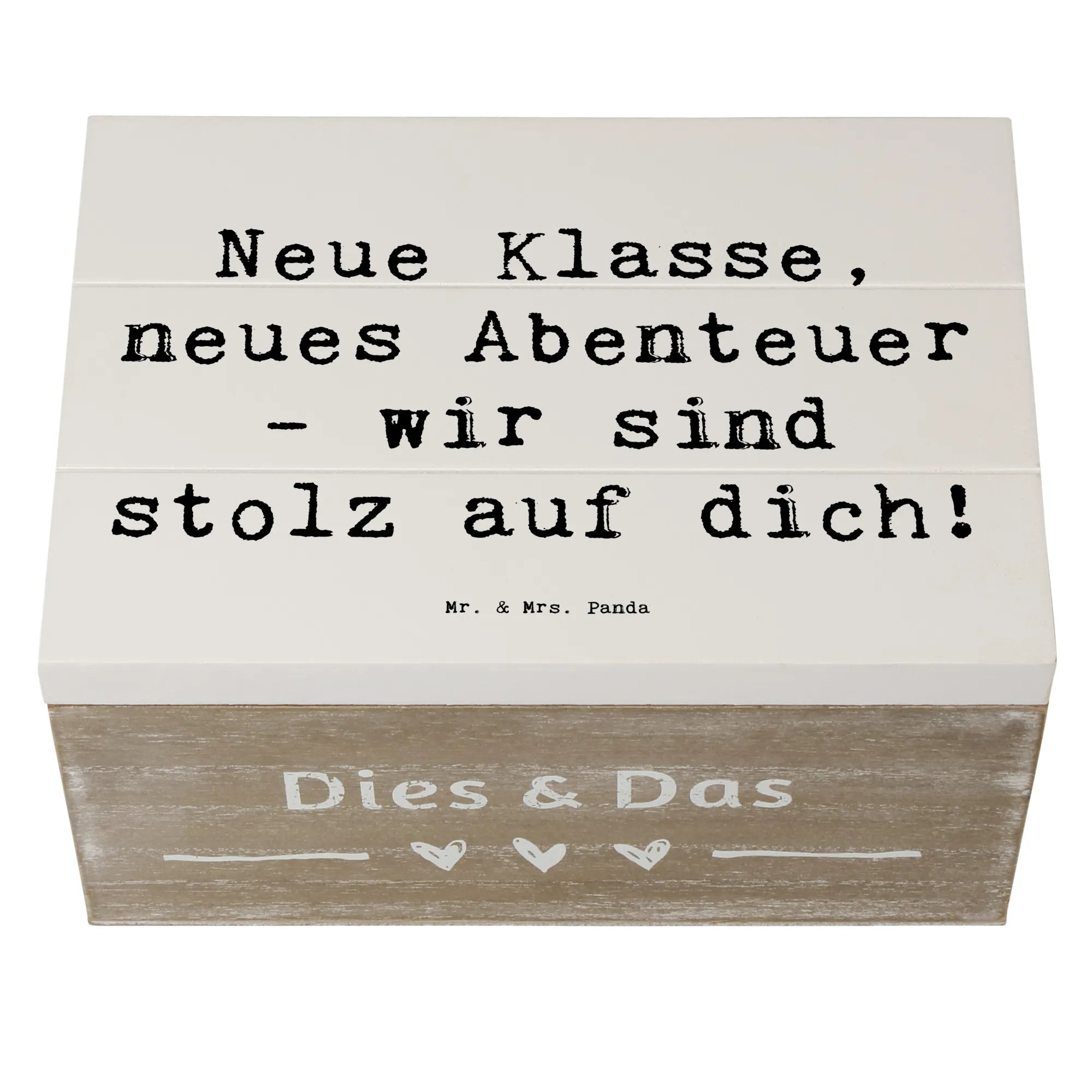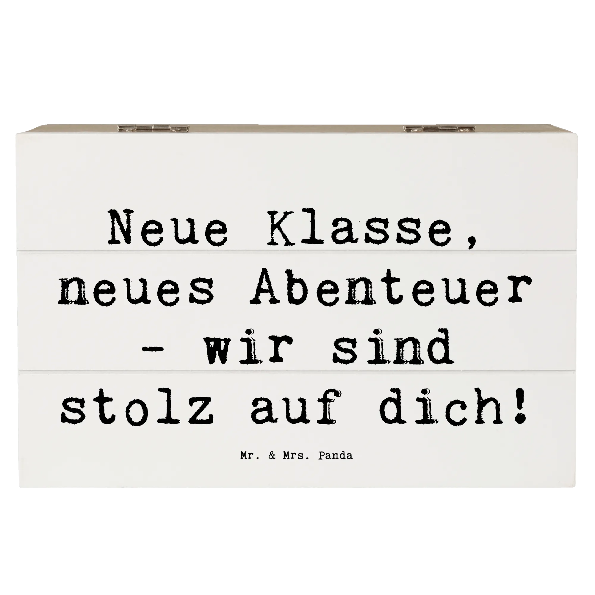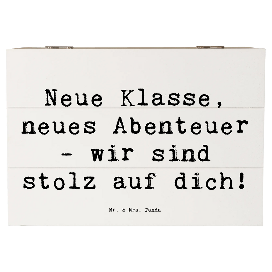 Die wunderschöne Holzkiste von Mr. & Mrs. Panda ist das perfekte Geschenk für den ersten Schultag in einer neuen Klasse! Mit dem liebevollen Motiv, das den Spruch 'Neue Klasse, neues Abenteuer - wir sind stolz auf dich!' trägt, wird diese Schatzkiste zu einem treuen Begleiter in der aufregenden Zeit des Schulbeginns.