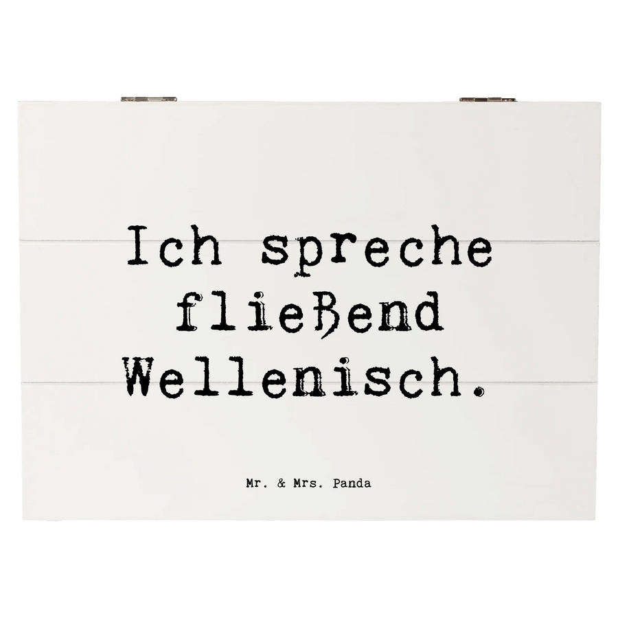 Die entzückenden Motive und Sprüche verleihen der Kiste einen einzigartigen Charme. Der Slogan "Ich spreche fließend Wellenisch." spricht vor allem Wassersport-Liebhaber an, die das Surfen tief im Herzen tragen.