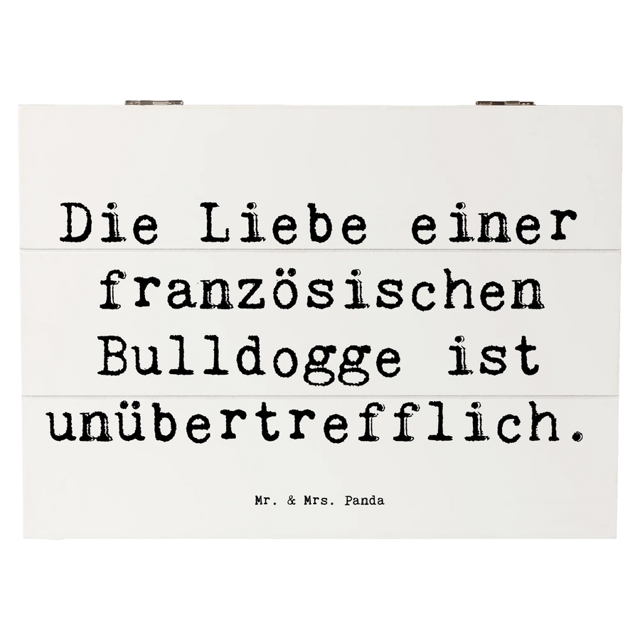 Entdecke die wunderschöne Holzkiste von Mr. & Mrs. Panda, die perfekt für alle Hundefans ist! Mit dem liebevollen Motiv einer Französischen Bulldogge und dem charmanten Slogan "Die Liebe einer französischen Bulldogge ist unübertrefflich" wird diese Kiste zum idealen Geschenk für jeden Hundeliebhaber.