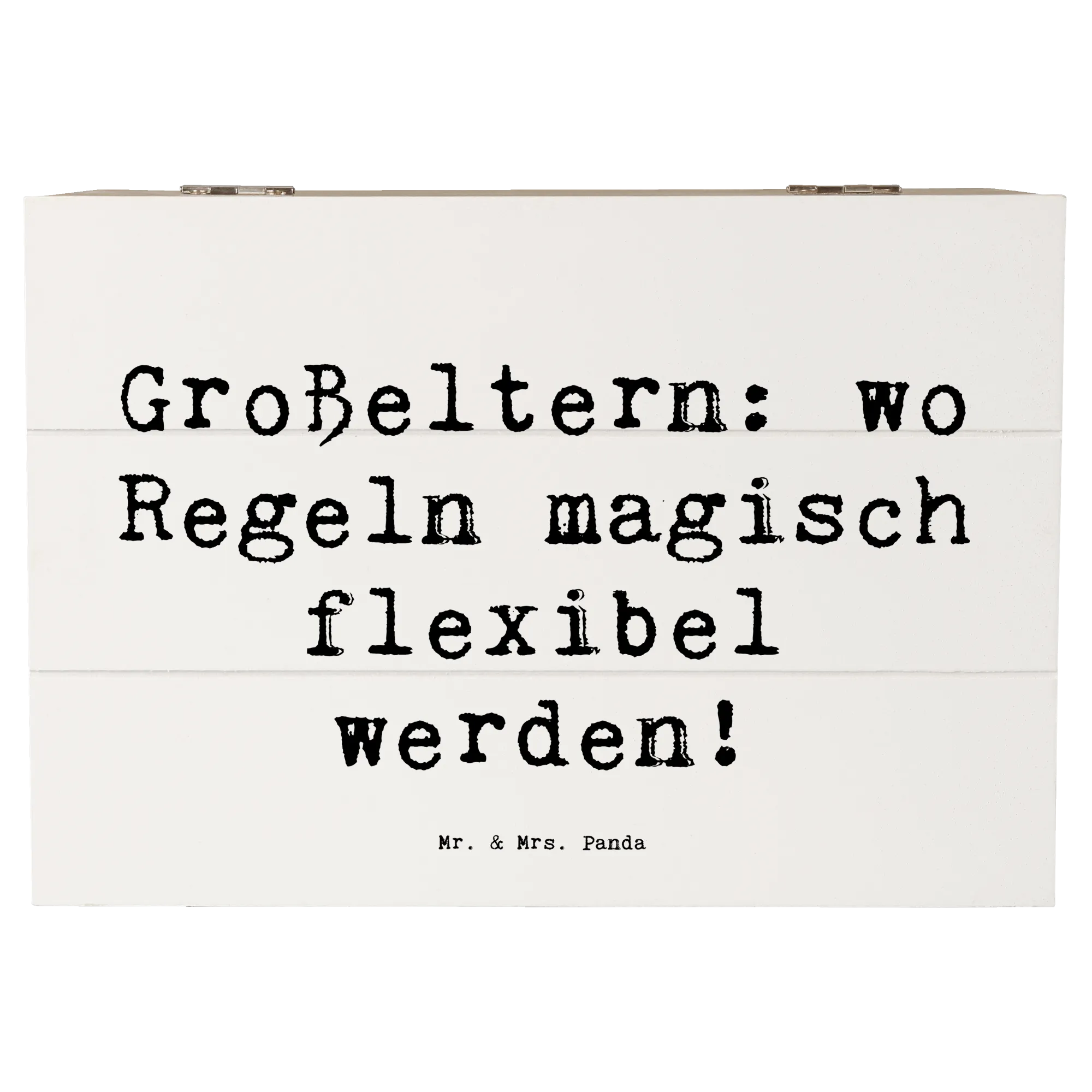 Diese wunderschöne Holzkiste von Mr. & Mrs. Panda ist der perfekte Begleiter für alle wunderbaren Erinnerungen, die Du so sehr schätzt. Mit einem liebevollen Motiv, das Großeltern gewidmet ist, wird diese Kiste zum besonderen Aufbewahrungsort für wertvolle Schätze und besondere Momente in Deinem Familienleben. Sie eignet sich hervorragend als Erinnerungskiste, um Fotos, kleine Andenken oder die schönsten Erlebnisse mit Deinen Enkelkindern aufbewahren zu können. Die Aussage "Großeltern: wo Regeln magisch flexibel werden!" bringt die besondere Beziehung zwischen Großeltern und Enkeln wunderbar auf den Punkt und zaubert jedem ein Lächeln ins Gesicht.