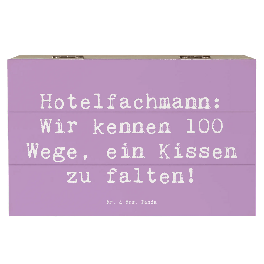 Die Holzkiste Hotelfachmann von Mr. & Mrs. Panda ist der perfekte Begleiter für alle Hotelfachleute und die, die es werden wollen! Mit dem charmanten Spruch "Hotelfachmann: Wir kennen 100 Wege, ein Kissen zu falten!" wird diese Kiste zum individuellen Aufbewahrungsort für Erinnerungen, kleine Schätze und besondere Andenken.