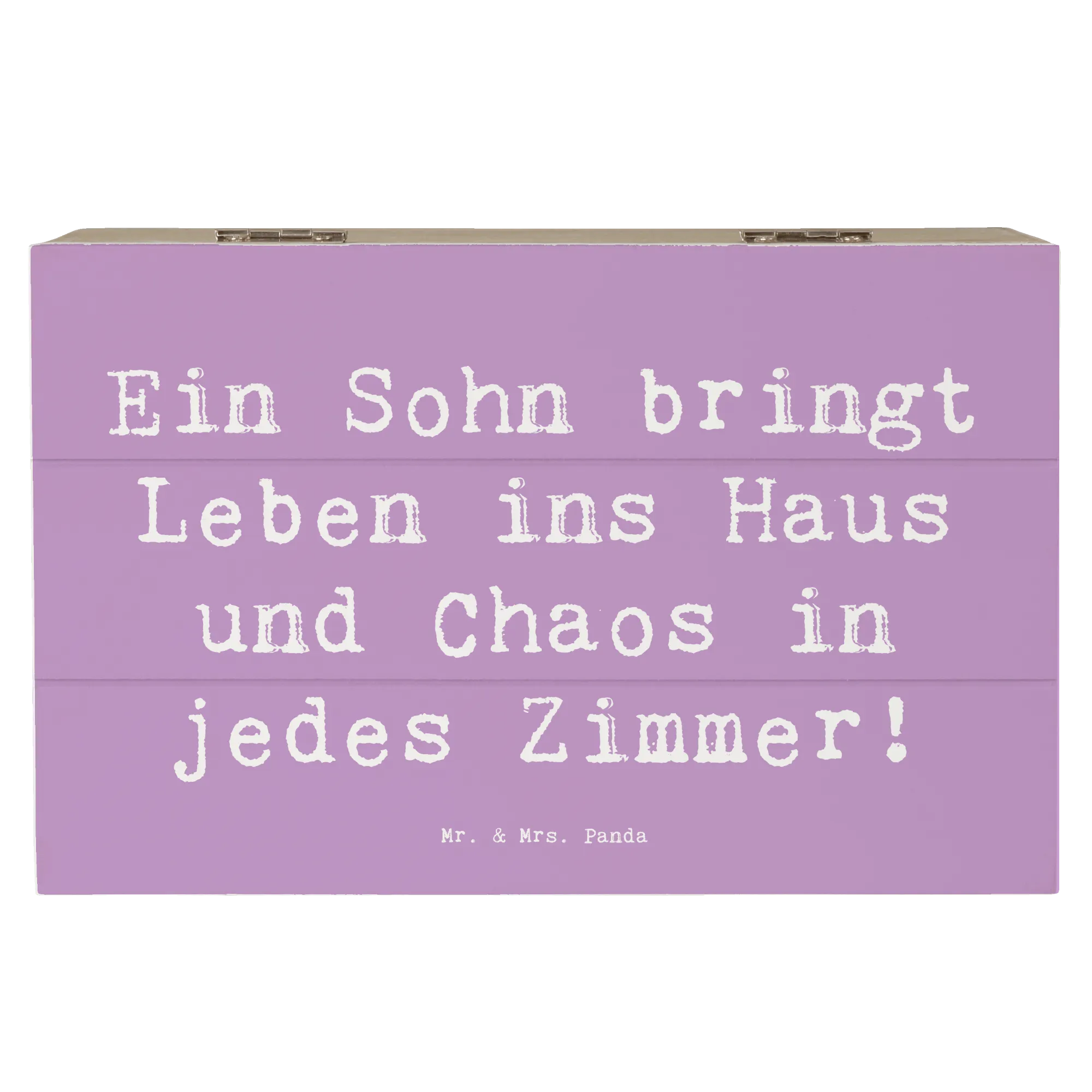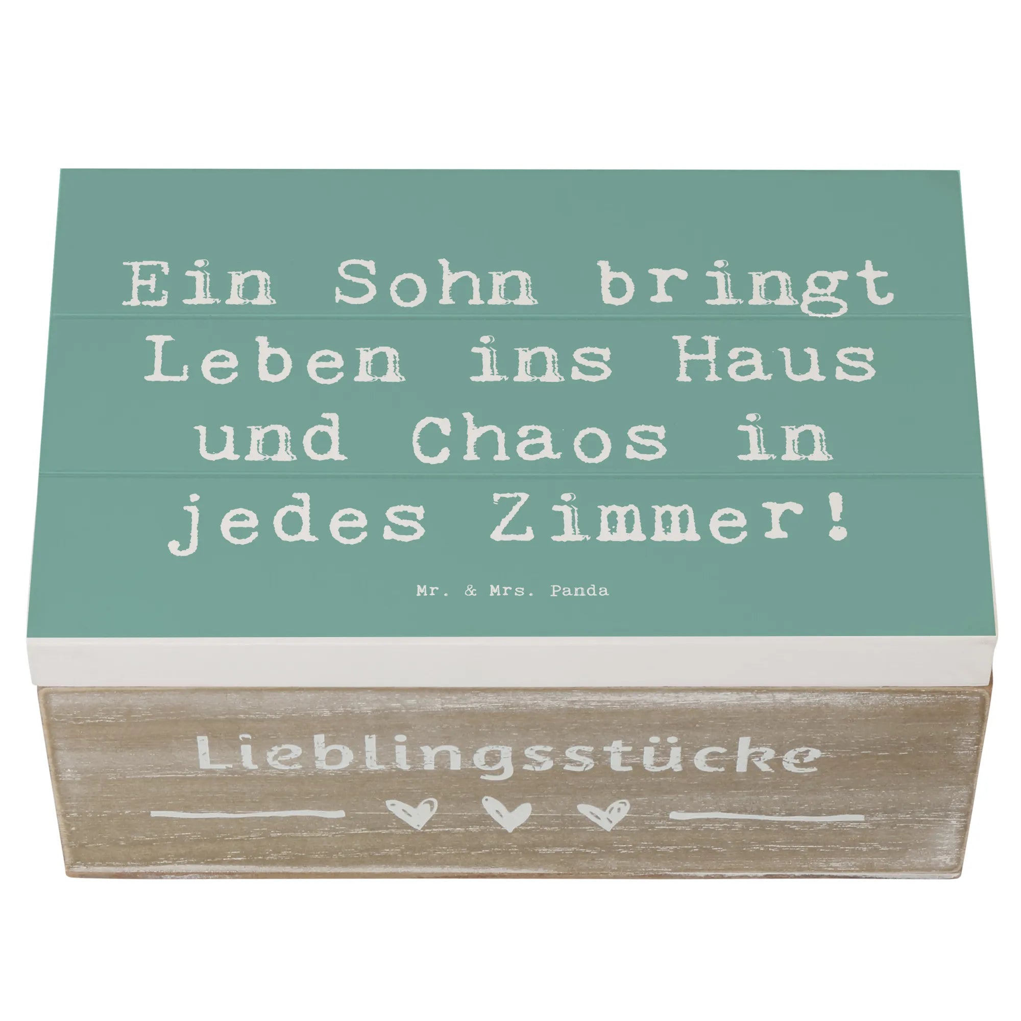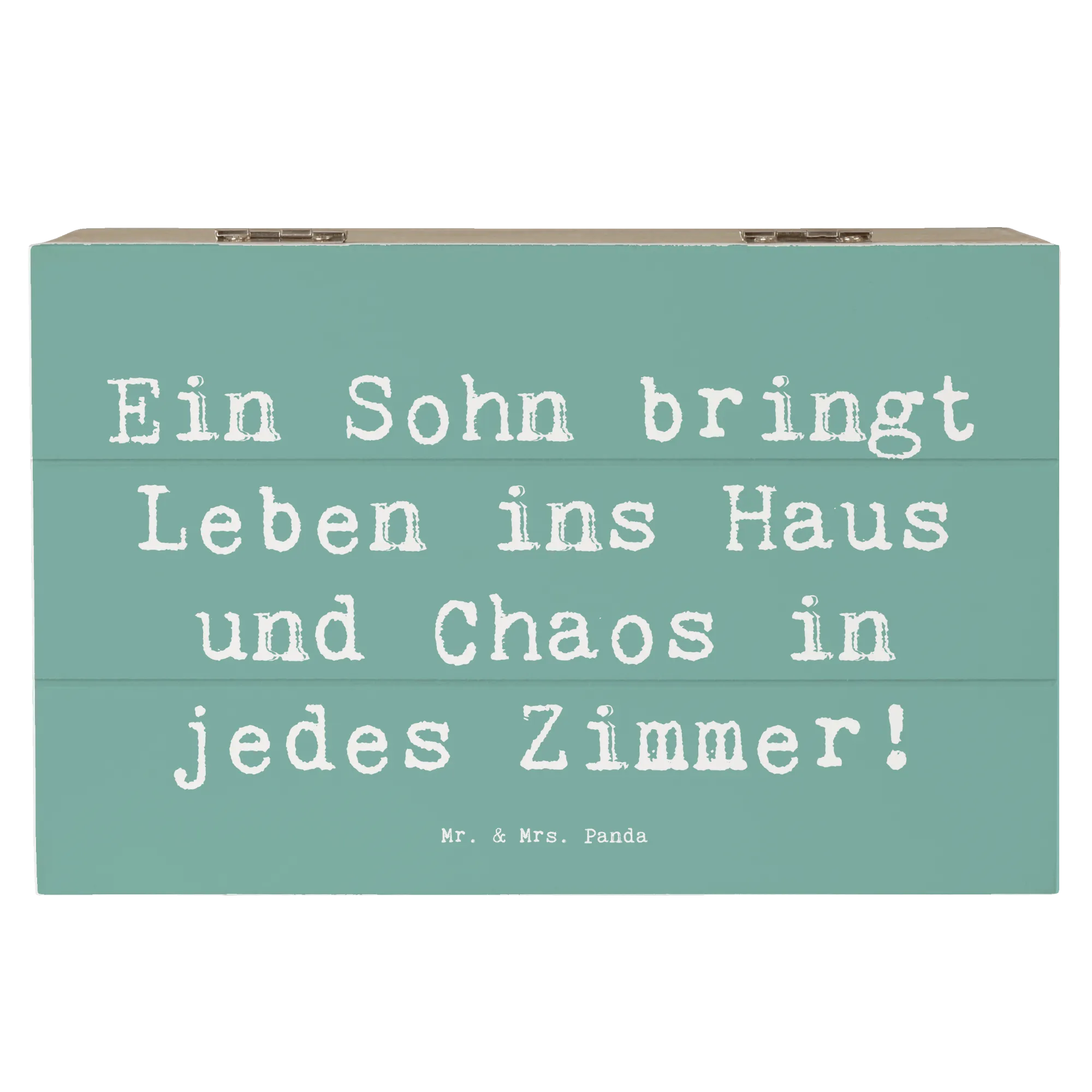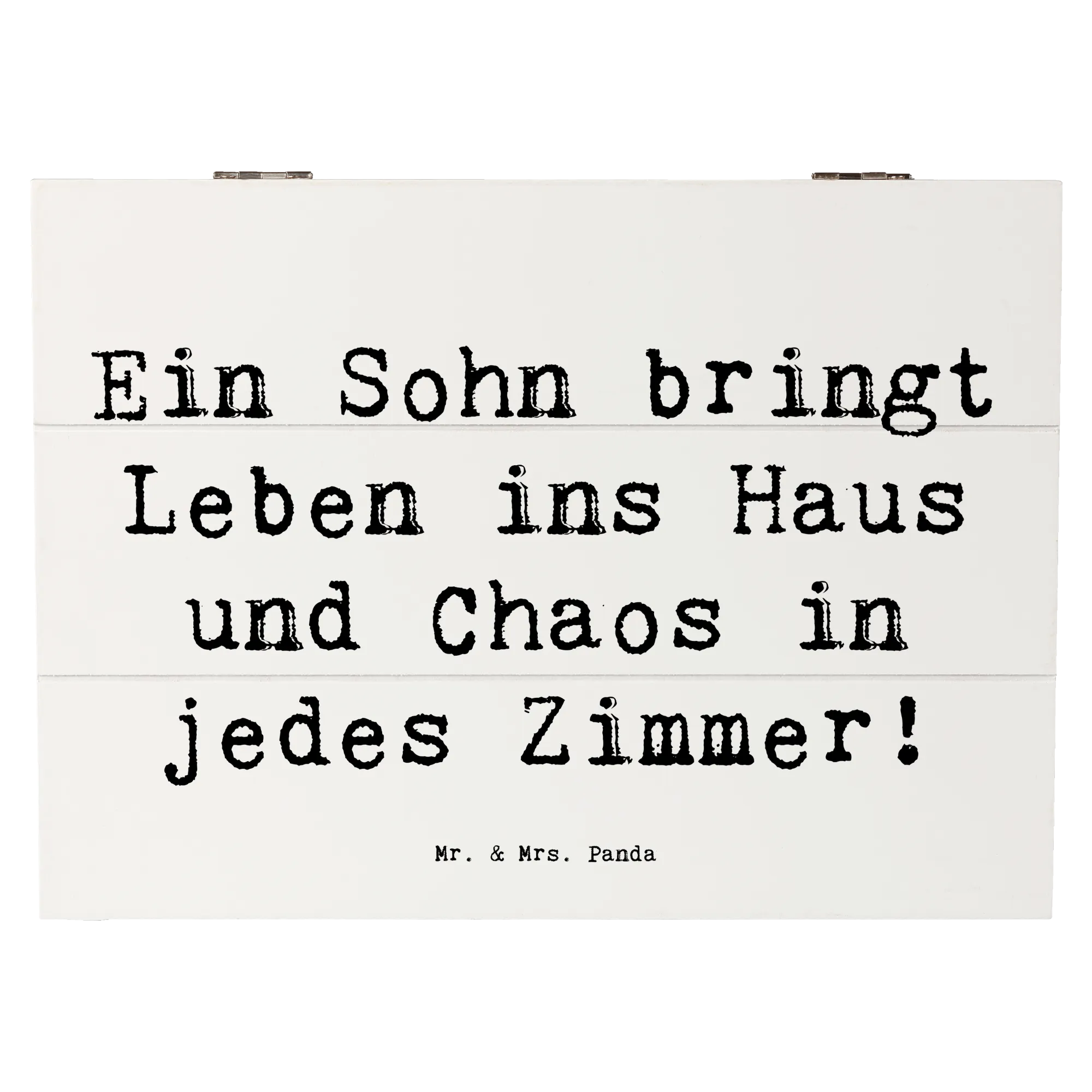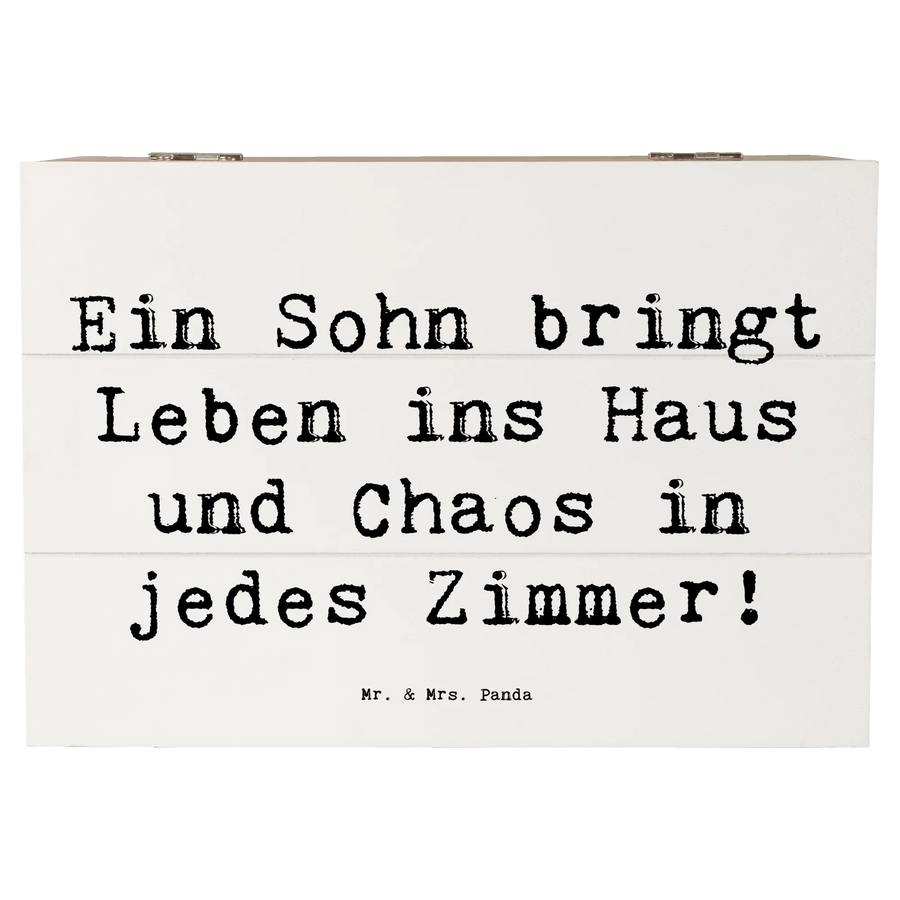Die wunderschöne Holzkiste von Mr. & Mrs. Panda ist der perfekte Aufbewahrungsort für all die besonderen Schätze, die dein Herz höher schlagen lassen. Diese tolle Truhe ist mit einem liebevollen Spruch verziert: 'Ein Sohn bringt Leben ins Haus und Chaos in jedes Zimmer!', der nicht nur humorvoll, sondern auch berührend ist.