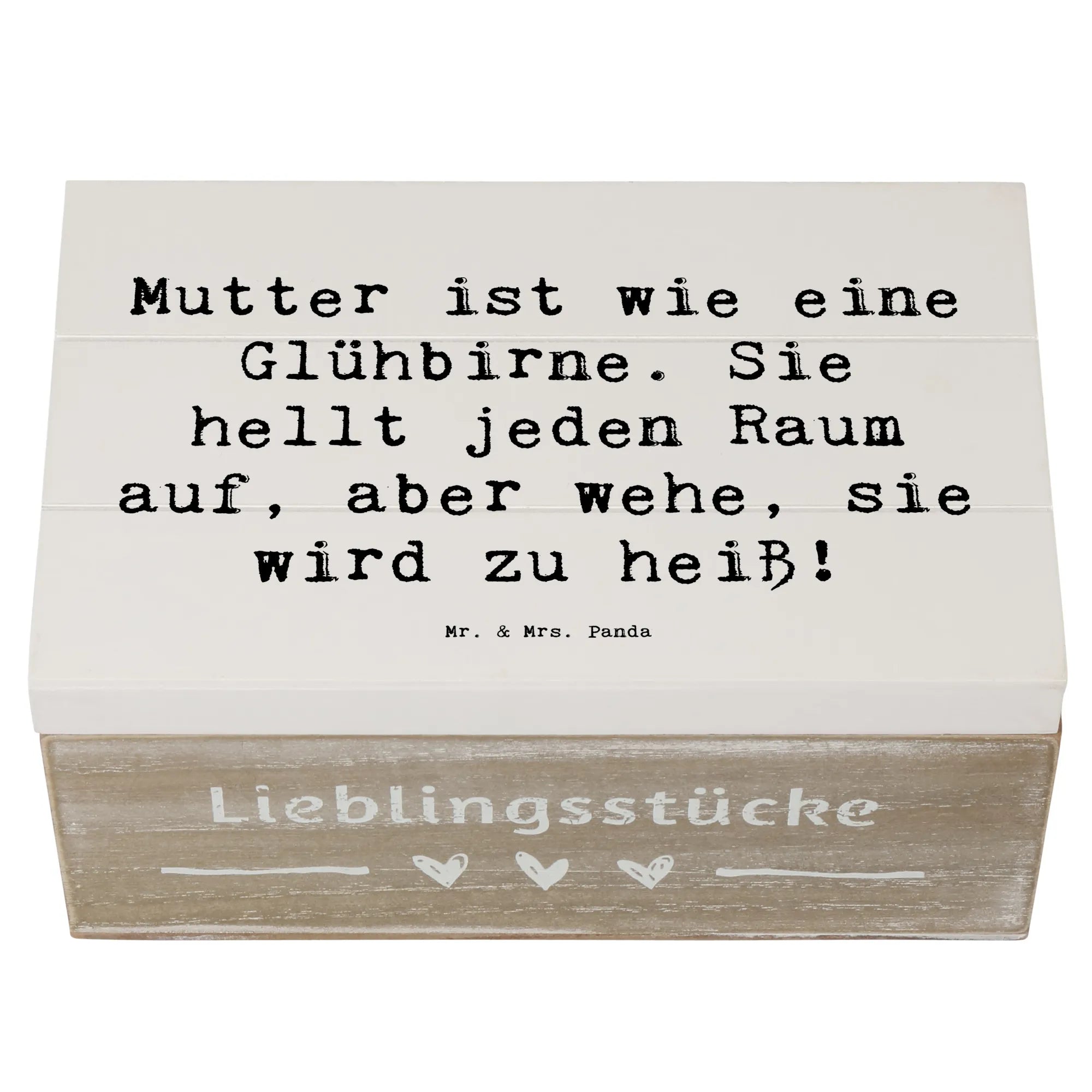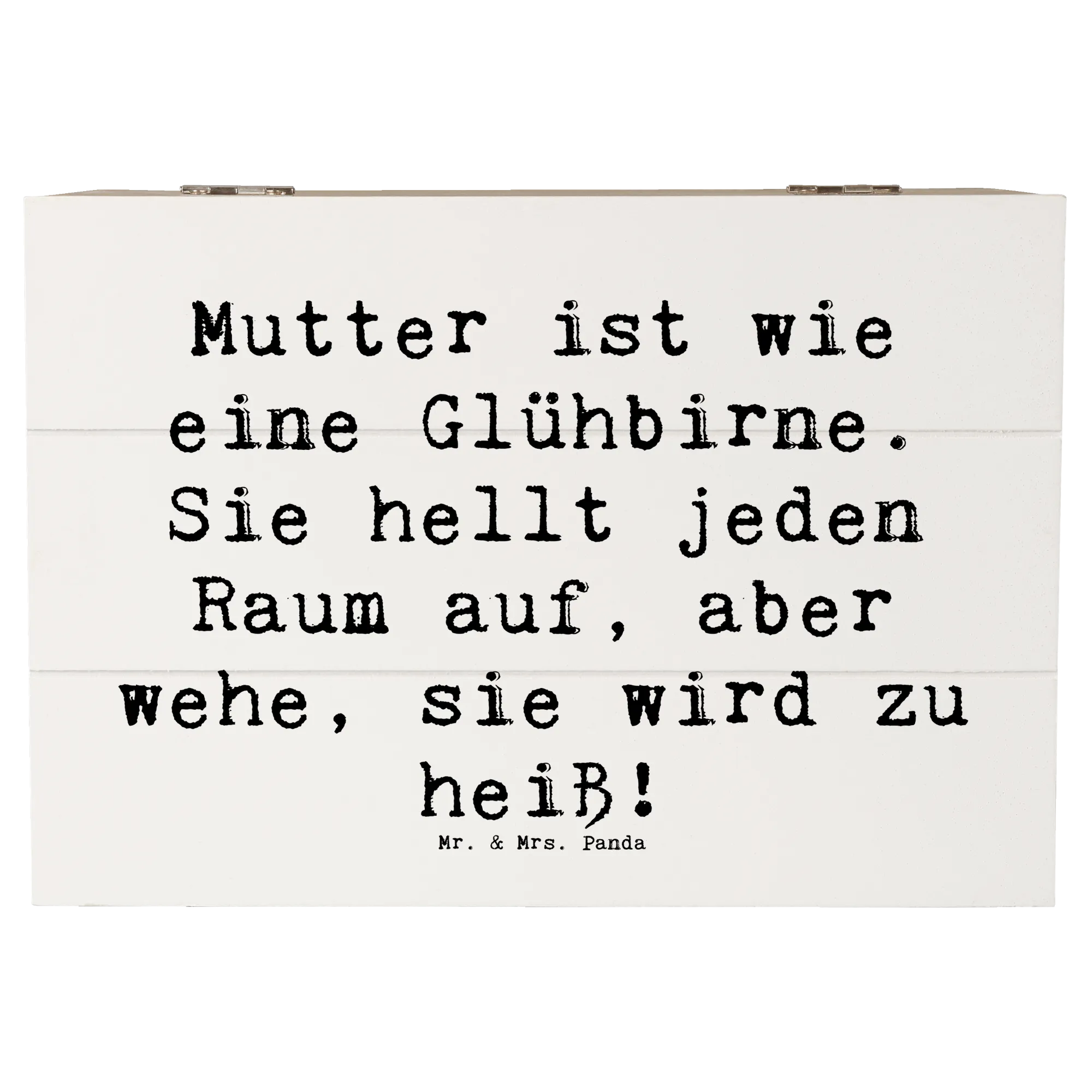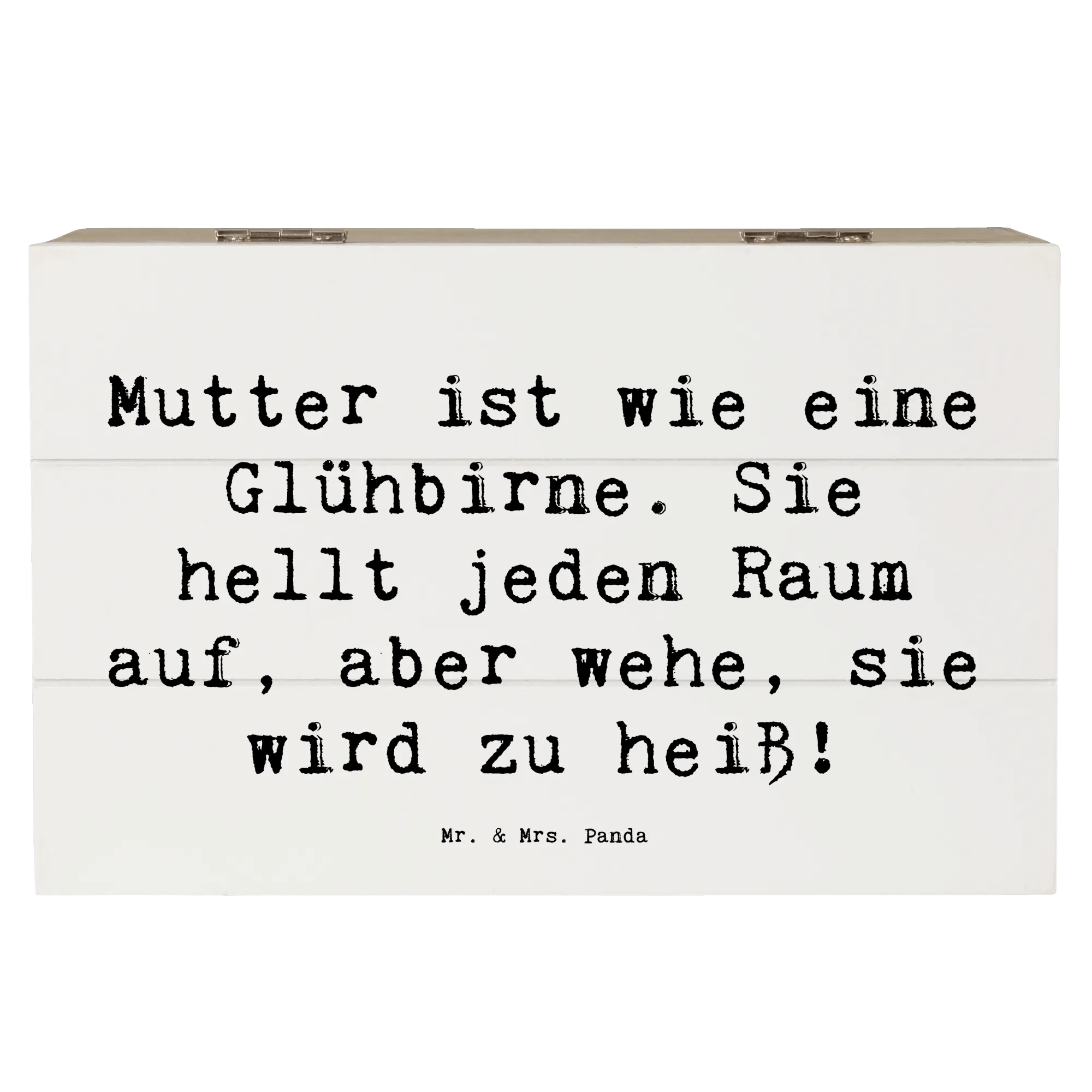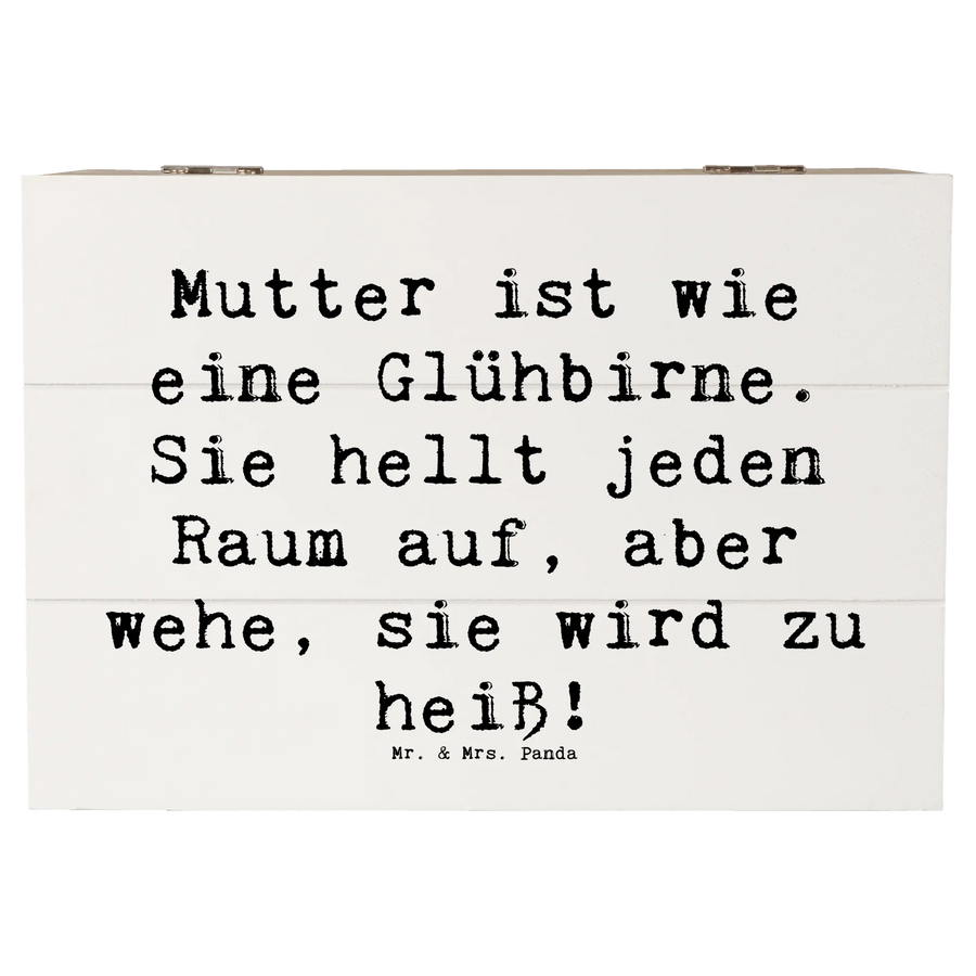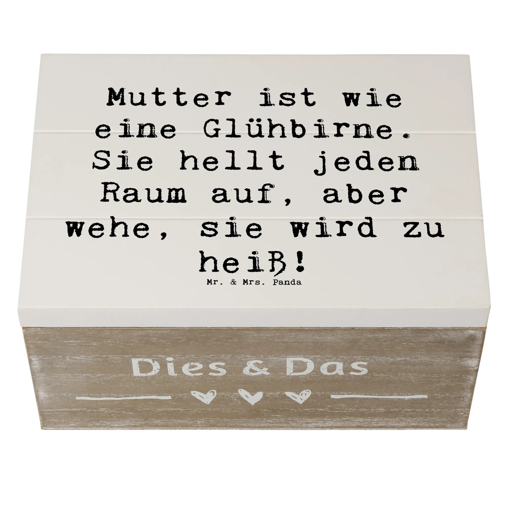 Ob zum Muttertag, Geburtstag oder einfach als Dankeschön für alles, was sie für dich getan hat - diese Holzkiste ist ein absolutes Must-Have. Mit dem Motive 'Mutter' wird die unendliche Liebe und Verbundenheit zwischen Mutter und Kind auf eine ganz besondere Art und Weise gefeiert. Der zauberhafte Spruch 'Mutter ist wie eine Glühbirne. Sie hellt jeden Raum auf, aber wehe, sie wird zu heiß!' sorgt zusätzlich für ein Lächeln!