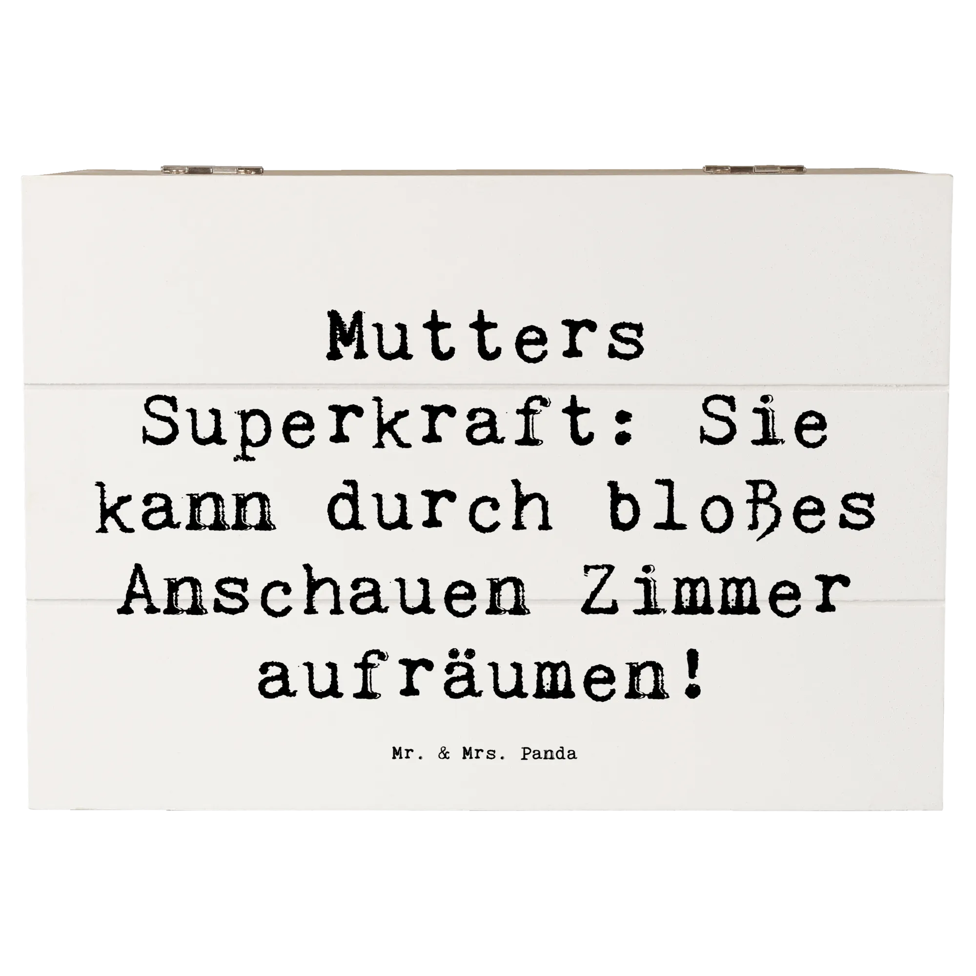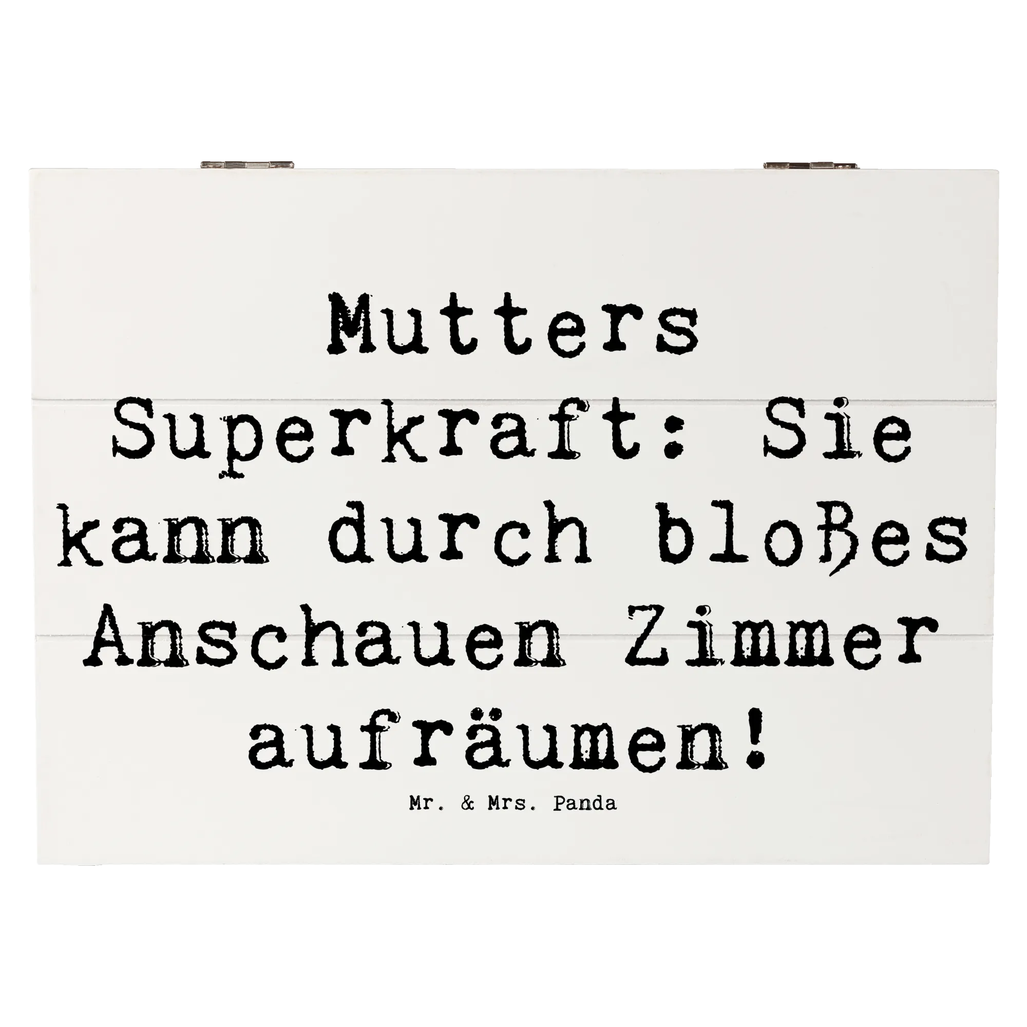 Aber nicht nur das – sie ist auch als stilvolle und nachhaltige Geschenkbox perfekt geeignet! Mütter sind die wahren Heldinnen, deren Superkraft es ist, selbst durch bloßes Anschauen der Zimmer Ordnung zu schaffen. Diese Kiste trägt das Motto: "Mutters Superkraft: Sie kann durch bloßes Anschauen Zimmer aufräumen!" und wird mit viel Liebe von Mrs. Panda designt.