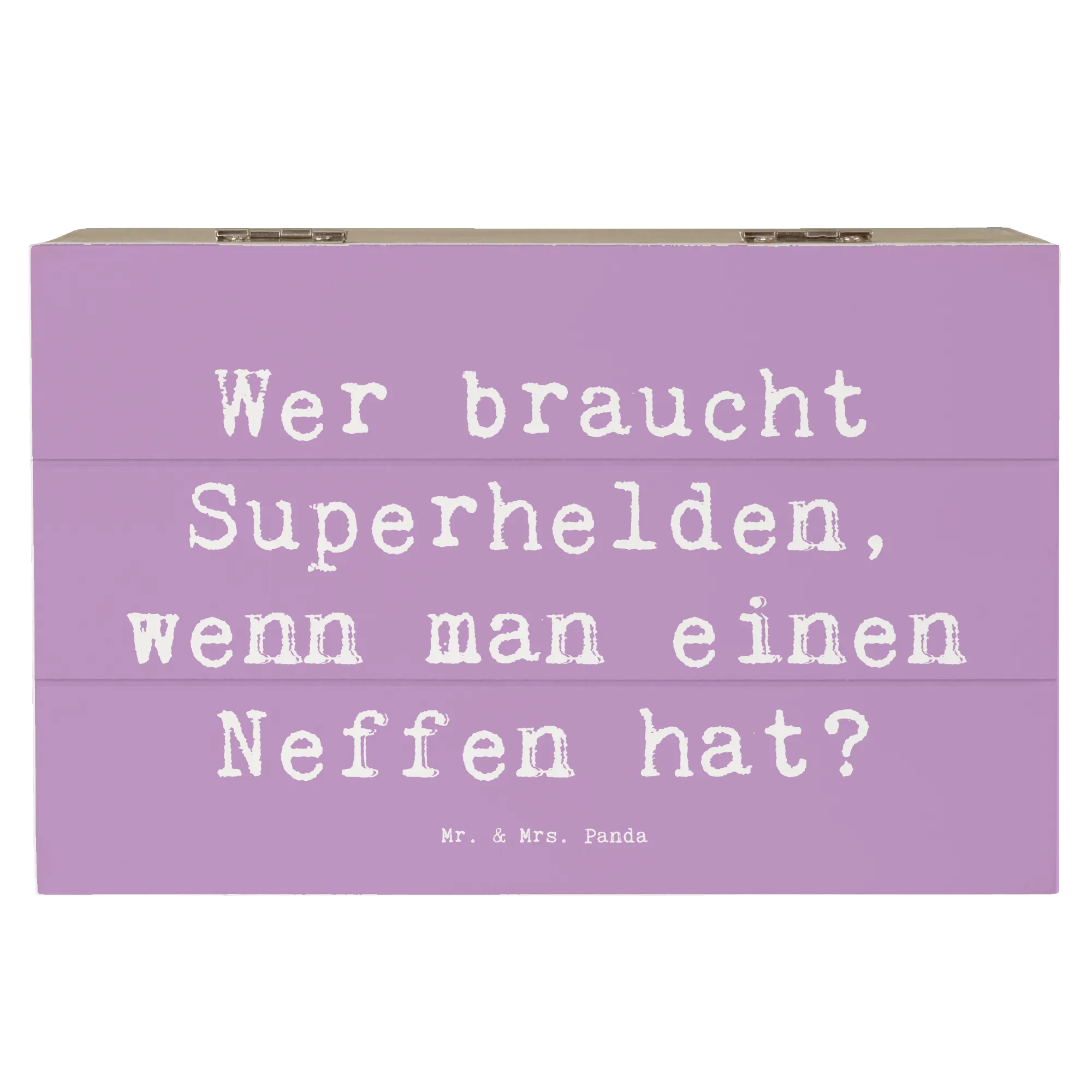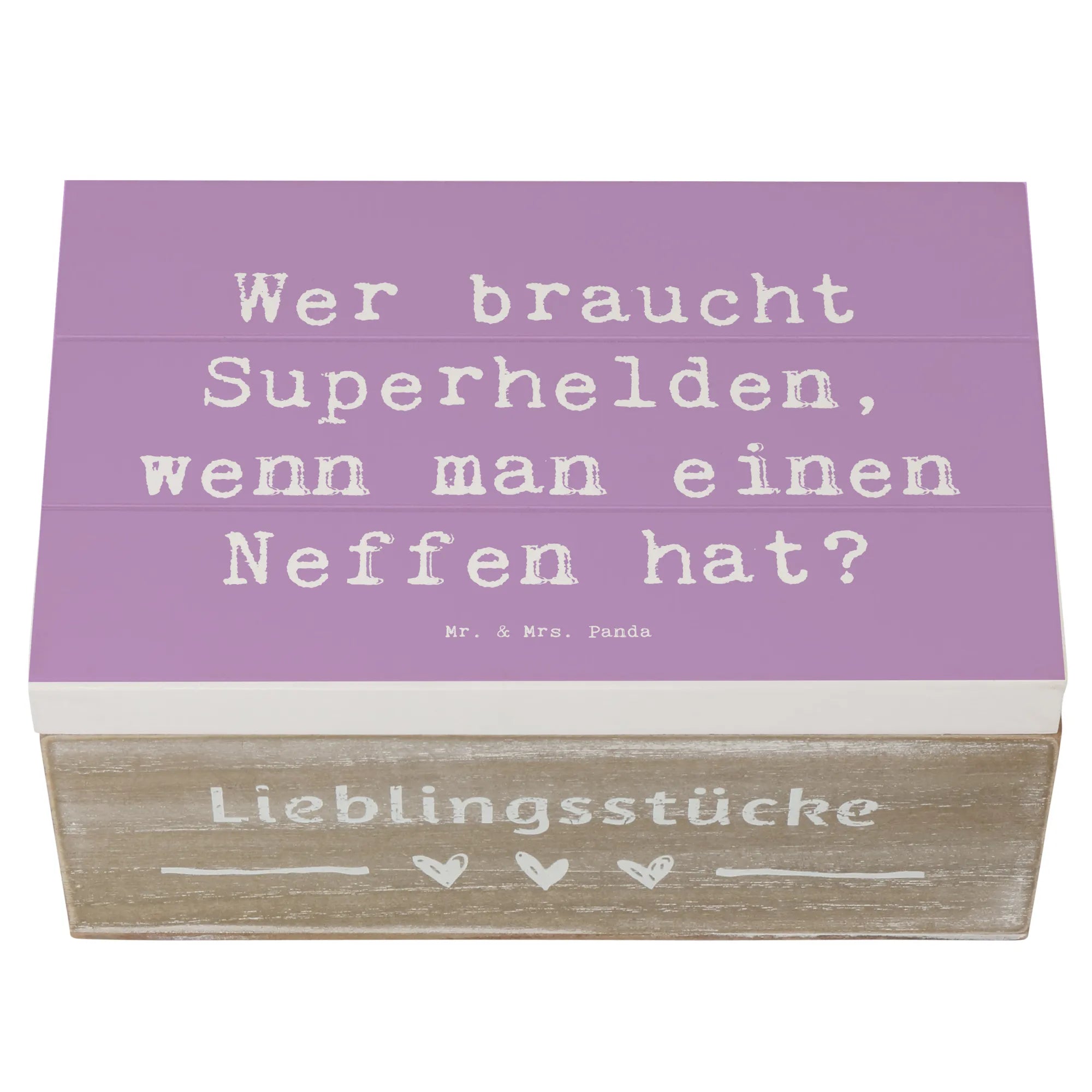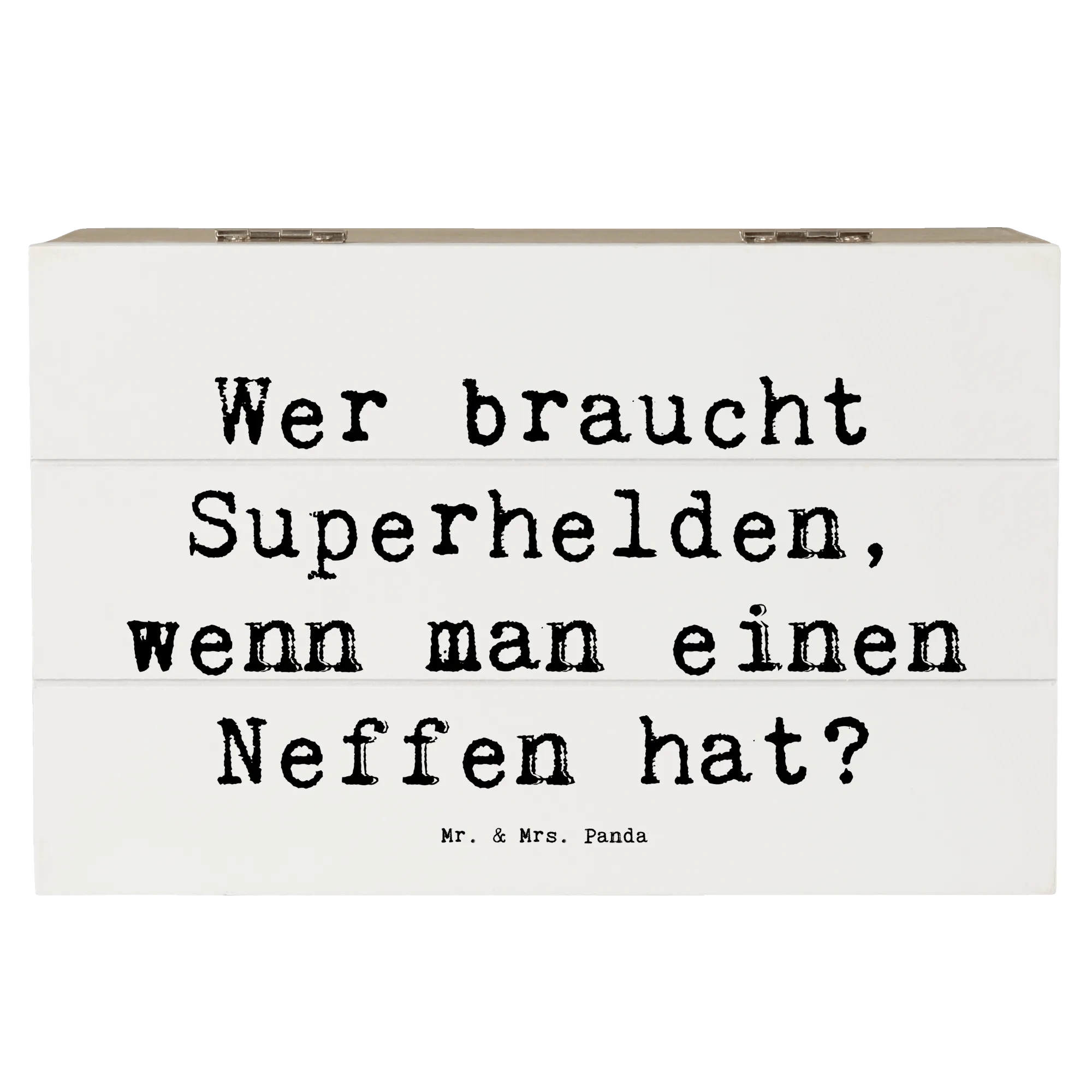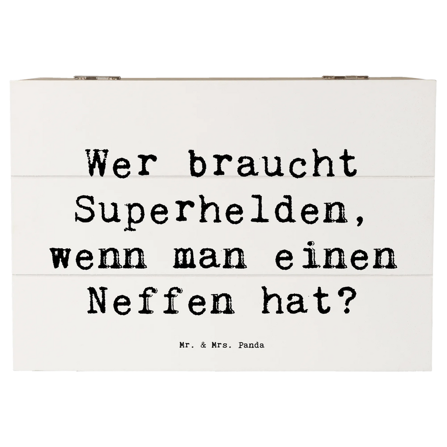 Jedes Design von Mr. & Mrs. Panda ist mit viel Liebe und kreativer Hand gezeichnet, und die Holzkiste ist mit einem herzlichen Spruch bedruckt, der perfekt für Neffen geeignet ist: 'Wer braucht Superhelden, wenn man einen Neffen hat?' Damit stellt diese Kiste eine wunderbare Möglichkeit dar, die besondere Bindung zwischen Onkel oder Tante und Neffe zu stärken. Sie eignet sich hervorragend als nachhaltige Geschenkbox, die wiederverwendet werden kann und zu jedem Anlass Freude bereitet.