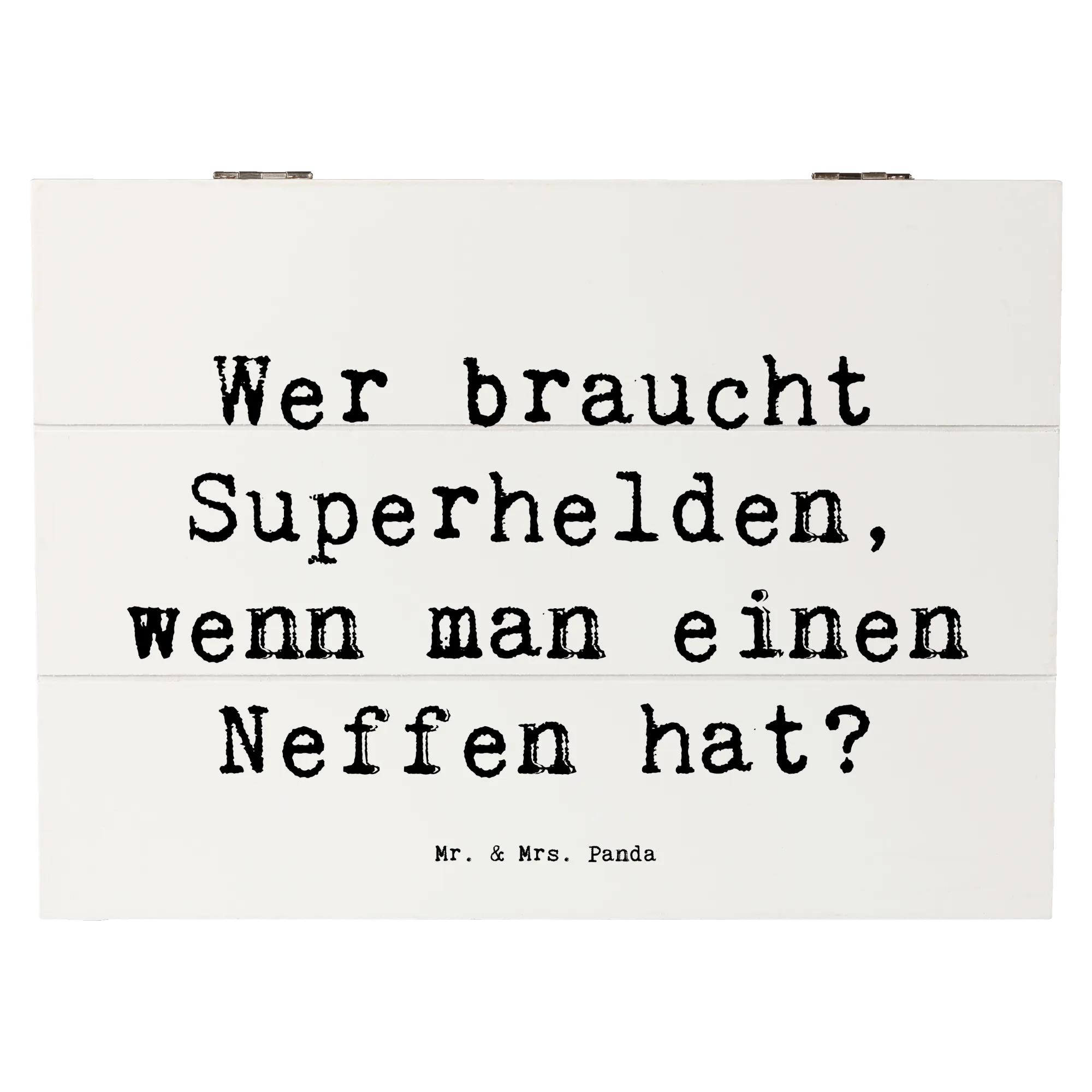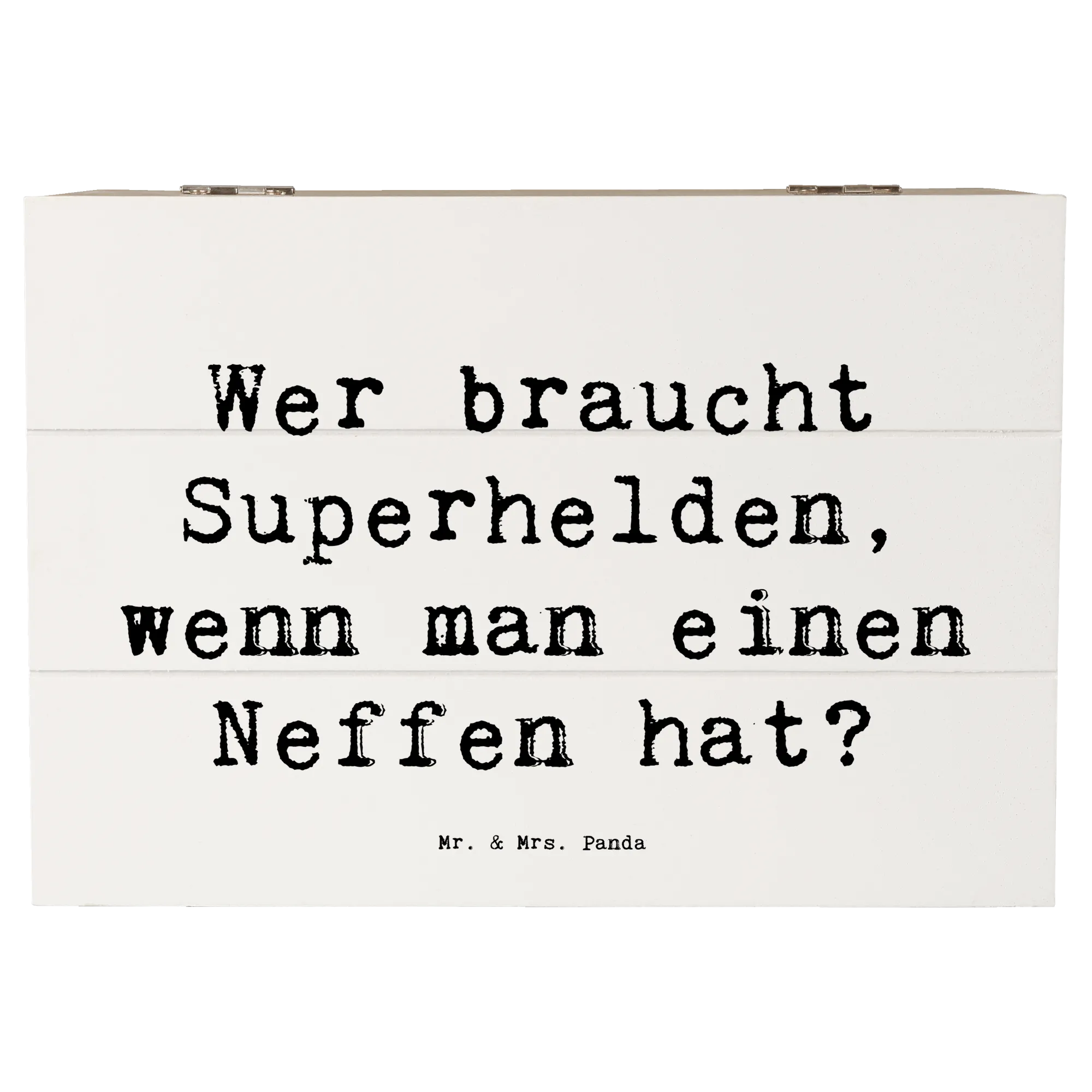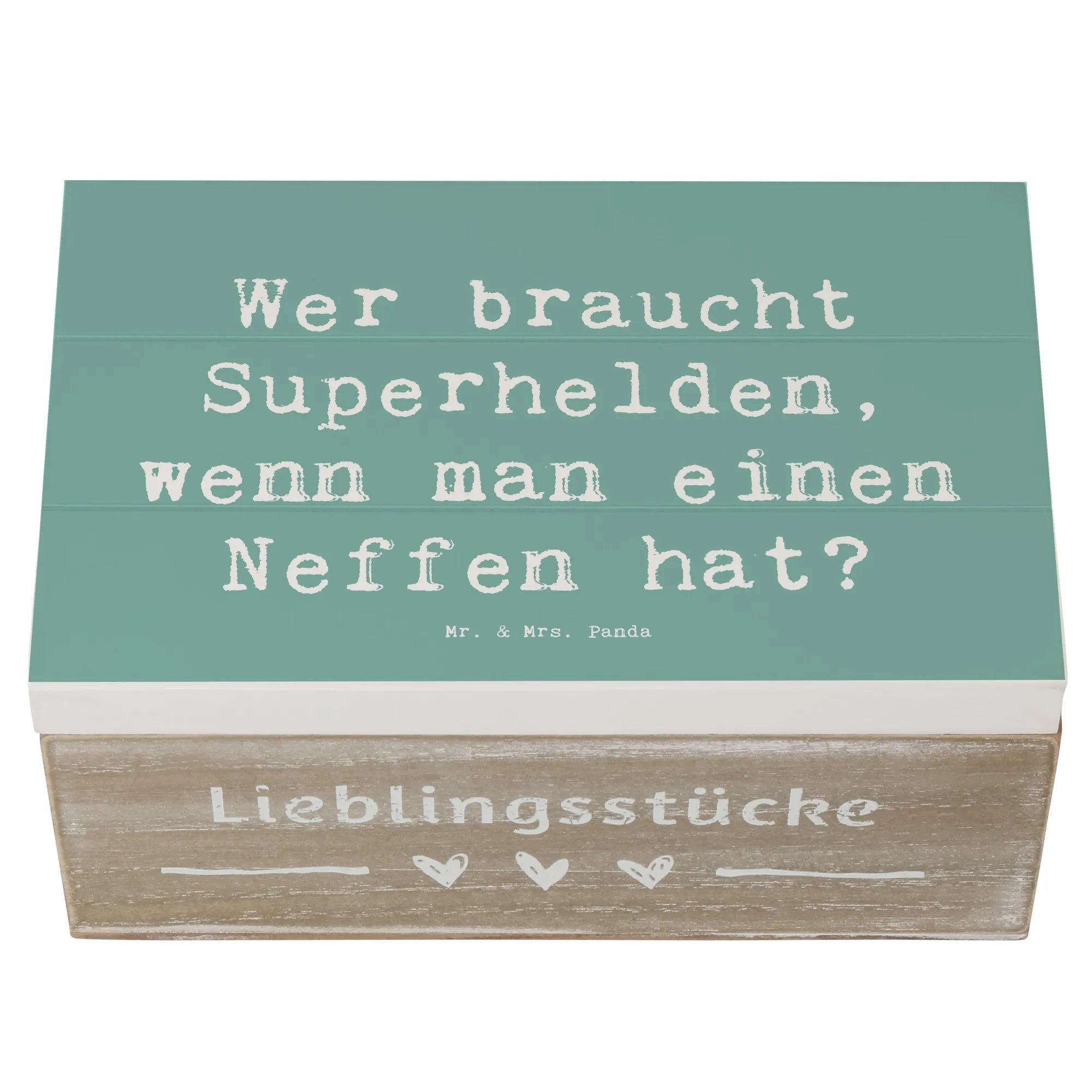Jedes Design von Mr. & Mrs. Panda ist mit viel Liebe und kreativer Hand gezeichnet, und die Holzkiste ist mit einem herzlichen Spruch bedruckt, der perfekt für Neffen geeignet ist: 'Wer braucht Superhelden, wenn man einen Neffen hat?' Damit stellt diese Kiste eine wunderbare Möglichkeit dar, die besondere Bindung zwischen Onkel oder Tante und Neffe zu stärken. Sie eignet sich hervorragend als nachhaltige Geschenkbox, die wiederverwendet werden kann und zu jedem Anlass Freude bereitet.